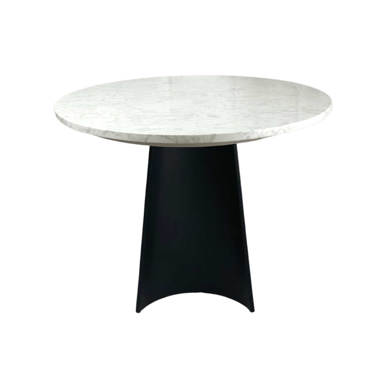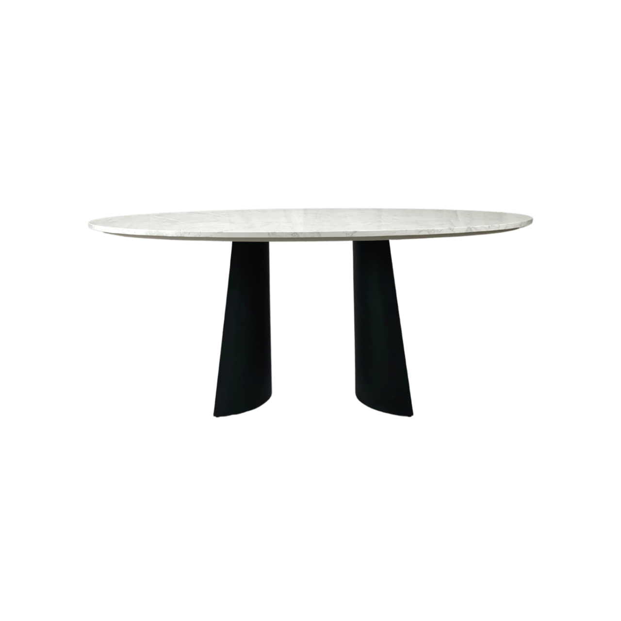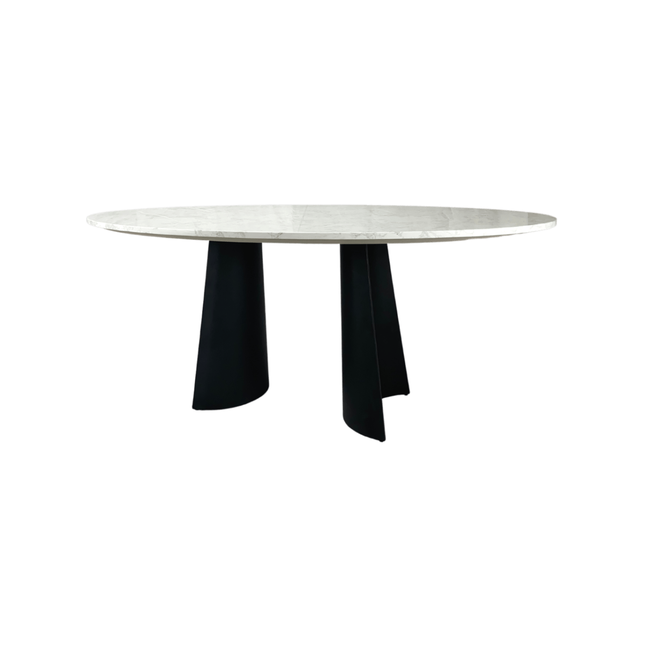 With its oval shape and post-modern design, the Rosemary Oval Dining Table strikes an imposing silhouette. It is the quintessential focal point of any contemporary dining space, with its top made of artificial marble, which is stain-resistant and easy to clean. With ample space to fit 6 people comfortably, the top sits on black powder-coated metal legs, spaced apart to keep the table balanced. They are crescent-shaped and hollow, featuring small protector pads at the bottom to stop them from scratching the surface of the floor, as the table is quite large and hefty. The legs are screwed on an MDF board attached to the top. They contrast nicely with the marble colouration of the surface, creating a sophisticated look that is ideal for luxurious, minimalist interiors.