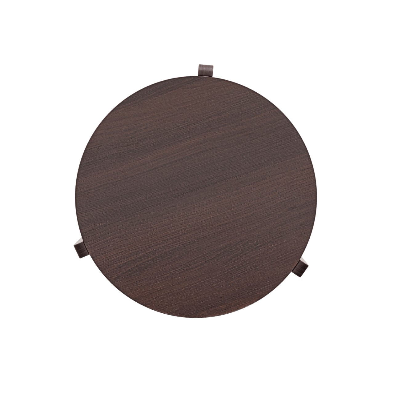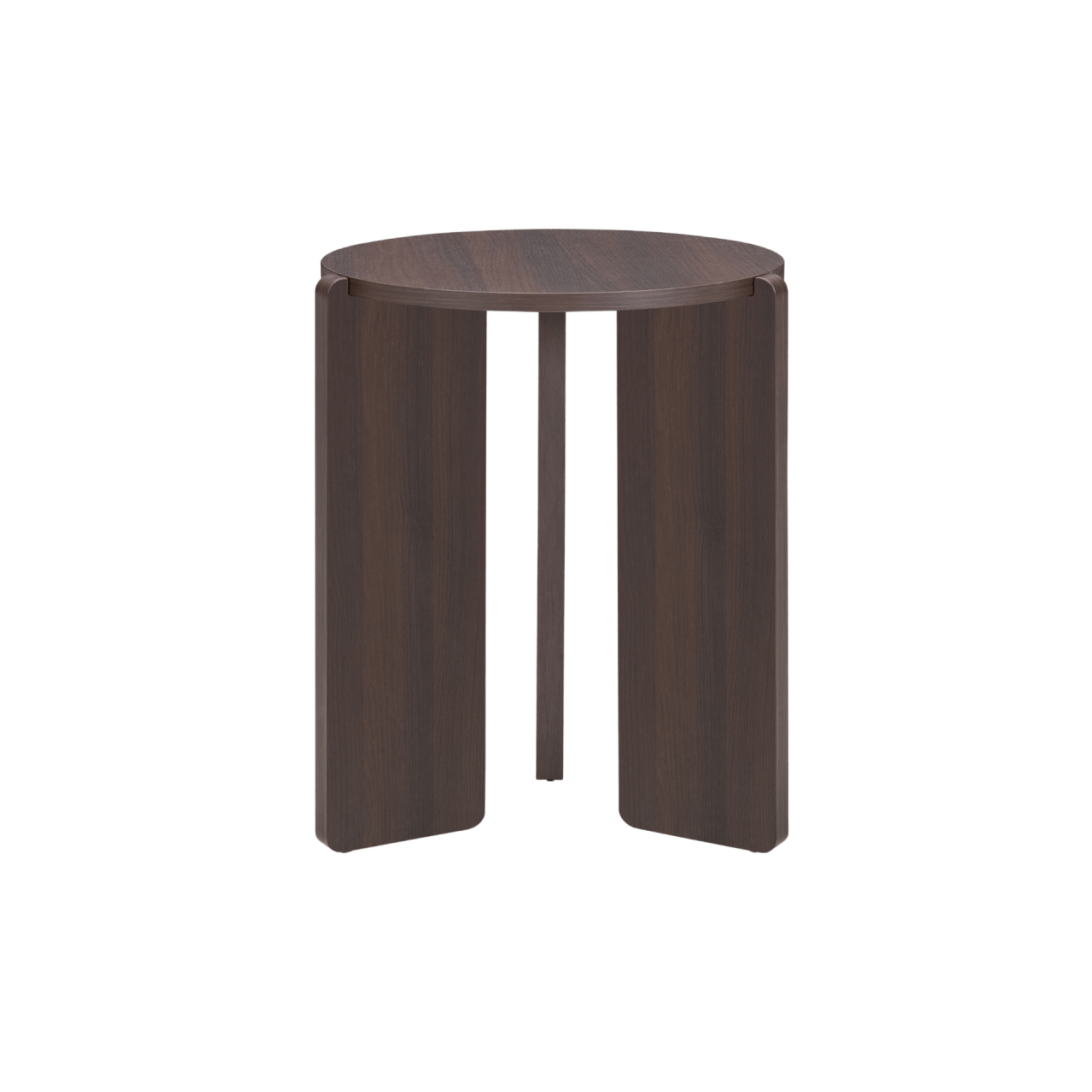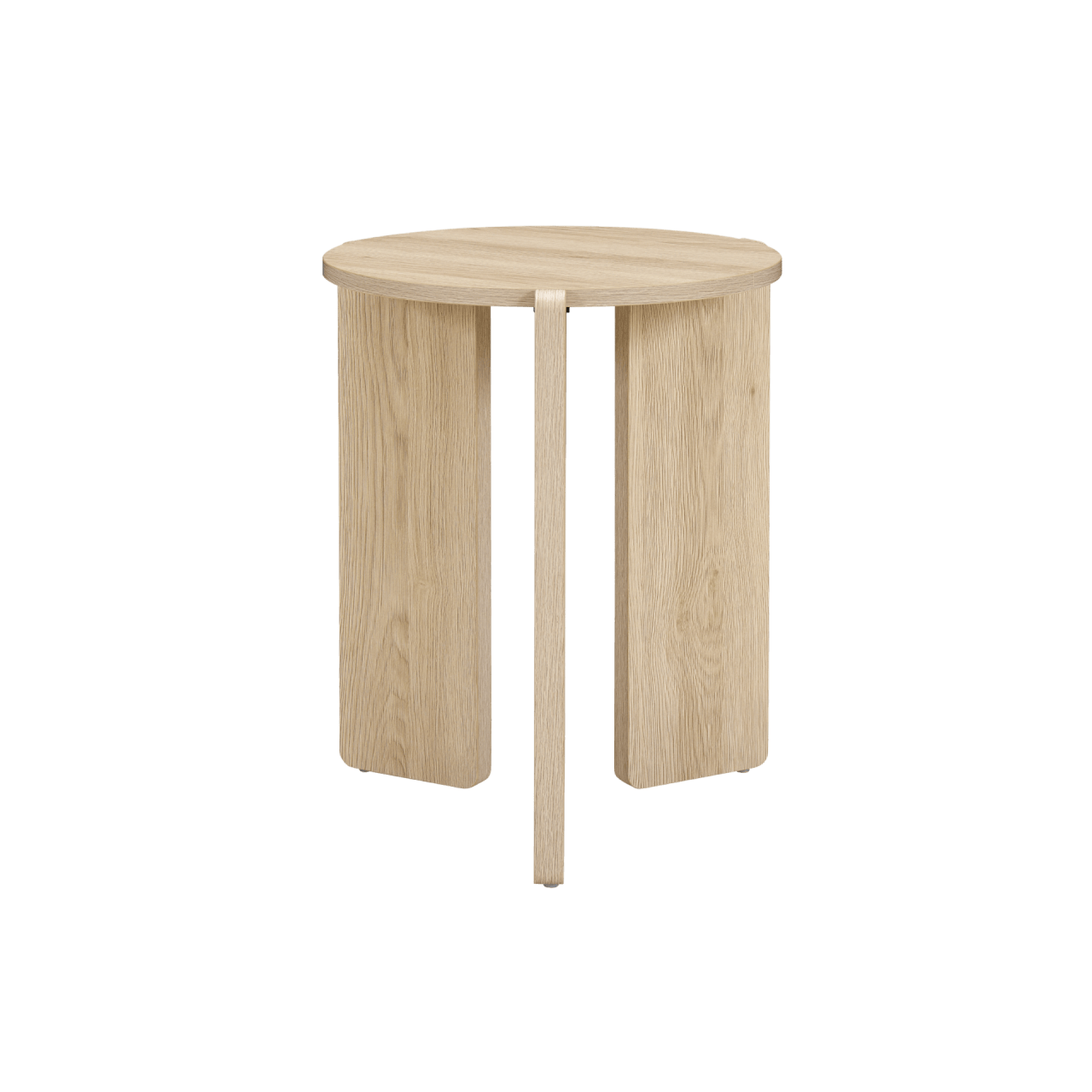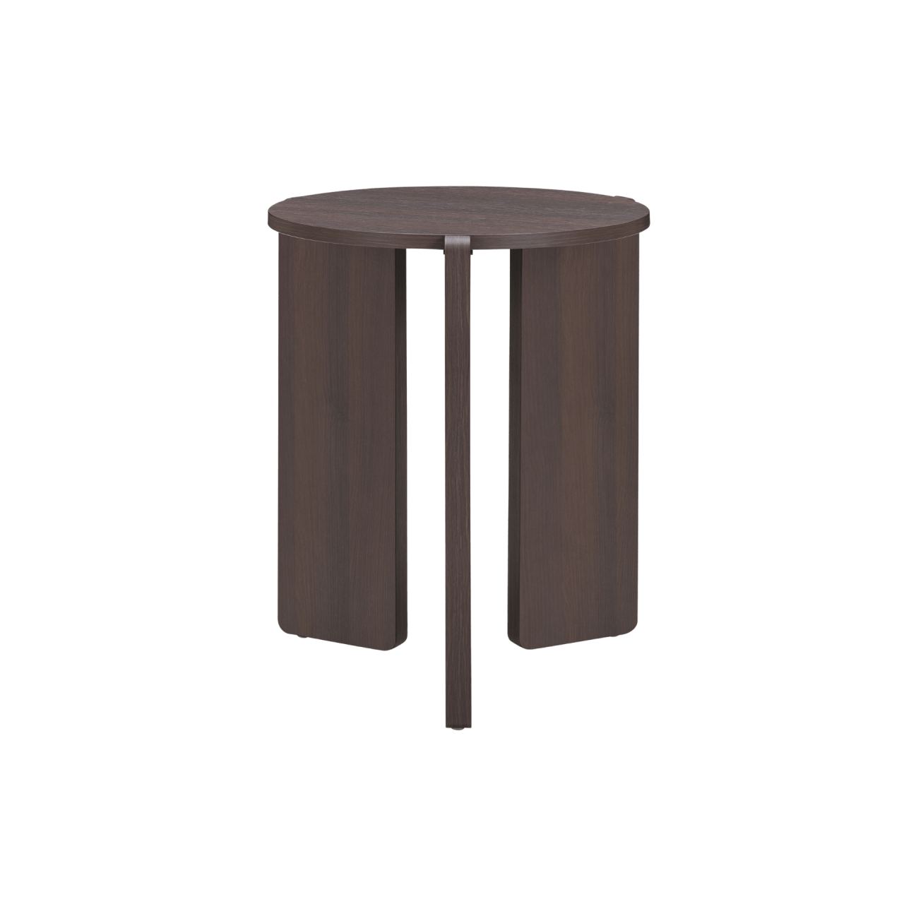 The Halo Side Table combines modern minimalism with symmetry and dynamic design. The top is circular and features a woodgrain finish. The three rectangular legs have rounded edges and protrude to overlap the top, creating a striking visual effect. Designed with durable materials, it is a sustainable and stylish addition to any interior.