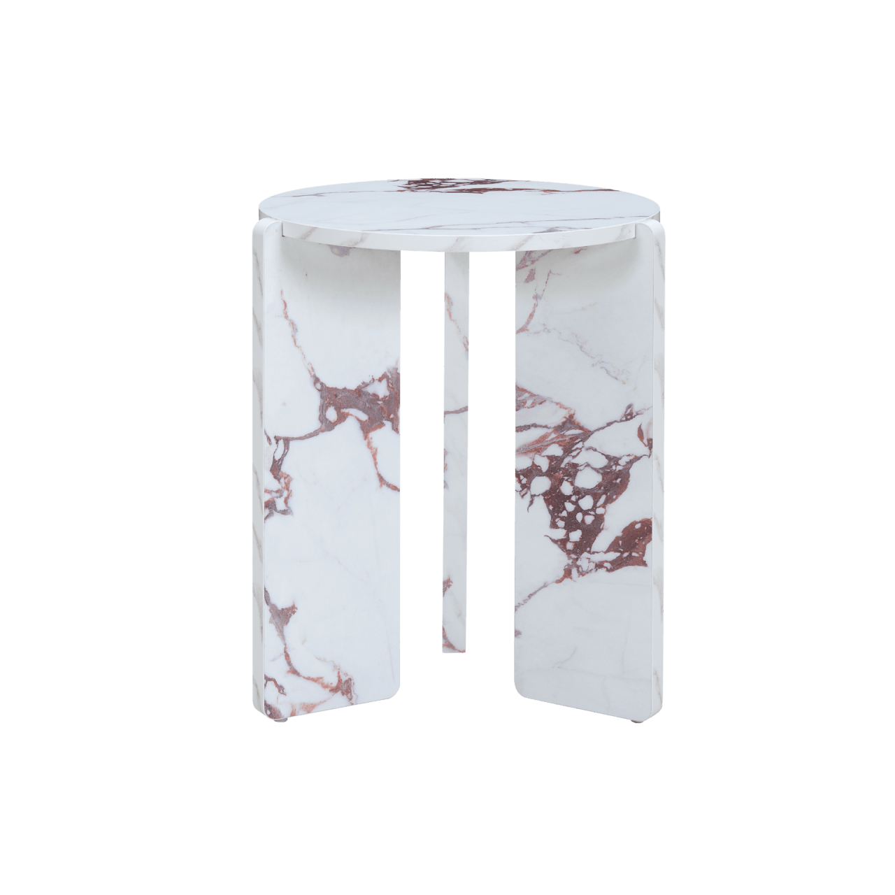 The Halo Side Table is a modern piece that blends a sleek circular design with a cool marble-effect finish. It features rectangular legs with rounded edges, extending beyond the tabletop for a distinctive overlapping detail. The smooth surfaces give the side table a distinct look and feel that complements both wooden and stone floors. This side table is built with high-quality materials, promoting long-term durability and sustainability.