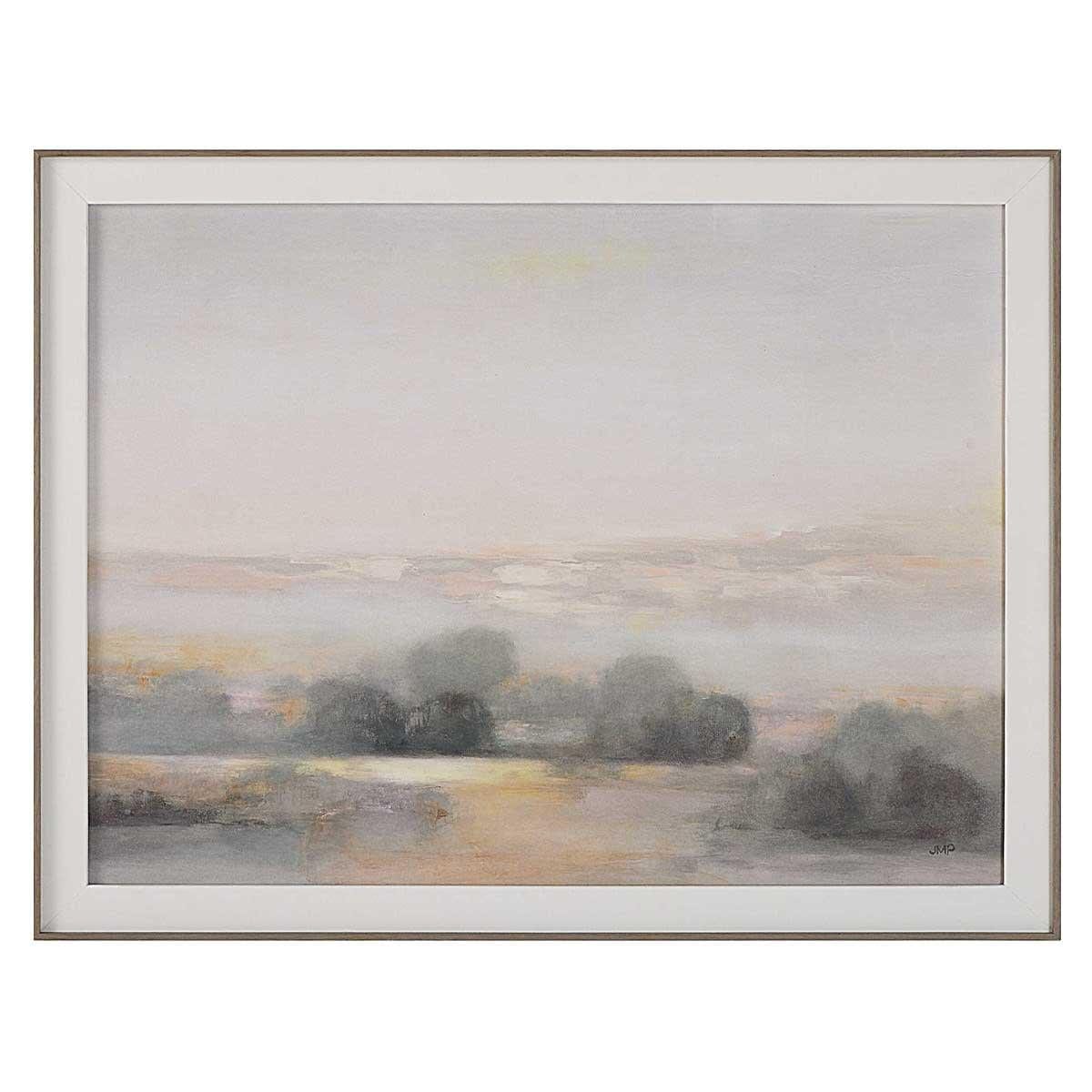 Indulge in the timeless romance of the English countryside with the Uttermost Atmospheric Neutral Landscape Print. This stunning piece captures the essence of rolling hills with a dreamy color palette, transporting you to a serene and peaceful place. The print is beautifully accented by a thin light grey frame with wood grain detail and a white linen liner, adding a touch of elegance to any room.