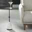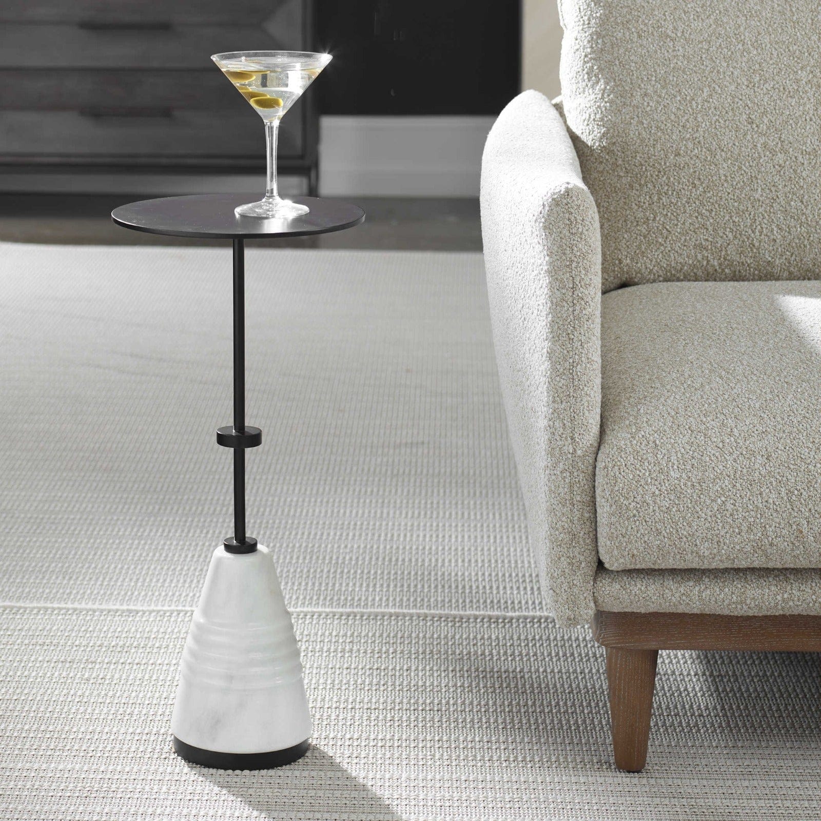The Uttermost Kincaid Drink Table is a truly unique piece that combines strength and elegance. With a black metal top and a carved marble base, this table is both durable and visually stunning. As part of the Uttermost brand, known for its upscale luxury aesthetic, this table is designed by some of the most talented designers in the industry. Each piece is carefully crafted to bring fashion-forward products to your home without compromising on quality. The dimensions of this table are 27.9 cm in width, 27.9 cm in depth, and 61 cm in height, making it the perfect size for any room. Its round shape and use as a drinks or side table make it a versatile addition to any space. Made with iron and marble, this table is suitable for indoor use.