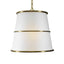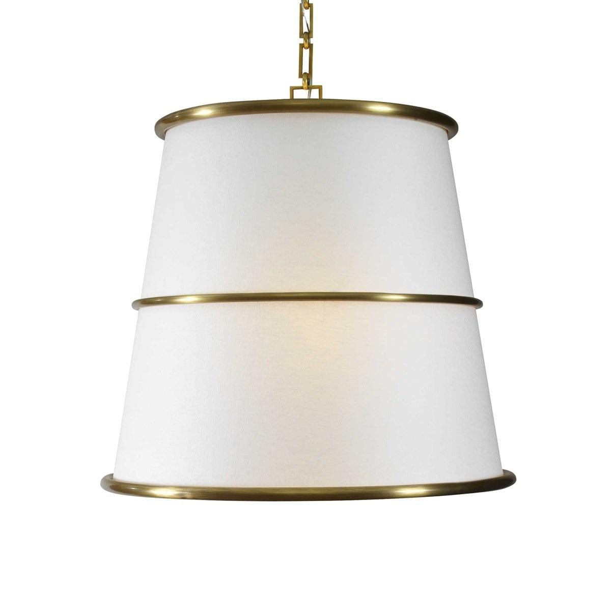 Introducing the Black Label Triad 4 Light Pendant, a truly unique and luxurious addition to any home. Crafted with three round hoops of light antique brass-finished steel, this pendant encircles a round tapered white linen shade, creating a stunning visual effect. The four lights are softened and concealed with a bottom diffuser, providing a warm and inviting glow. This pendant is supplied with 15` wire and suspended by 3` of custom chain, allowing for adjustable installation with a combination of rectangular and round links.