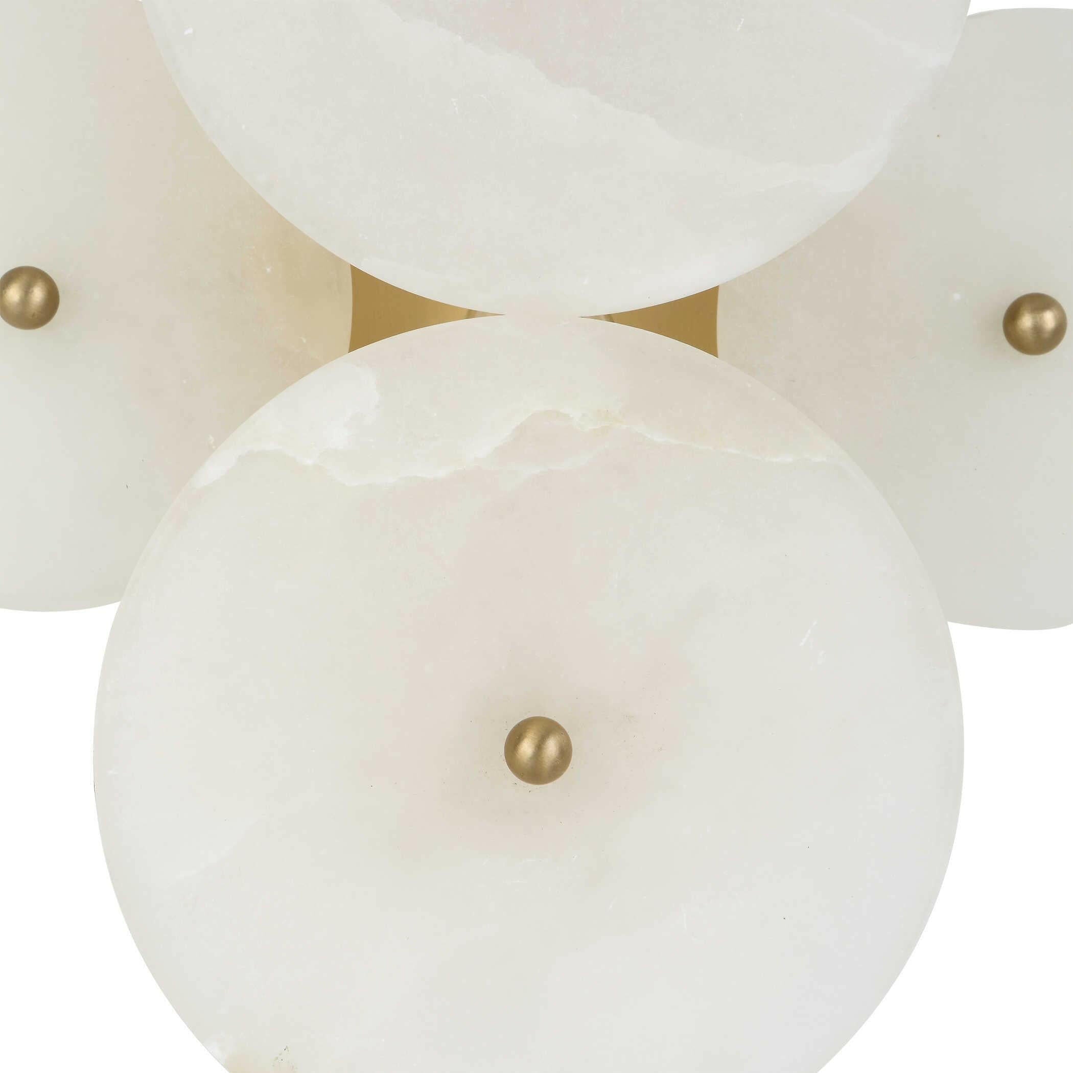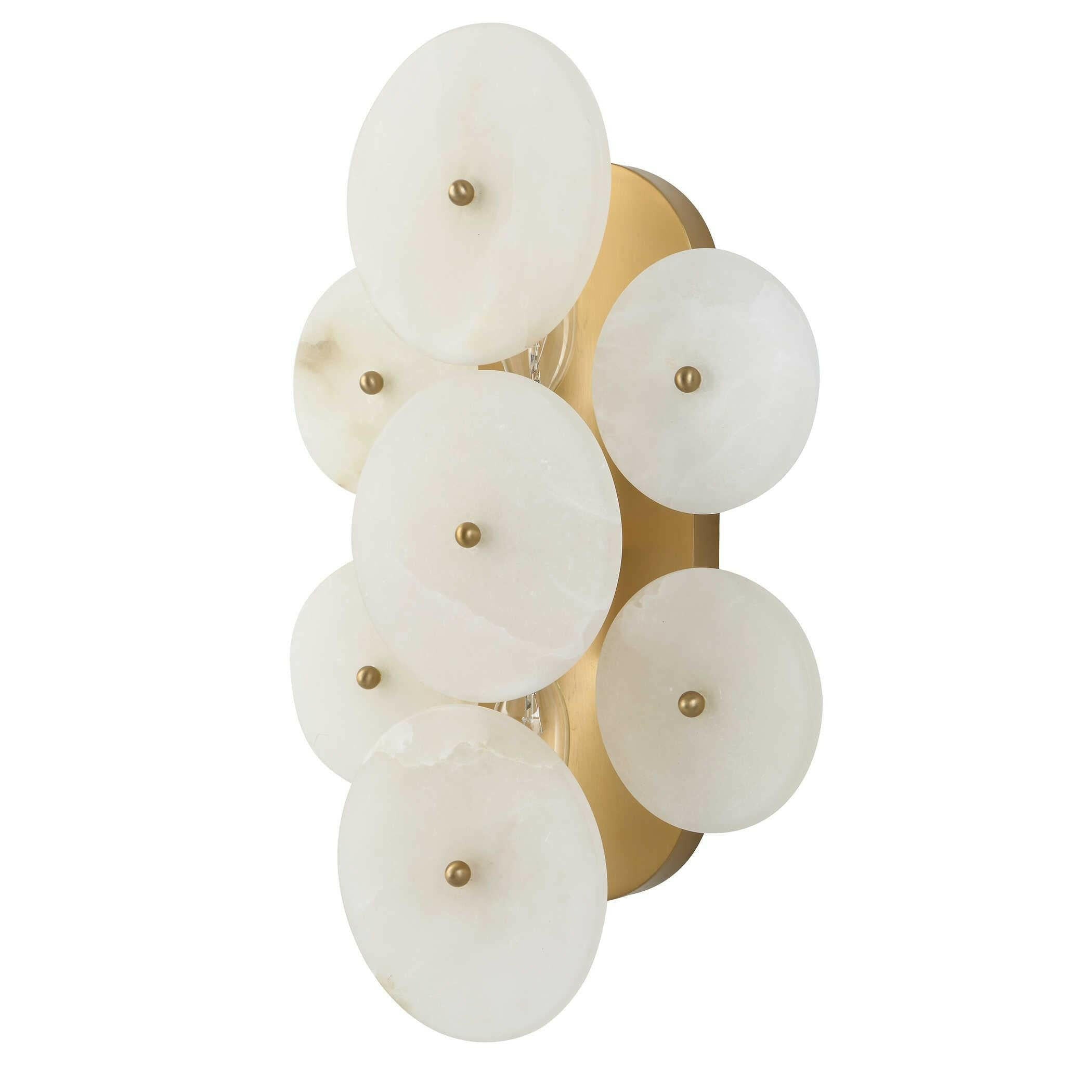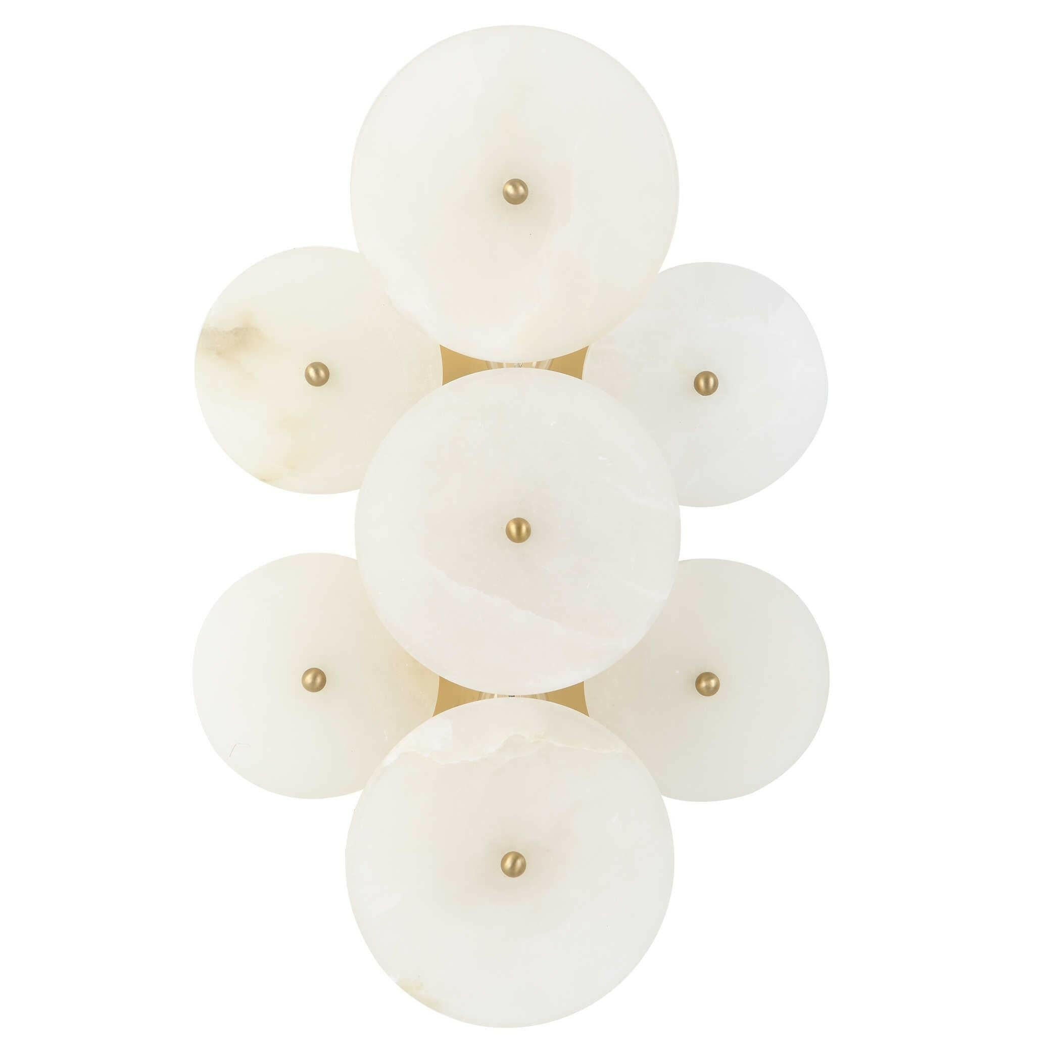 Seven discs of illuminated alabaster make up the stunning Alabaster Radiance Wall Light. Each disc is held in place by a brass-finished button detail, creating a unique and elegant glow. The natural alabaster discs vary in opacity and contain dark veining, adding to the light's one-of-a-kind charm. This versatile light can be mounted vertically or horizontally and features 2-60 watt max candelabra sockets. With a 4' extension from the wall, it is also ADA compliant. The Alabaster Radiance Wall Light is part of the Black Label collection by Uttermost, known for its premium upscale furniture, lighting, and home accessories. Designed by our in-house team of skilled designers, this light embodies American style and luxury without compromising on quality. Our focus on relaxed design and generous proportions makes it perfect for a sophisticated luxury home. At House of Isabella, we are committed to bringing you the most fashion-forward products in the industry. But we also understand that good design means nothing without quality manufacturing. That's why we ensure that no shortcuts are taken in the production of our products, exceeding expectations every time. Dimensions: Width: 26 cm, Depth: 10.2 cm, Height: 38.7 cm. House of Isabella - your destination for luxurious furniture, interiors, and free UK delivery.