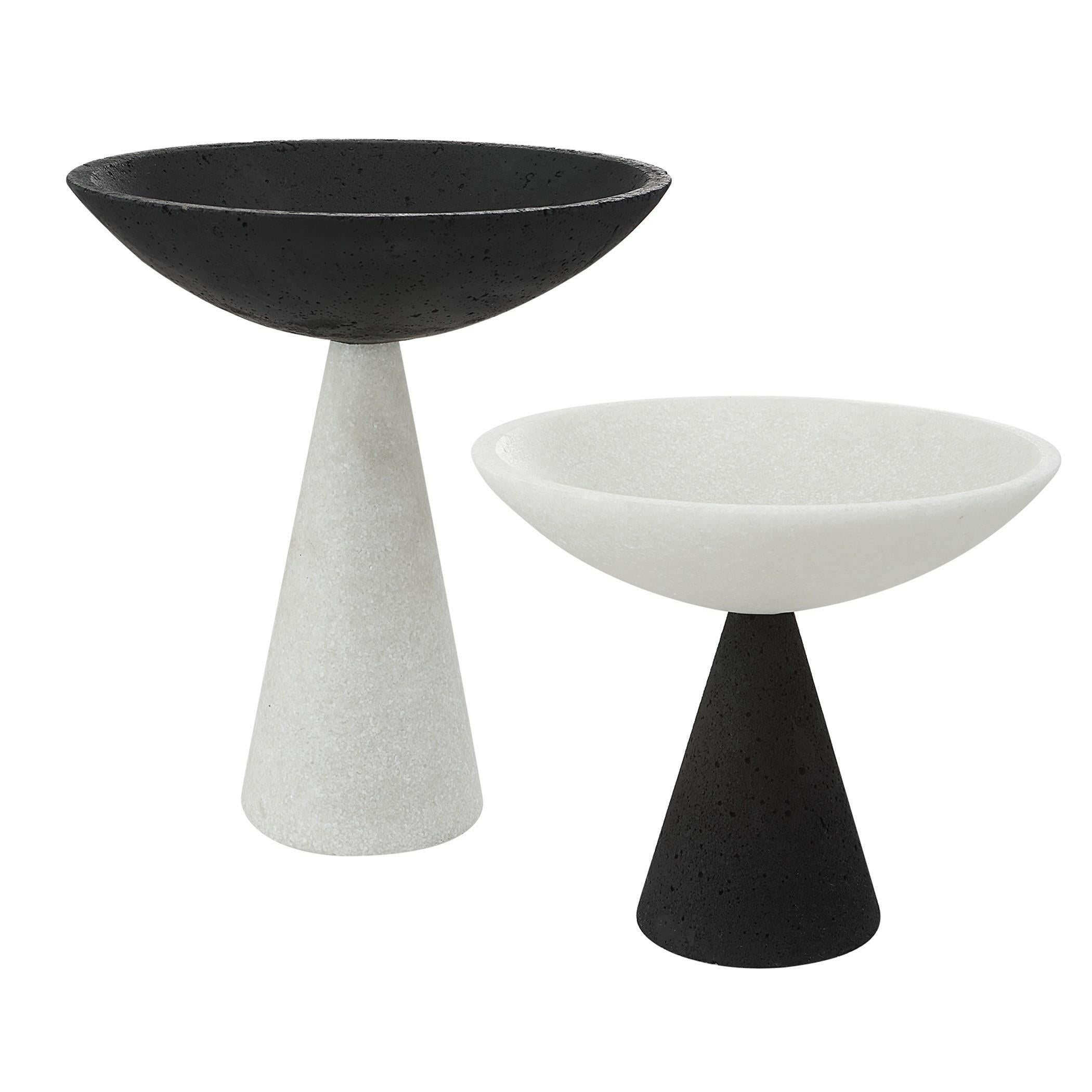 Introducing the Antithesis Marble Bowls, a set of two modern pedestal bowls that will elevate the style of any room. These bowls are crafted from a striking black and white man-made stone that accurately replicates the luxurious look of Thassos marble. With sizes of S-10x9x10 and L-10x12x10, these bowls are the perfect addition to your home decor.