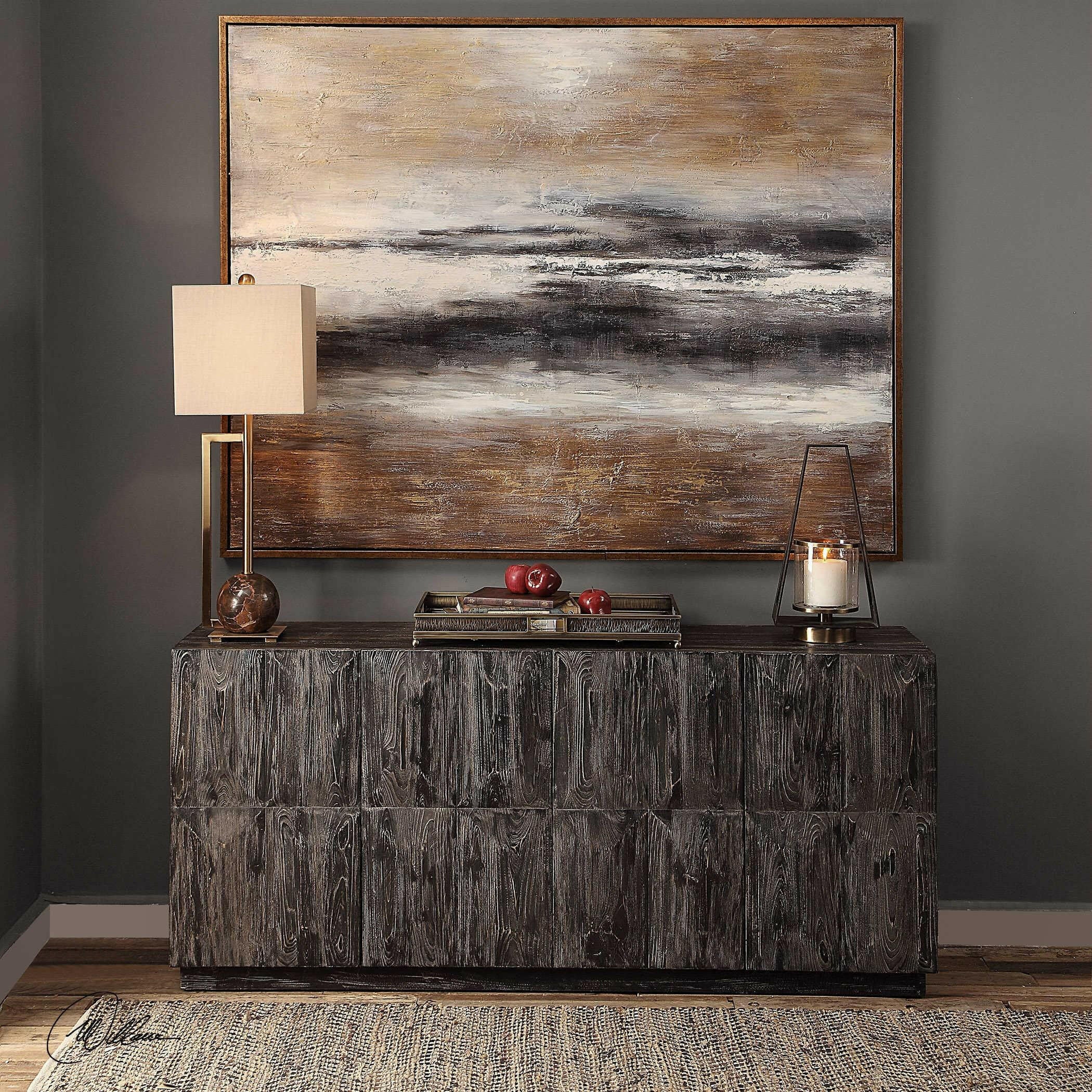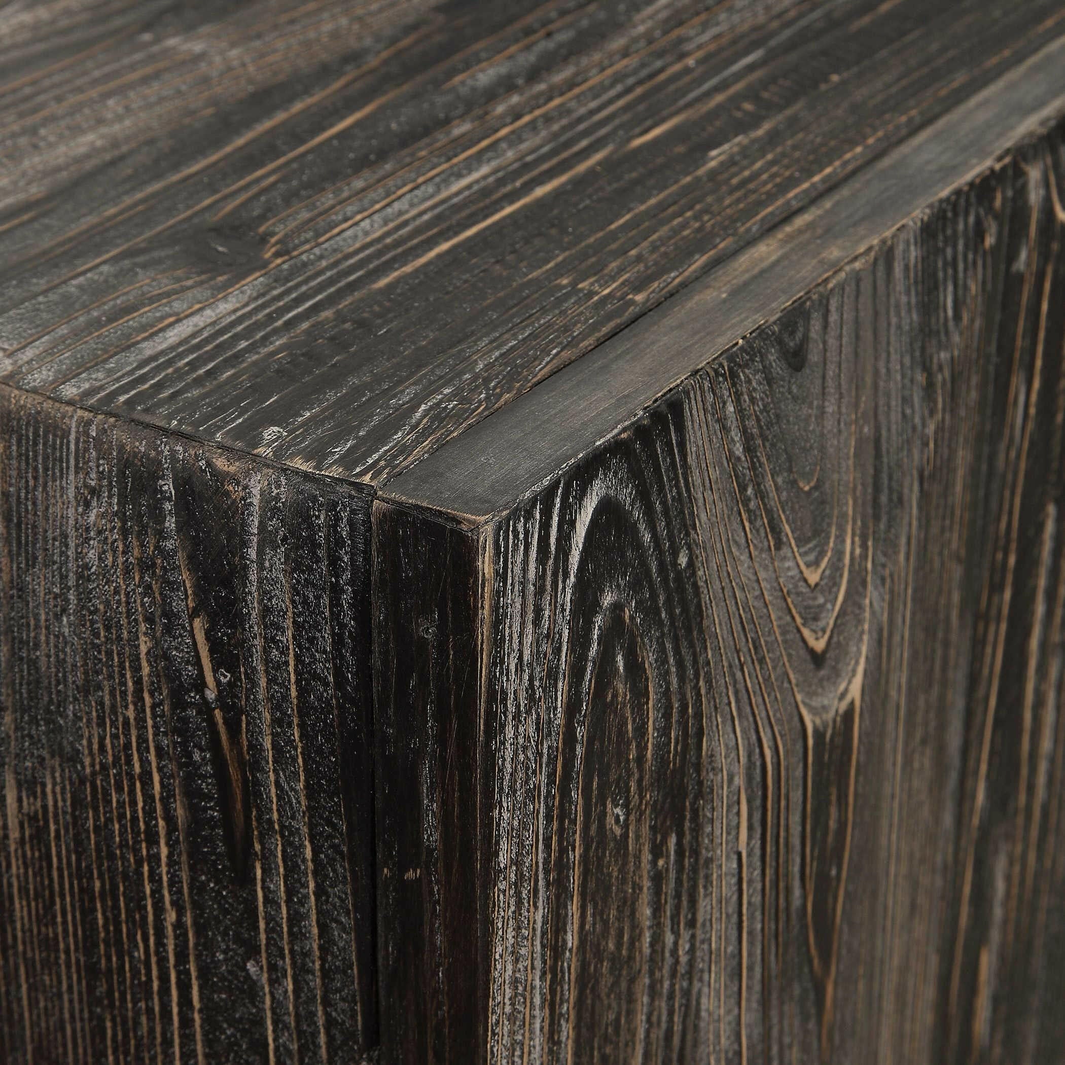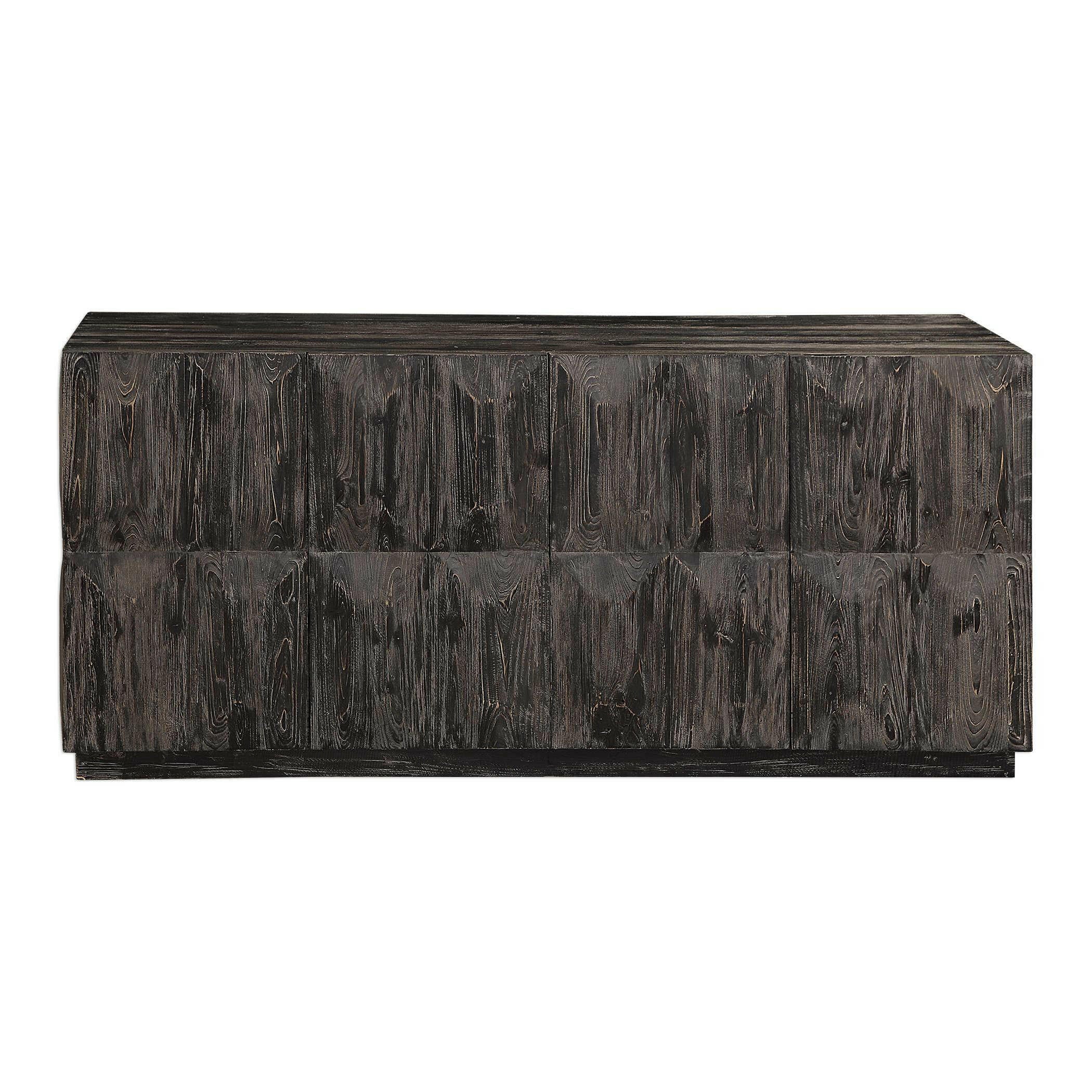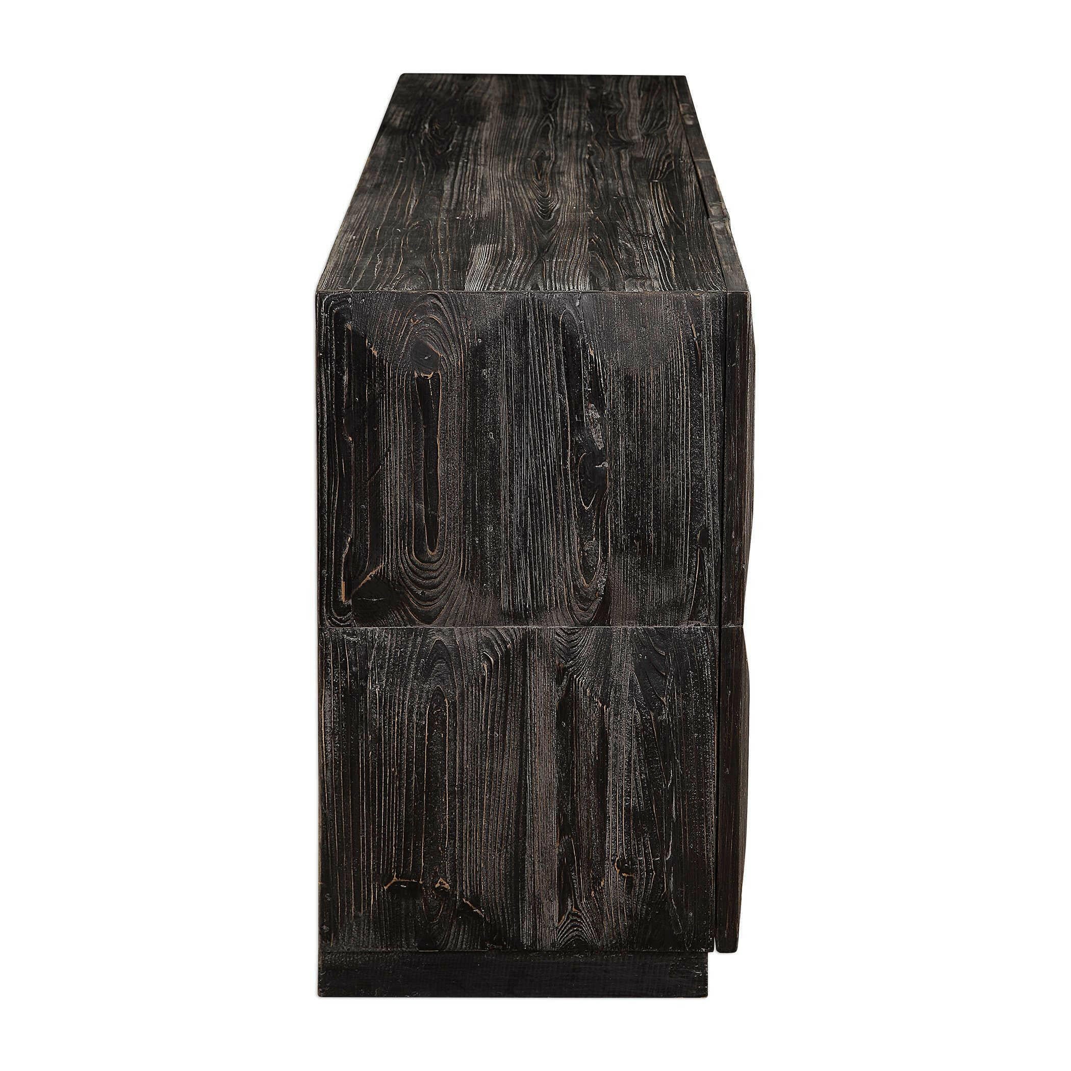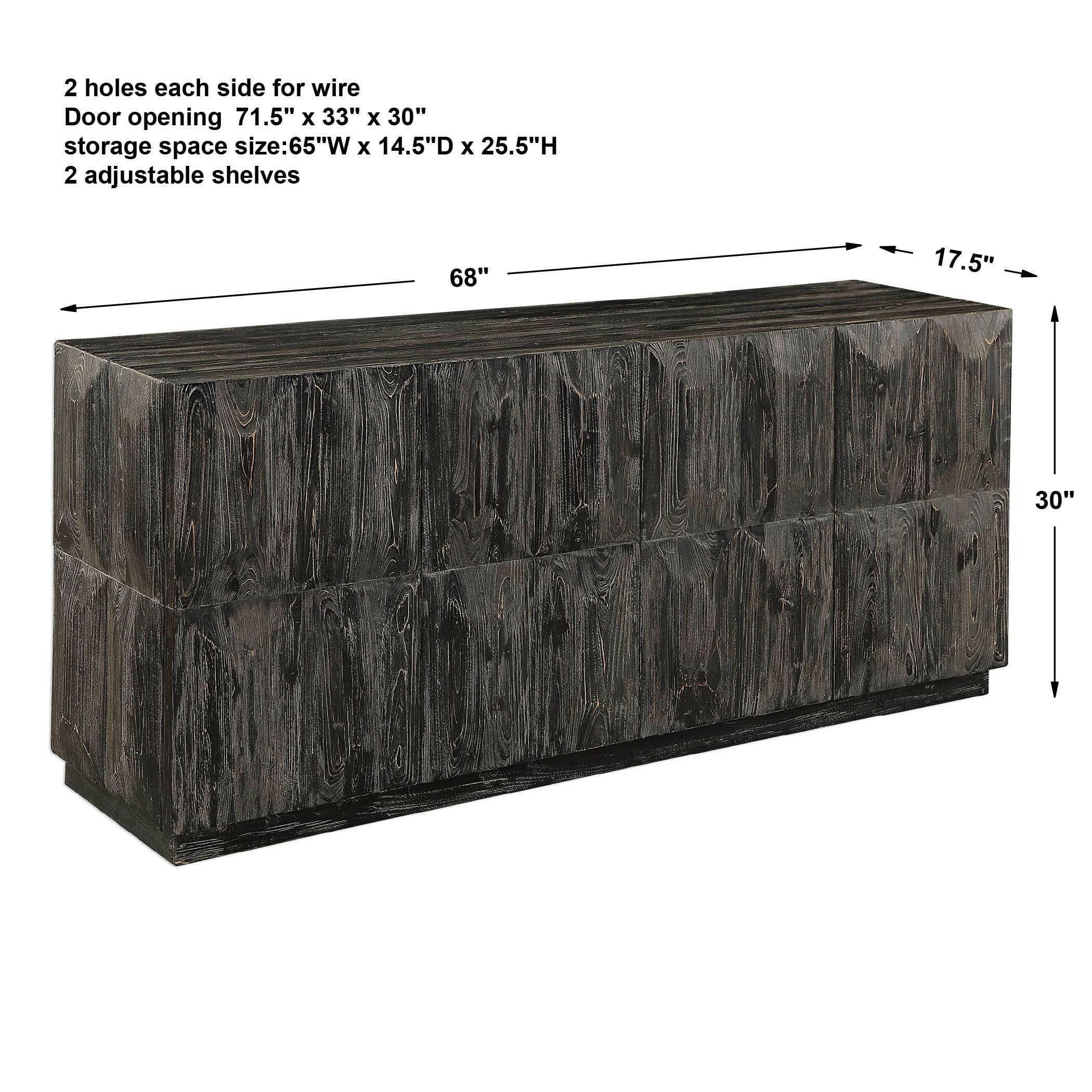 The Barlas Media Console is a truly unique piece of furniture that will add a touch of luxury to any home. Made almost entirely of solid reclaimed fir, this console features bevel paneled front and sides, finished in a heavily aged black with a light gray glaze and ember highlights. Its three soft close doors open to reveal one adjustable shelf in each compartment, providing ample storage space. The solid wood construction will continue to develop character over time, with small cracks and uneven surfaces adding to its authenticity. Part of the Black Label collection by Uttermost, this console is designed by skilled in-house designers and showcases American style without compromising on quality. The focus on upscale home luxury is evident in the generous proportions, oversized mirrors, large sets of artwork, and elaborate lamps and lighting fixtures. And while the design is fashion-forward, no shortcuts are taken in manufacturing to ensure that the product exceeds expectations. Measuring 172.7 cm in width, 44.4 cm in depth, and 76.2 cm in height, the Barlas Media Console is a statement piece that will elevate any room. With free UK delivery, House of Isabella offers luxurious furniture and interiors that will add a touch of elegance to your home.