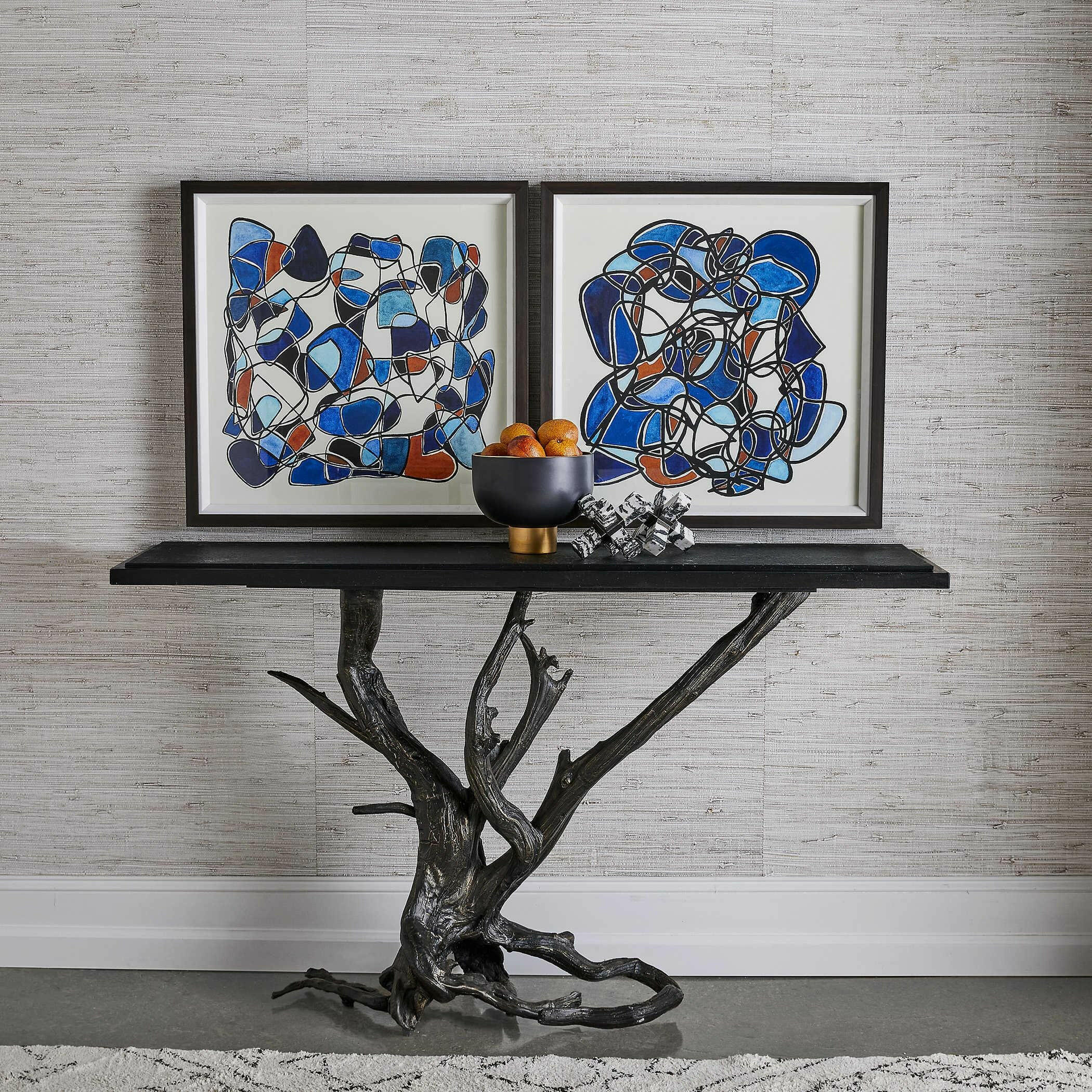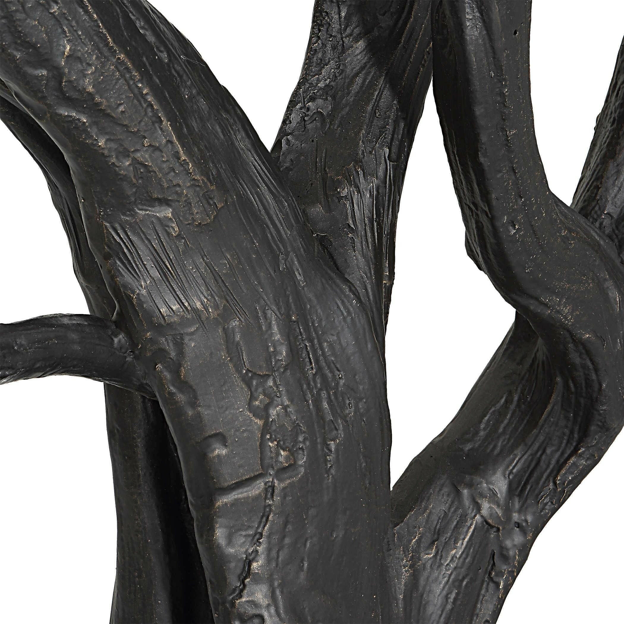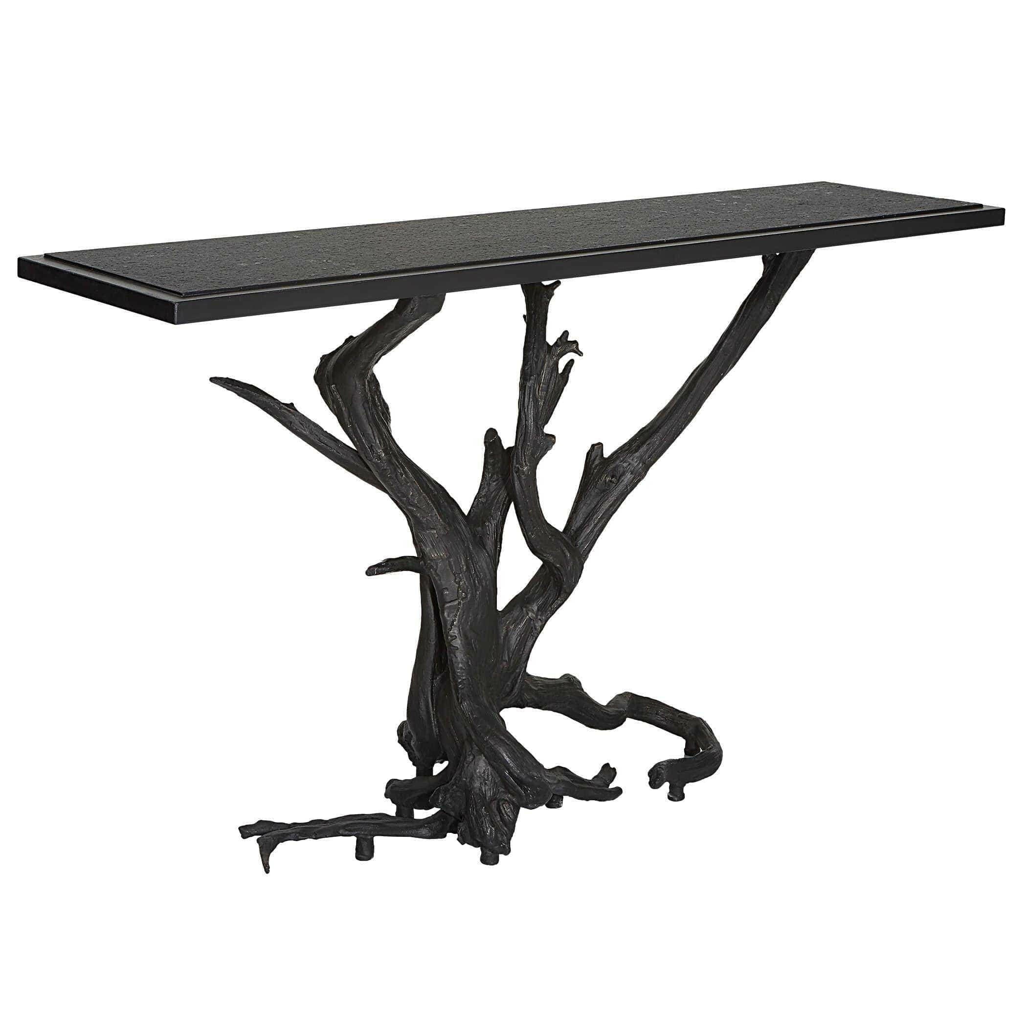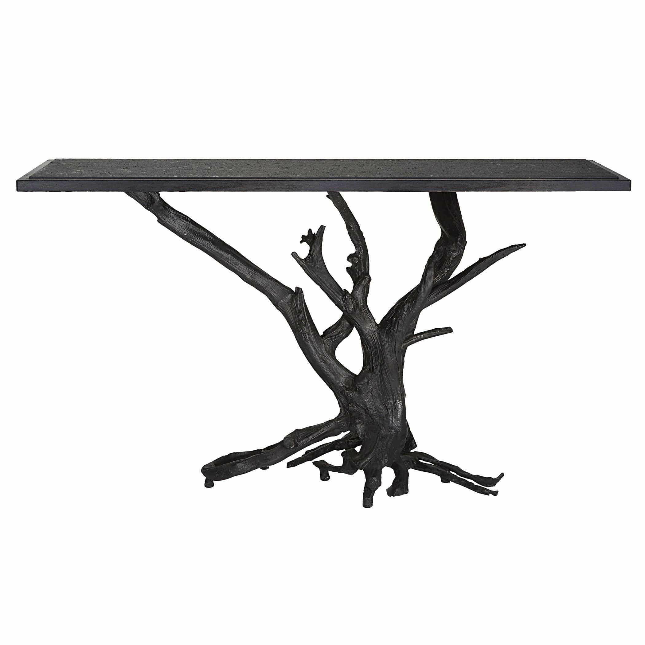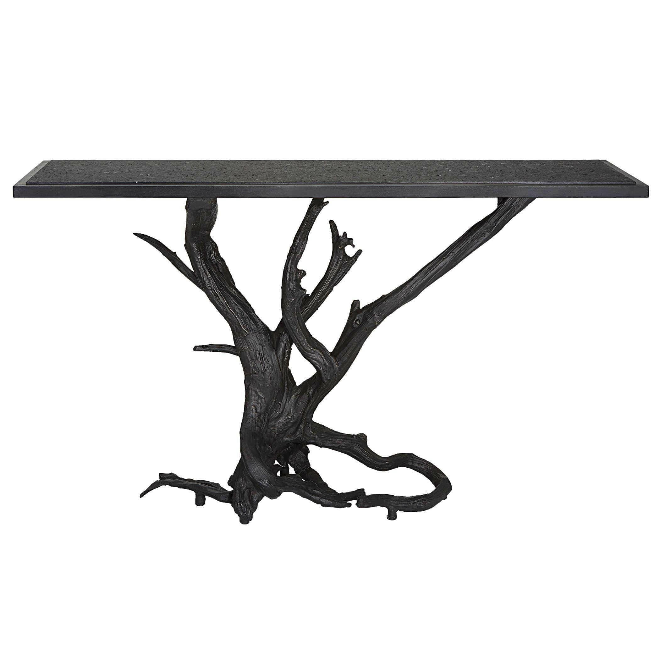 The Big Sur Console Table in bronze and black is a truly unique piece of furniture. Made from real driftwood cast in iron and finished in bronze, this table is a stunning combination of natural and industrial elements. The base is intricately detailed and textured, providing a graceful support for the honed stone leather finish black granite top. This table is part of the Black Label collection by Uttermost, known for its premium upscale furniture, lighting, and home accessories. Designed by our skilled in-house team, this table embodies American style and luxury.