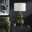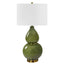 Introducing the Black Label Gourd Table Lamp in Green, a truly unique and timeless piece that will elevate any room in your home. This stunning lamp features a gourd-shaped ceramic base with a moss green glaze and lightly antiqued brass plated details. The round drum shade is made of white linen fabric, adding a touch of elegance to the overall design. Each lamp is hand-finished, resulting in slight variations in the glaze, making each piece one-of-a-kind.