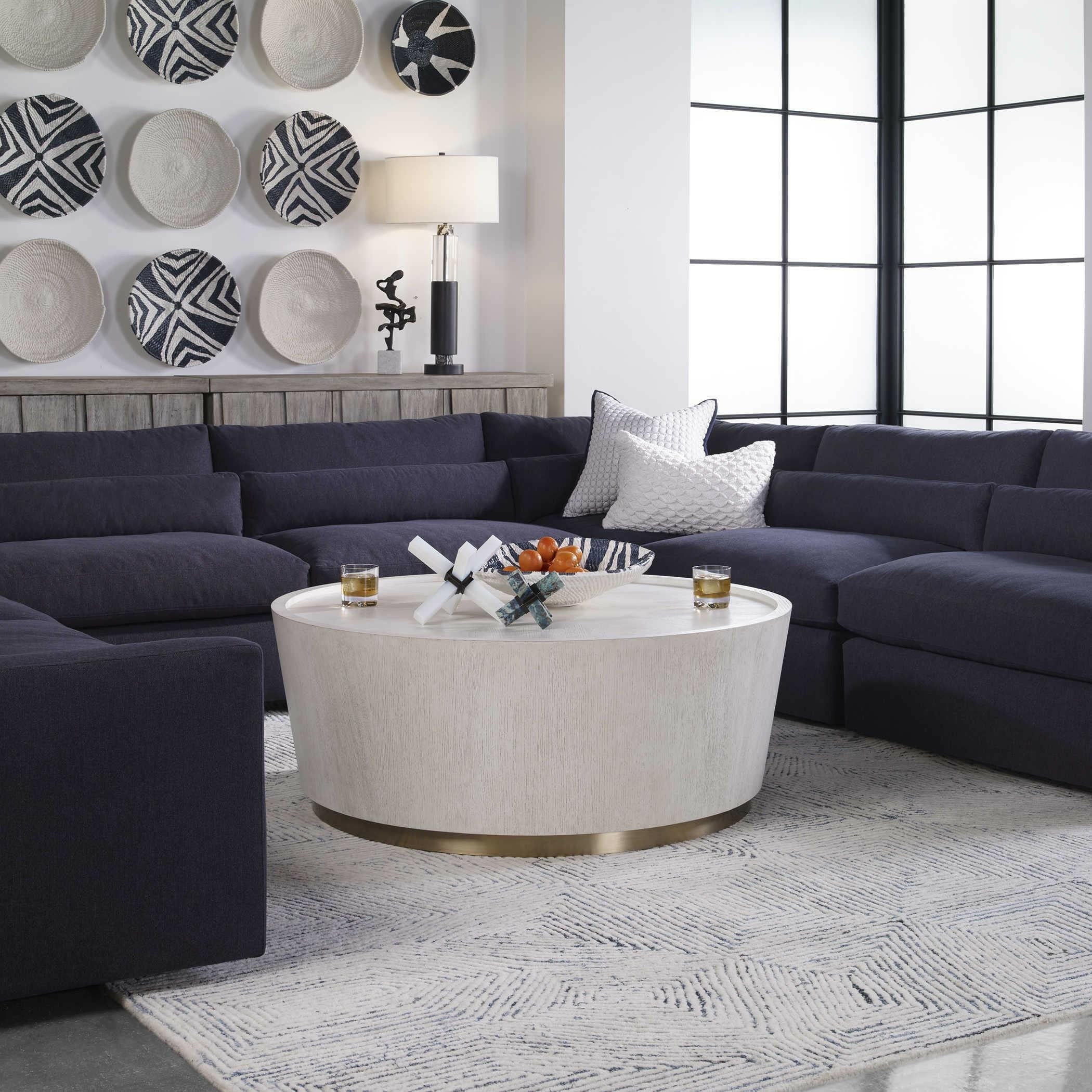 Clean and sophisticated, the Cask Coffee Table is a truly unique piece of furniture. Its lightly distressed ivory finish over quartered oak veneer adds a touch of elegance to any room. The tray lipped top features a beautiful marquetry pattern, while the platform base is trimmed in stainless steel with a plated brushed brass finish. This coffee table is part of the Black Label by Uttermost, our most exclusive collection of premium upscale furniture, lighting, and home accessories. Designed by our in-house team of skilled designers, each item in this collection exudes American style and luxury. With a focus on relaxed design and generous proportions, this coffee table is perfect for a sophisticated home. Measuring 116.6 cm in width, depth, and height, it is the perfect size for any living space. At House of Isabella, we are committed to providing you with the most fashion-forward and high-quality products. You can trust that no shortcuts are taken in manufacturing to ensure that our products exceed your expectations. Elevate your home with the luxurious Cask Coffee Table and enjoy free UK delivery.