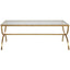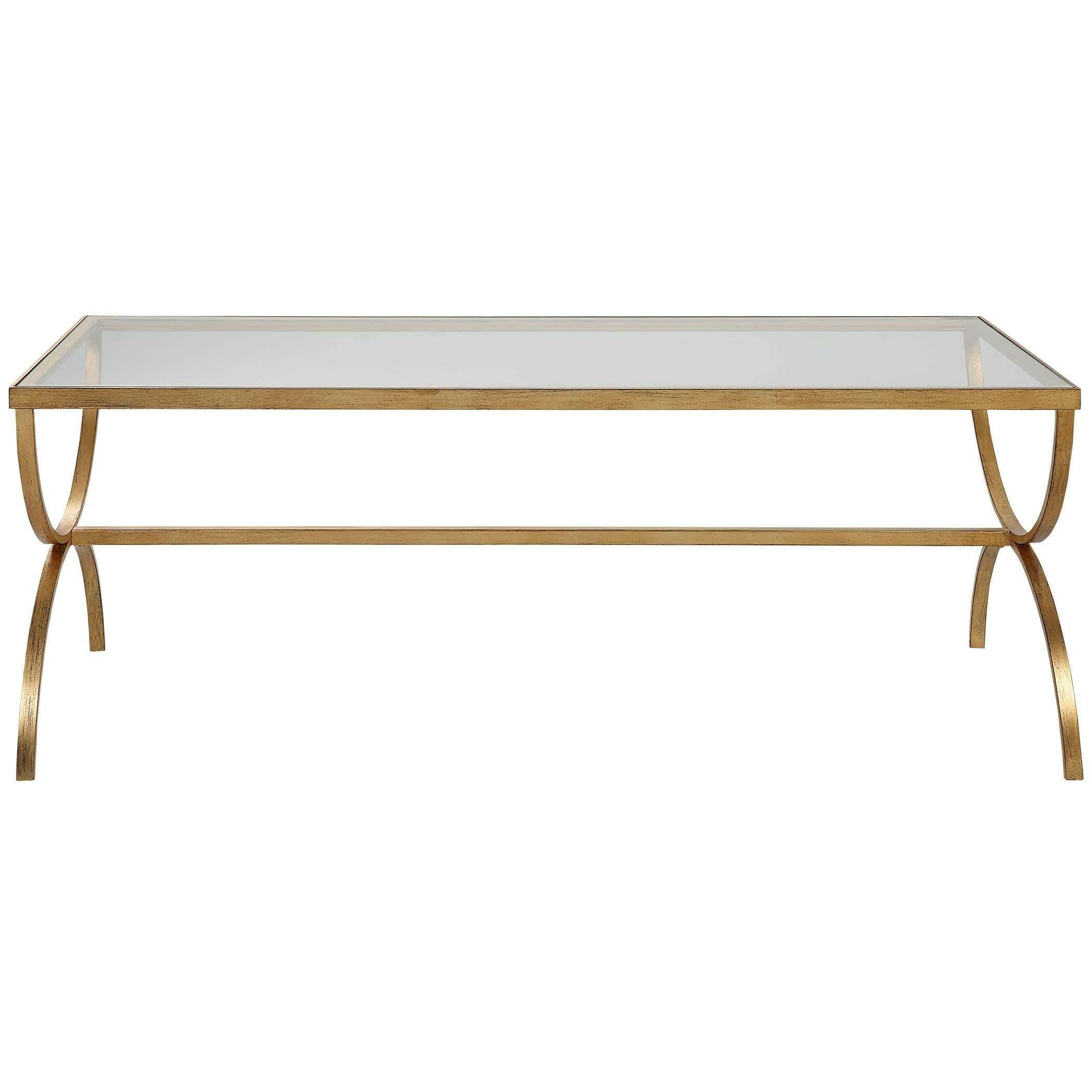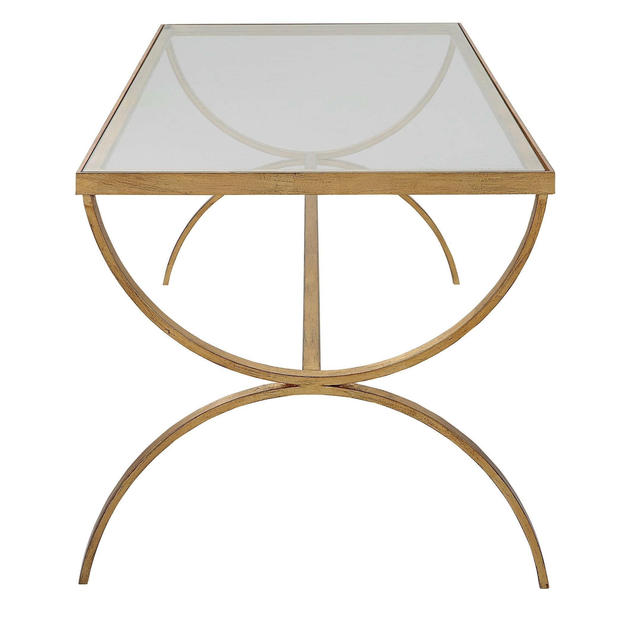 The Crescent Coffee Table from Uttermost is a truly unique piece that will add a touch of elegance to any living space. Hand forged iron in an antiqued gold finish creates graceful lines that are reminiscent of traditional design. The table is topped with tempered glass, adding a modern touch to its classic look.
