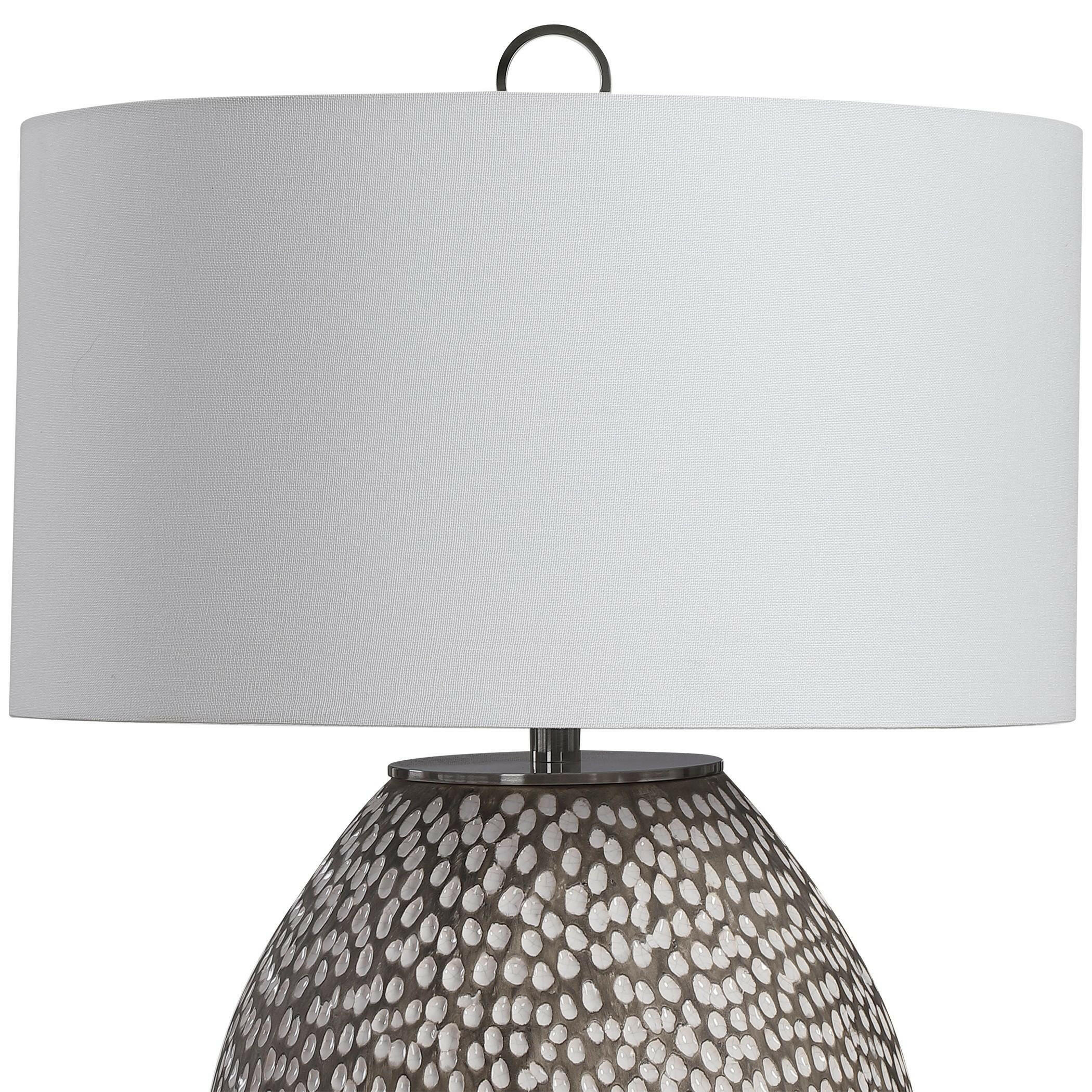 The Cyprien Gray White Table Lamp from House of Isabella is a truly unique piece that will add a touch of elegance to any room. Made from high-quality ceramic, this lamp features a heavily pitted surface that is finished in a stunning combination of brushed rustic gray and crackled gloss white glaze. The lamp is then paired with brushed nickel plated iron details, adding a modern touch to its overall design.