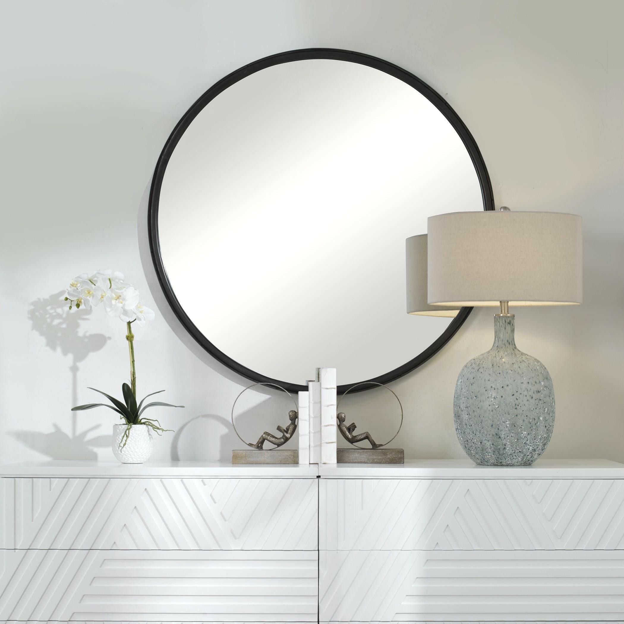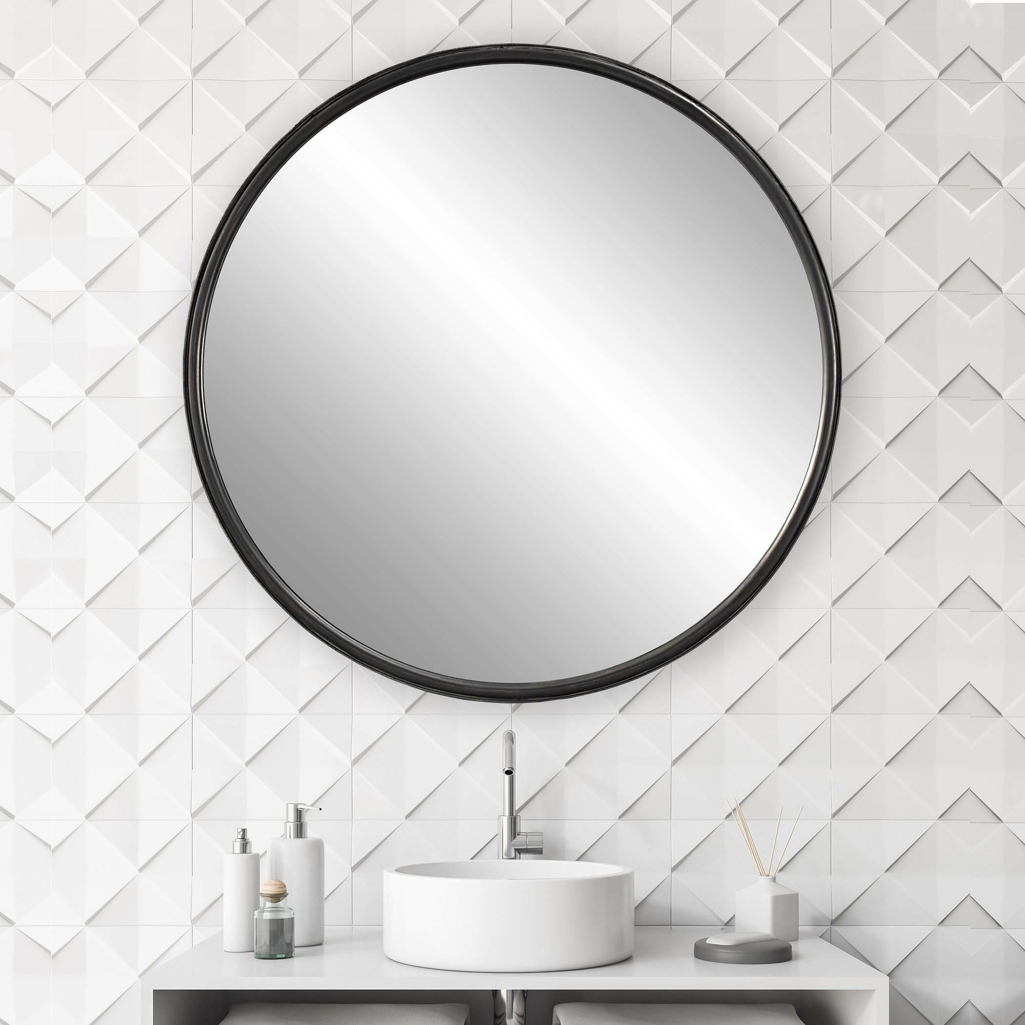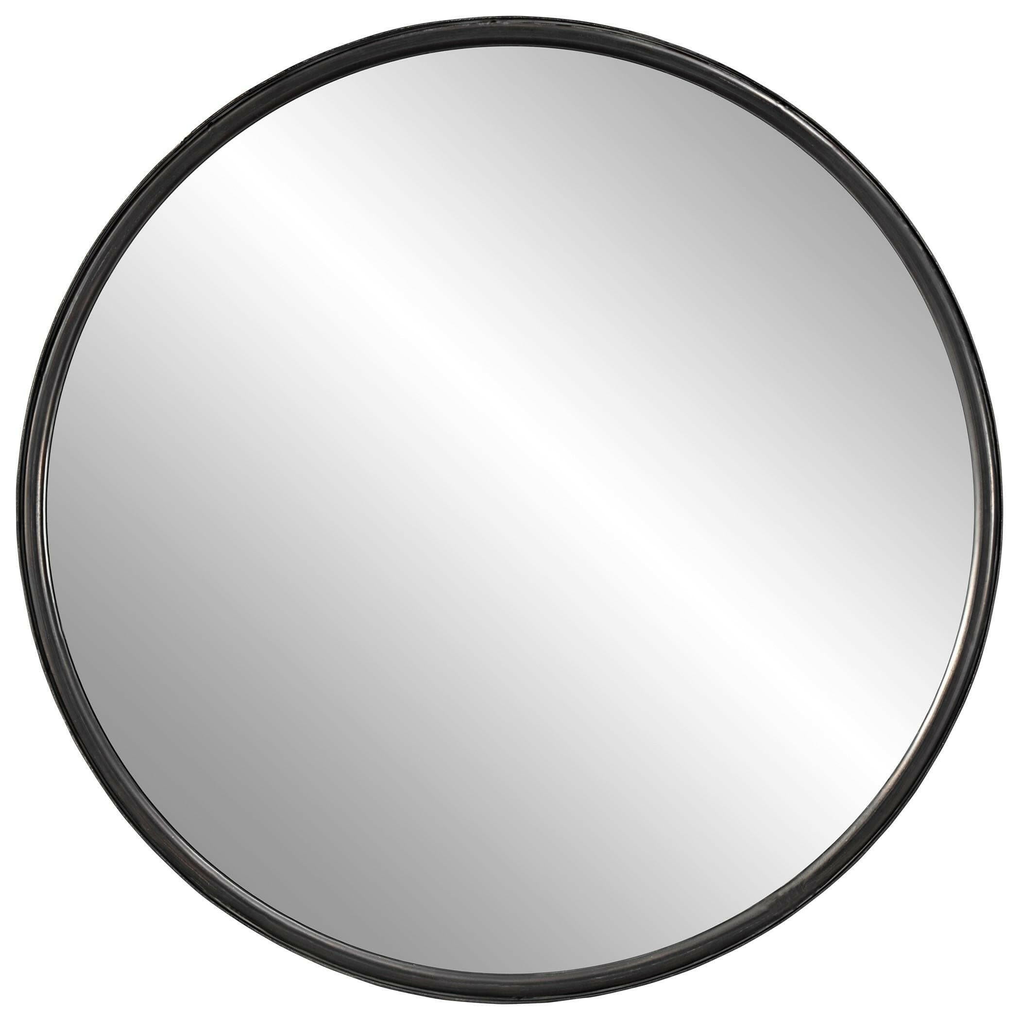 The Dawsyn Round Mirror from Uttermost is a truly unique and luxurious addition to any home. Its smooth rounded frame is encased in a thick iron band, finished in an aged black with subtle gray highlights. This mirror is not just a functional piece, but also a statement piece that will elevate the aesthetic of any room.