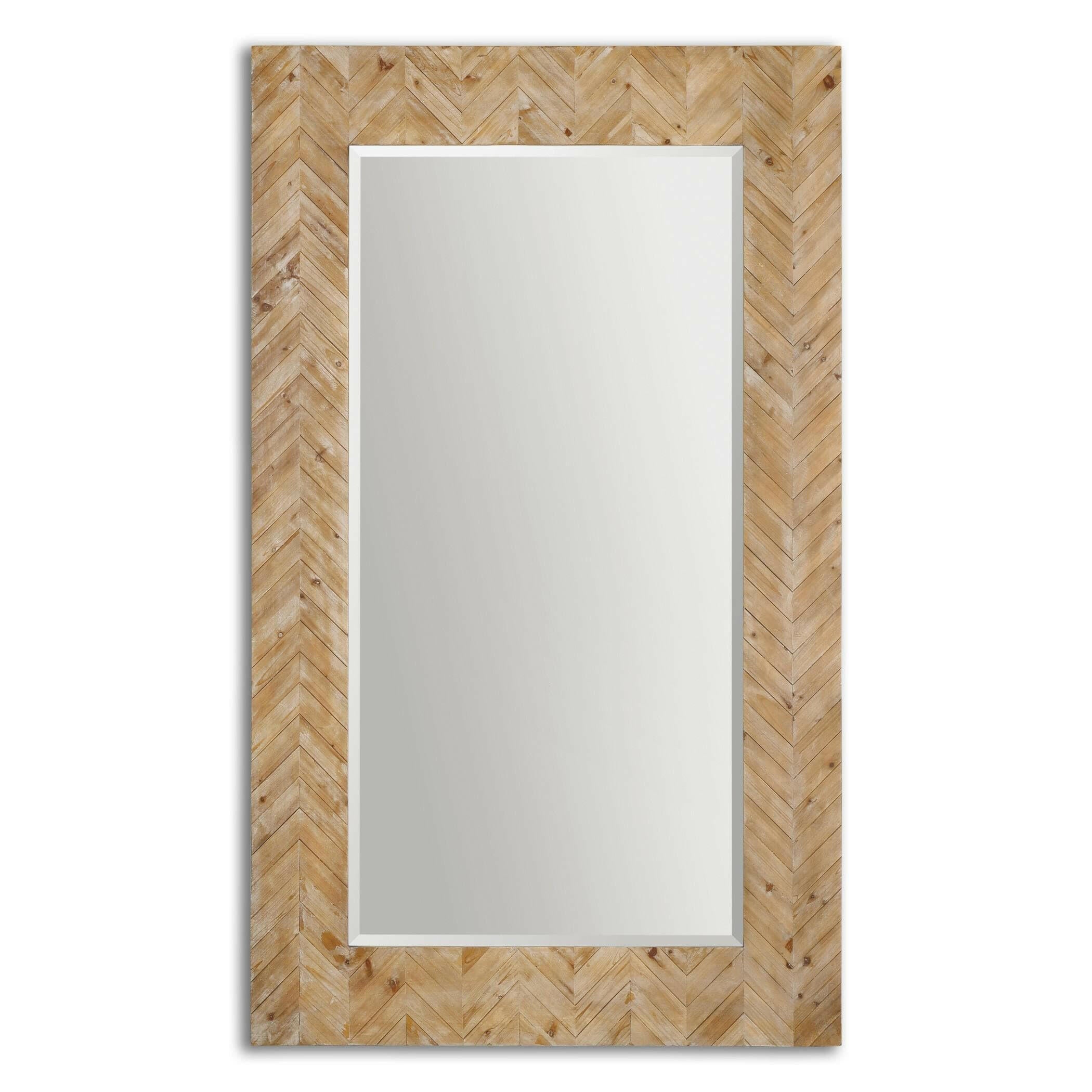 Introducing the Demetria Oversized Wooden Mirror, a truly unique and stately addition to any home. This mirror features a solid wood frame with a chevron pattern and a light gray glaze, adding a touch of elegance and sophistication to any room. With a generous 1 1/4' bevel, this mirror can be hung horizontally or vertically, making it a versatile and functional piece of decor.What sets this mirror apart is its construction - made from solid wood and layered in a chevron pattern, it is not only visually stunning but also durable and long-lasting. As part of the Uttermost brand, a family owned and managed US interior brand, this mirror is a testament to their commitment to quality and luxury. With an extensive range of furniture, lighting, and accessories, Uttermost is known for their fashion-forward and unique designs.At House of Isabella, we are proud to offer this luxurious mirror with free UK delivery. Measuring 111.1 cm in width, 5.4 cm in depth, and 188 cm in height, it is the perfect size to make a statement in any room. Trust in our talented designers and quality manufacturing to bring you the best in upscale home decor. Elevate your space with the Demetria Oversized Wooden Mirror.