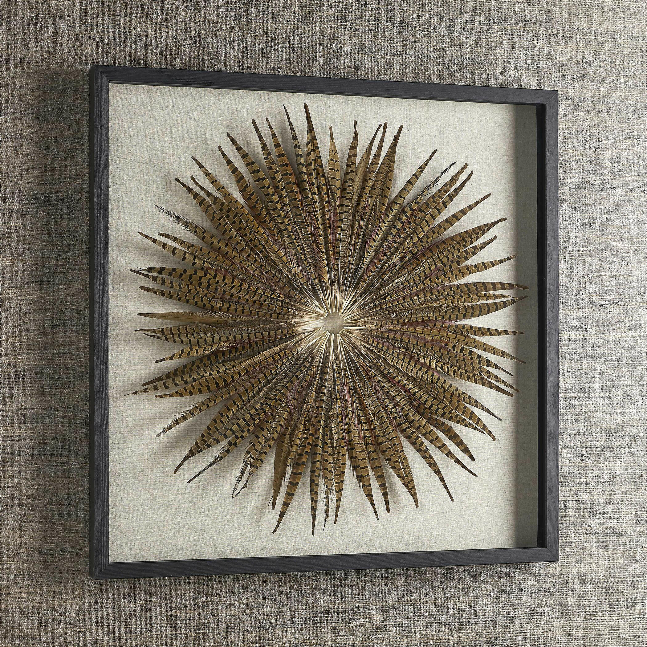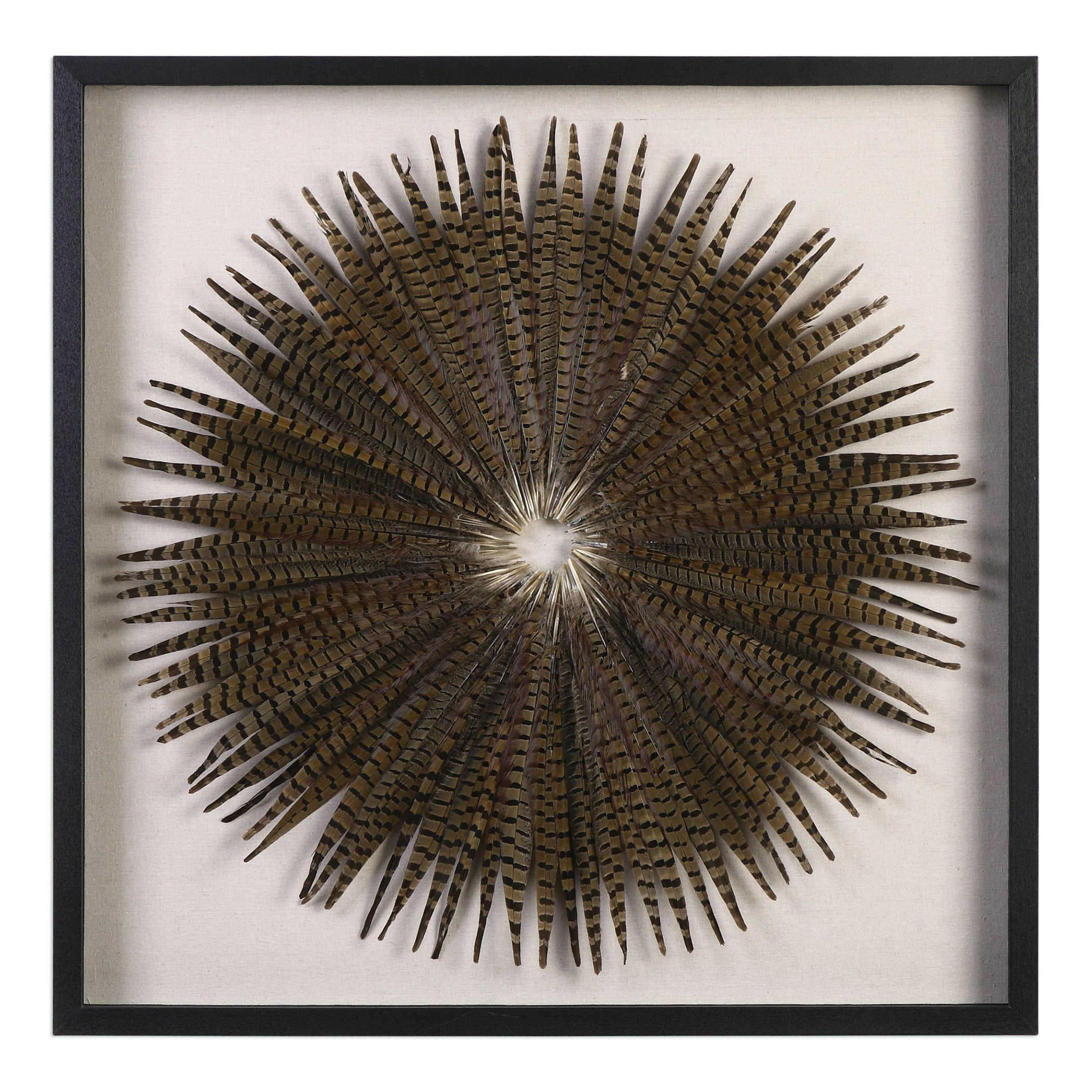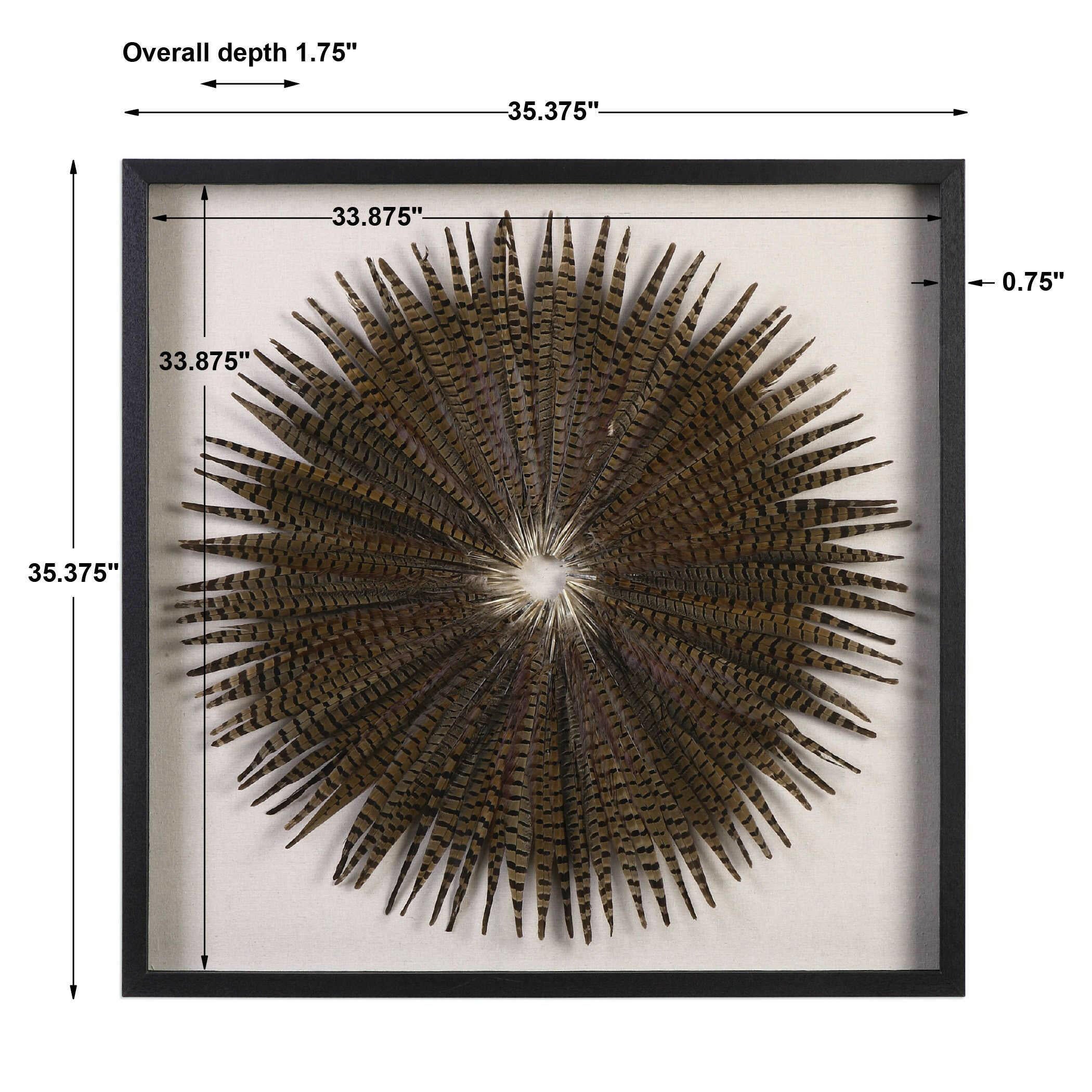 Introducing the Black Label Feather Burst Shadow Box, a truly unique and luxurious piece from our exclusive collection at House of Isabella. This stunning artwork features a striking starburst design made from natural brown Pheasant feathers, with hints of blue and burgundy. Each feather is meticulously hand laid on a natural linen fabric background, creating a one-of-a-kind piece that will add a touch of elegance to any room.