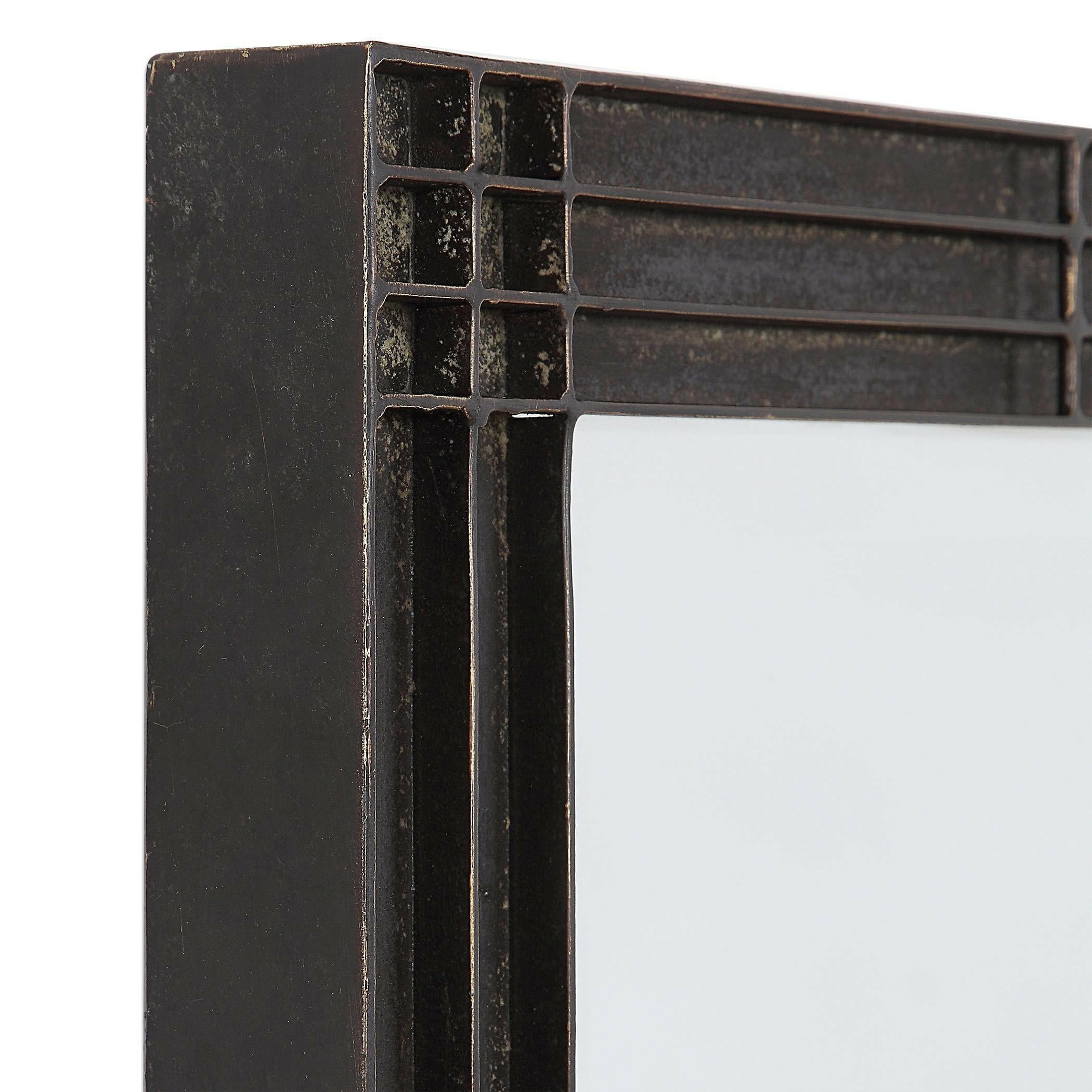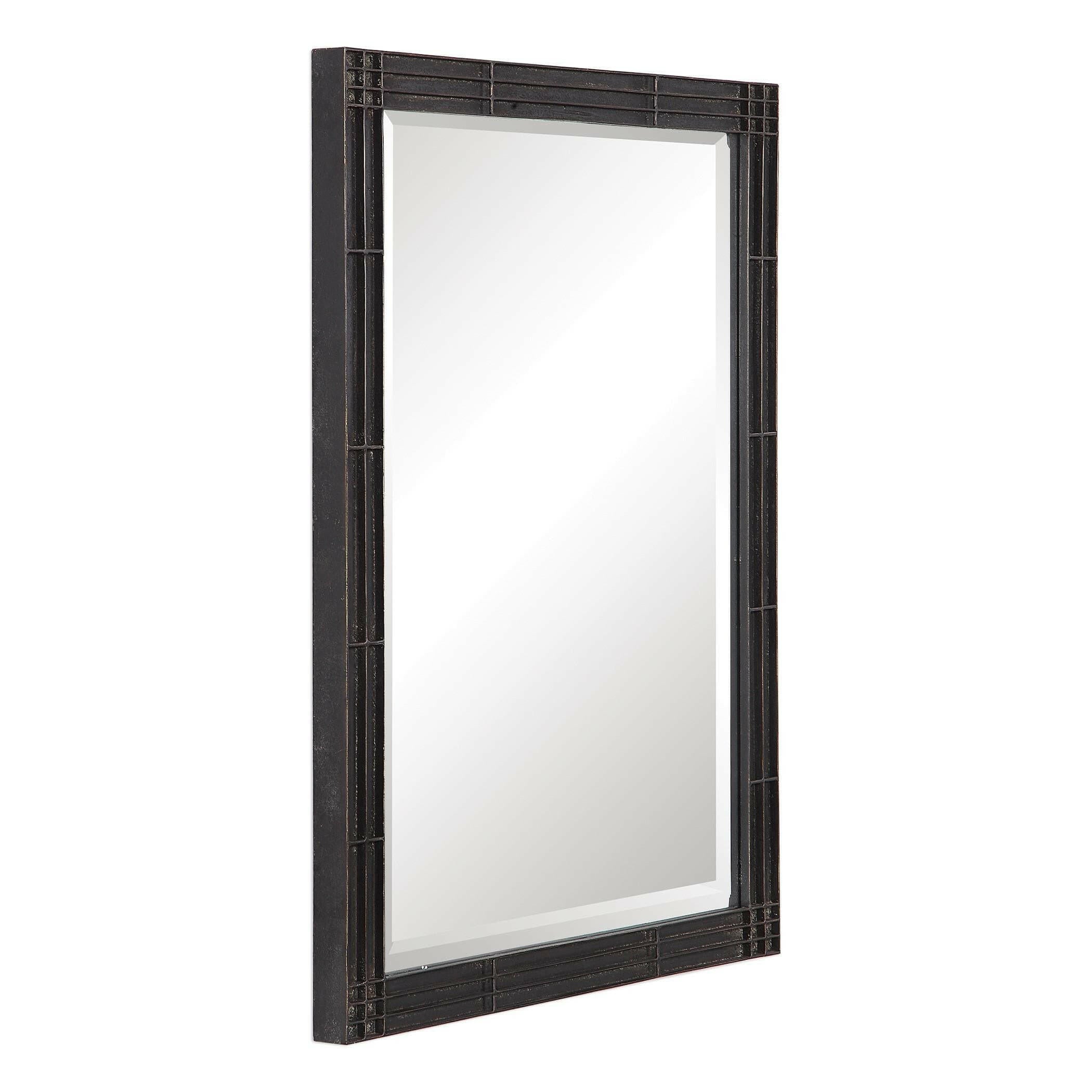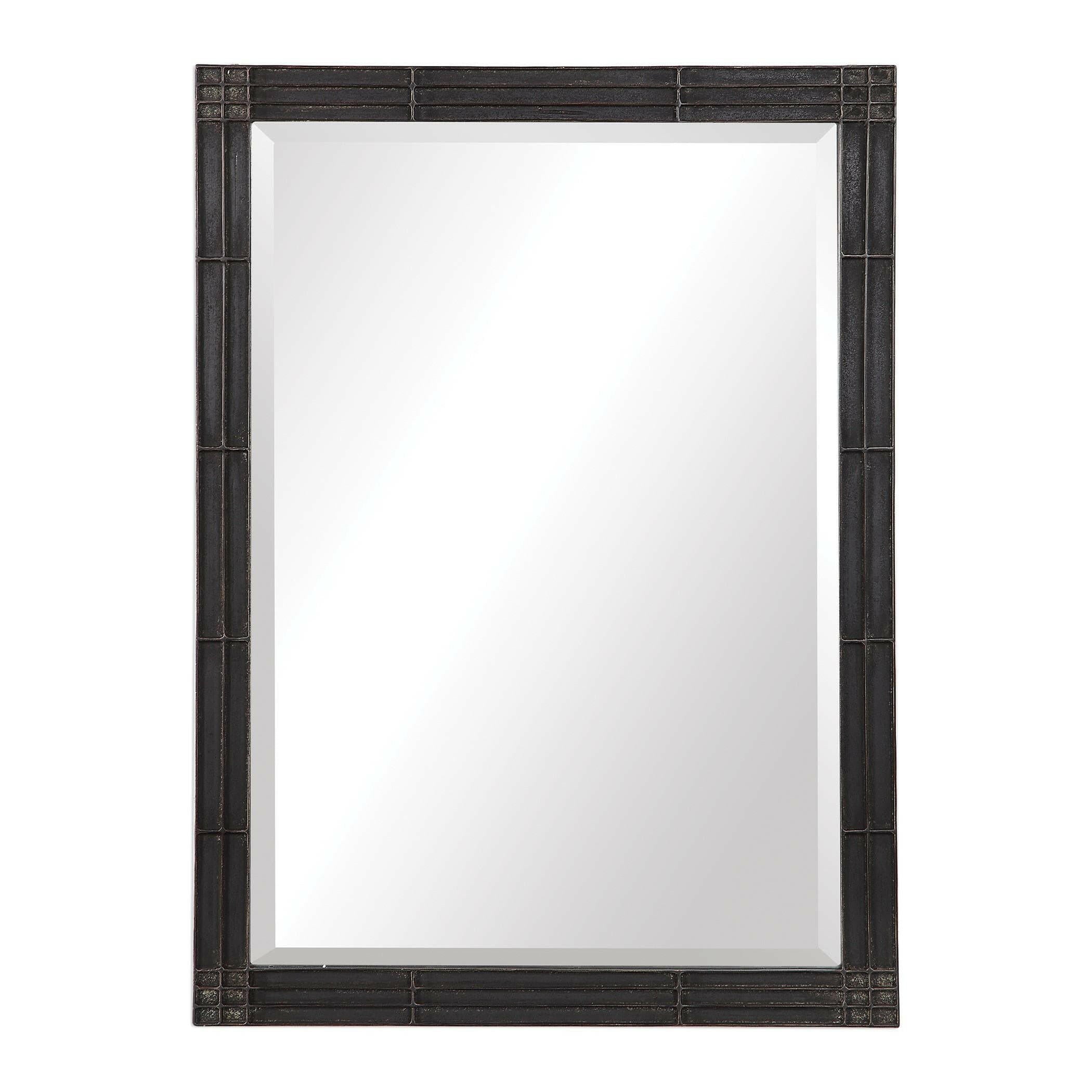 Crafted from hand forged iron, the Gower Aged Black Vanity Mirror is a truly unique piece. Its rectangular shape is adorned with raised geometric detailing, finished in a rustic aged black with subtle silver highlights and a gray patina wash. The mirror itself is surrounded by a generous 1 1/4' bevel and can be hung horizontally or vertically. This mirror is not only functional, but also adds a touch of elegance to any room.Uttermost is a family owned and managed US interior brand that prides itself on its upscale luxury aesthetic. With an extensive range of furniture, lighting, and accessories, Uttermost has some of the most talented designers in the industry creating fresh and unique collections to beautify your home. Quality manufacturing is a top priority for Uttermost, ensuring that their products exceed expectations.Measuring 64.1 cm in width, 3.8 cm in depth, and 87.9 cm in height, this mirror is the perfect size for a dressing table. It adds a touch of sophistication and luxury to any space. House of Isabella, the site where this mirror can be purchased, offers free UK delivery and is known for its luxurious furniture and interiors. Elevate your home with the Gower Aged Black Vanity Mirror from Uttermost.