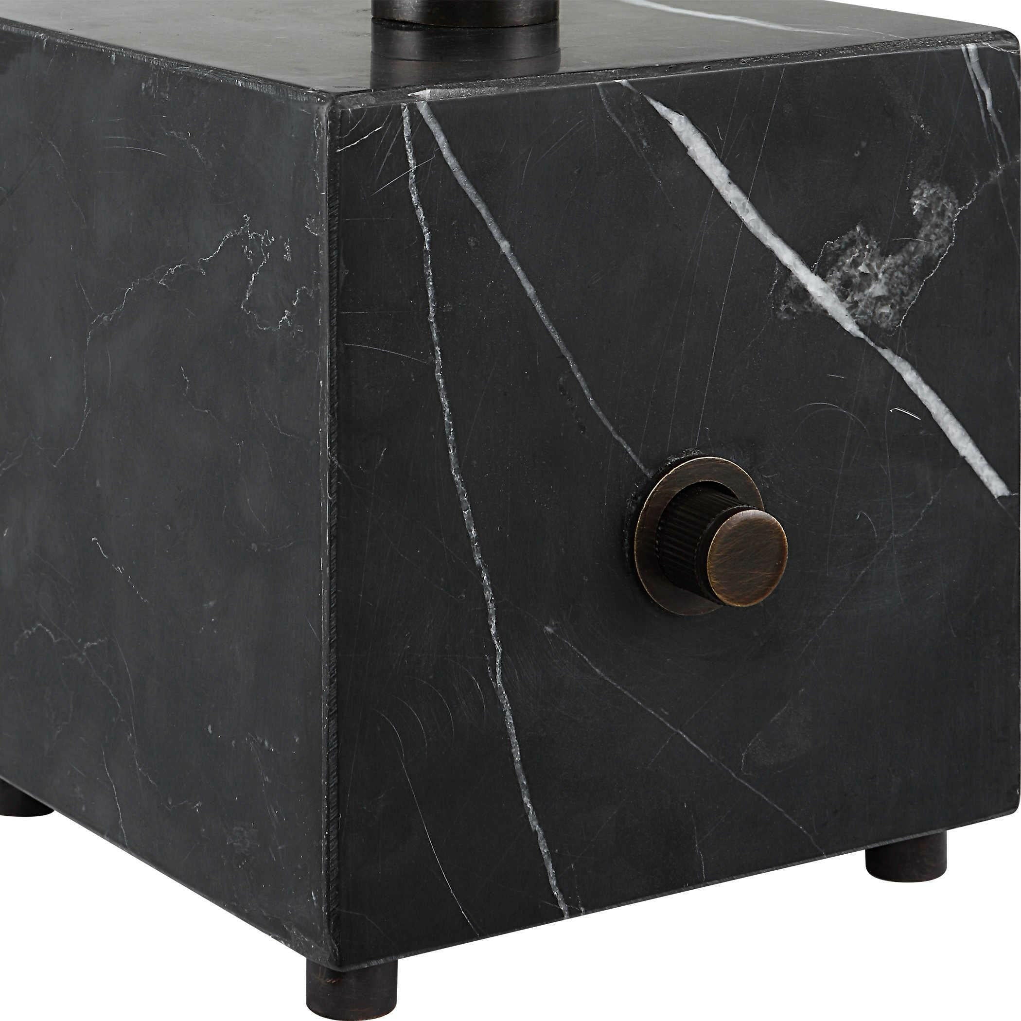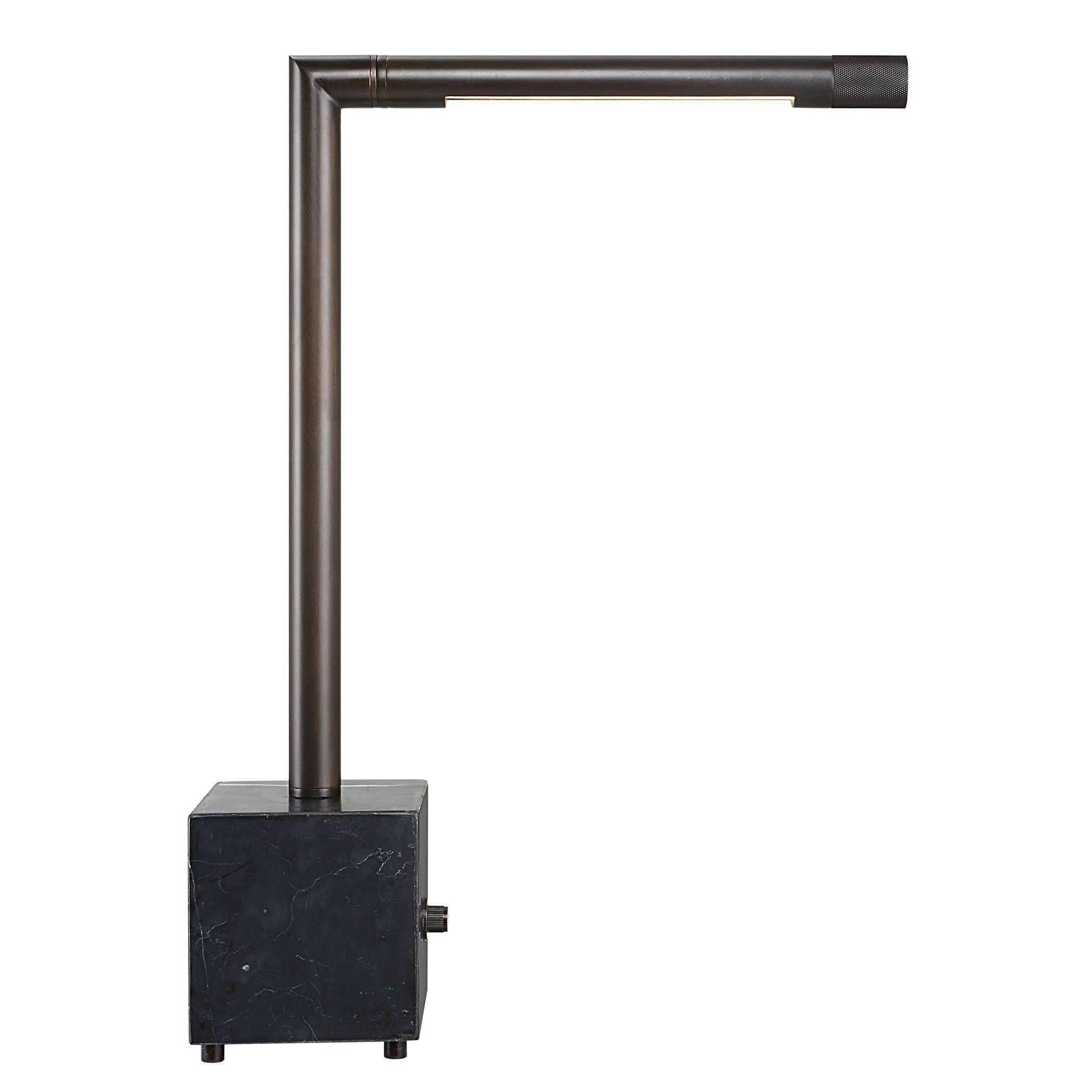 The Highlight Desk Lamp in black is a unique and stylish addition to any space. Its sleek and minimalist design makes it perfect for small spaces, while still providing ample light. The matte black metal arm can rotate 350 degrees and is finished with a knurled detail, adding a touch of sophistication. The sturdy black marble base with white veining features a knurled dimmer and four matte black feet for easy cord placement. This lamp uses an integrated LED light system, eliminating the need for a bulb and providing 54,000 hours of illumination.