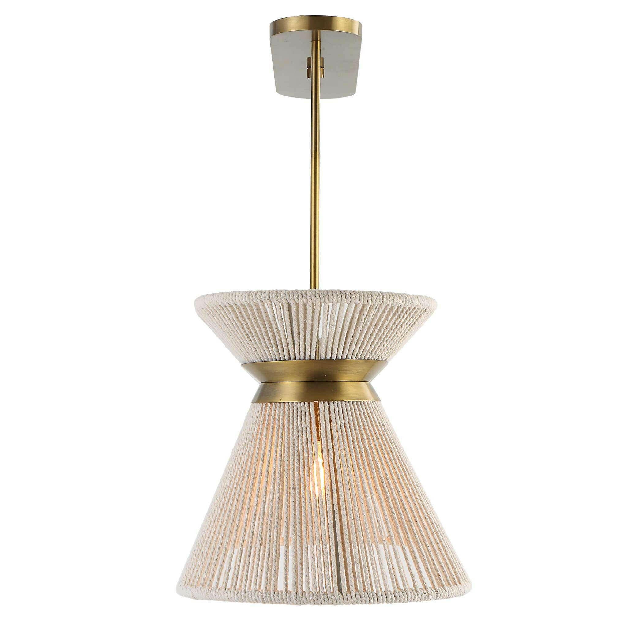 Introducing the Highly Strung, 5 Lt Linear Pendant in White - a truly unique and luxurious addition to any home. This stunning pendant features soft glowing light from five lights, dancing through an oversized shade wrapped in natural white twine. The cinched shade is finished with a light antique brass belt, adding a touch of elegance to the design.