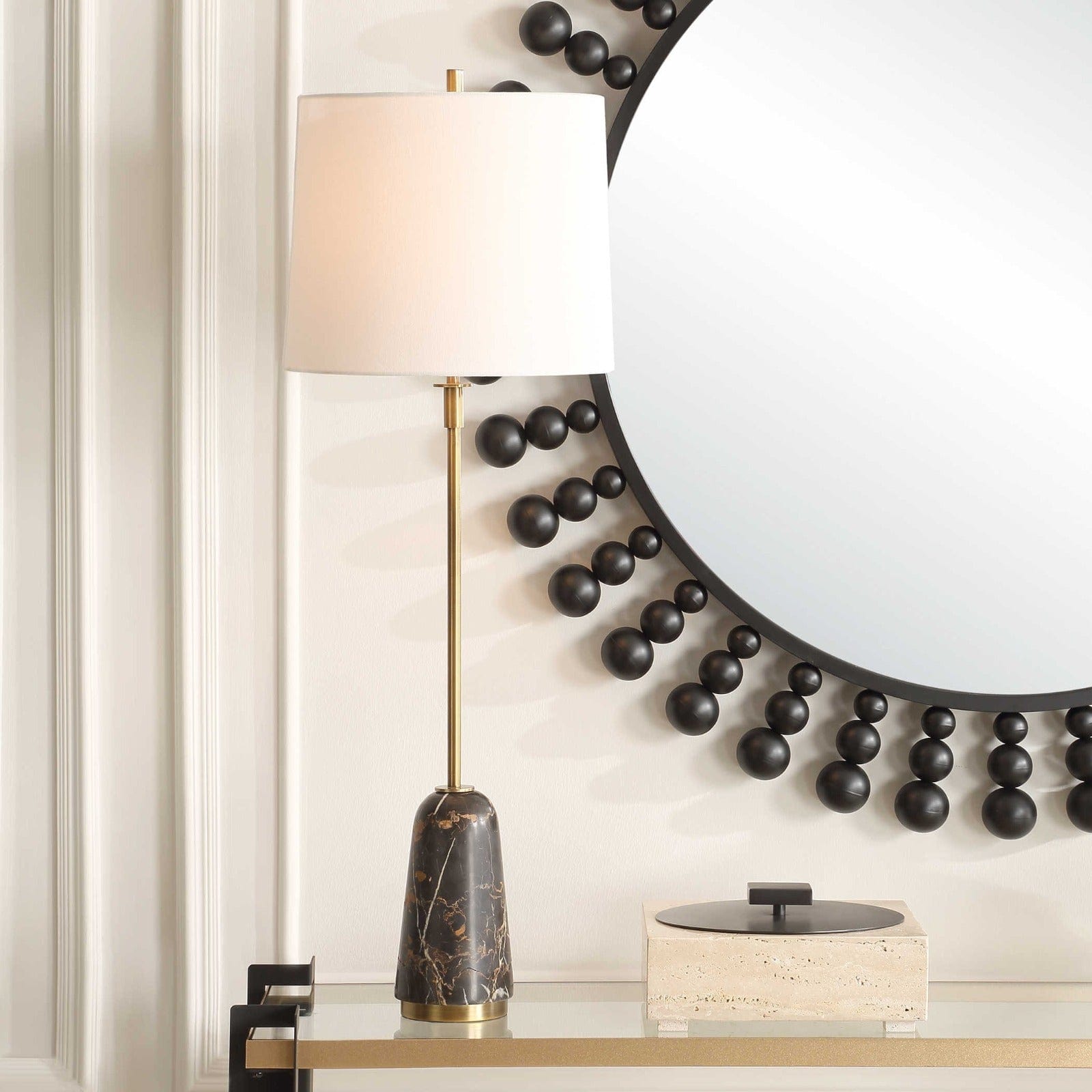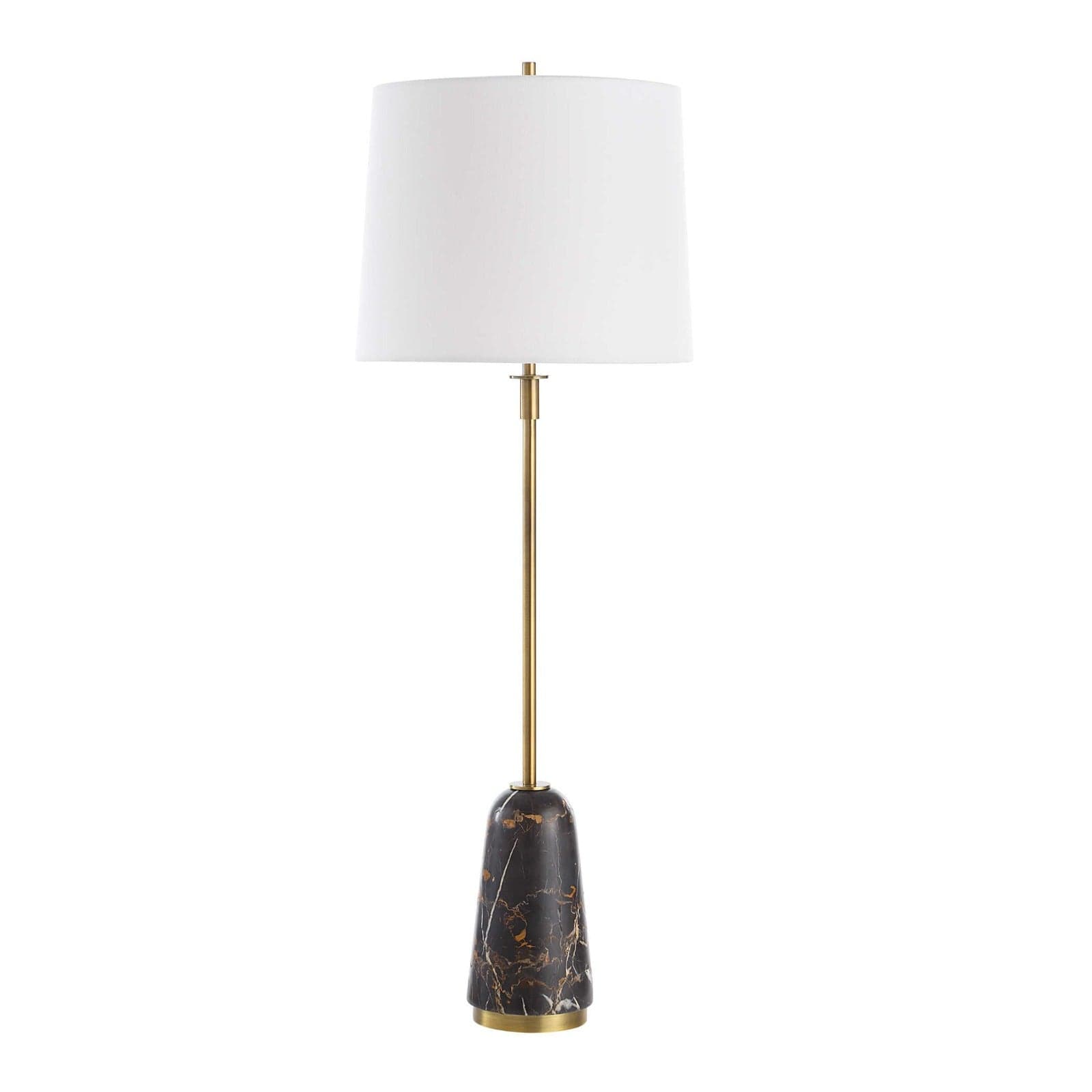 The Jenson Buffet Lamp is a truly unique and luxurious addition to any home. Its standout feature is the striking black marble base with beautiful brown and white veining, perfectly complemented by a plated brushed brass base. The lamp is topped off with a crisp white linen fabric shade, adding a touch of elegance to the overall design.