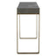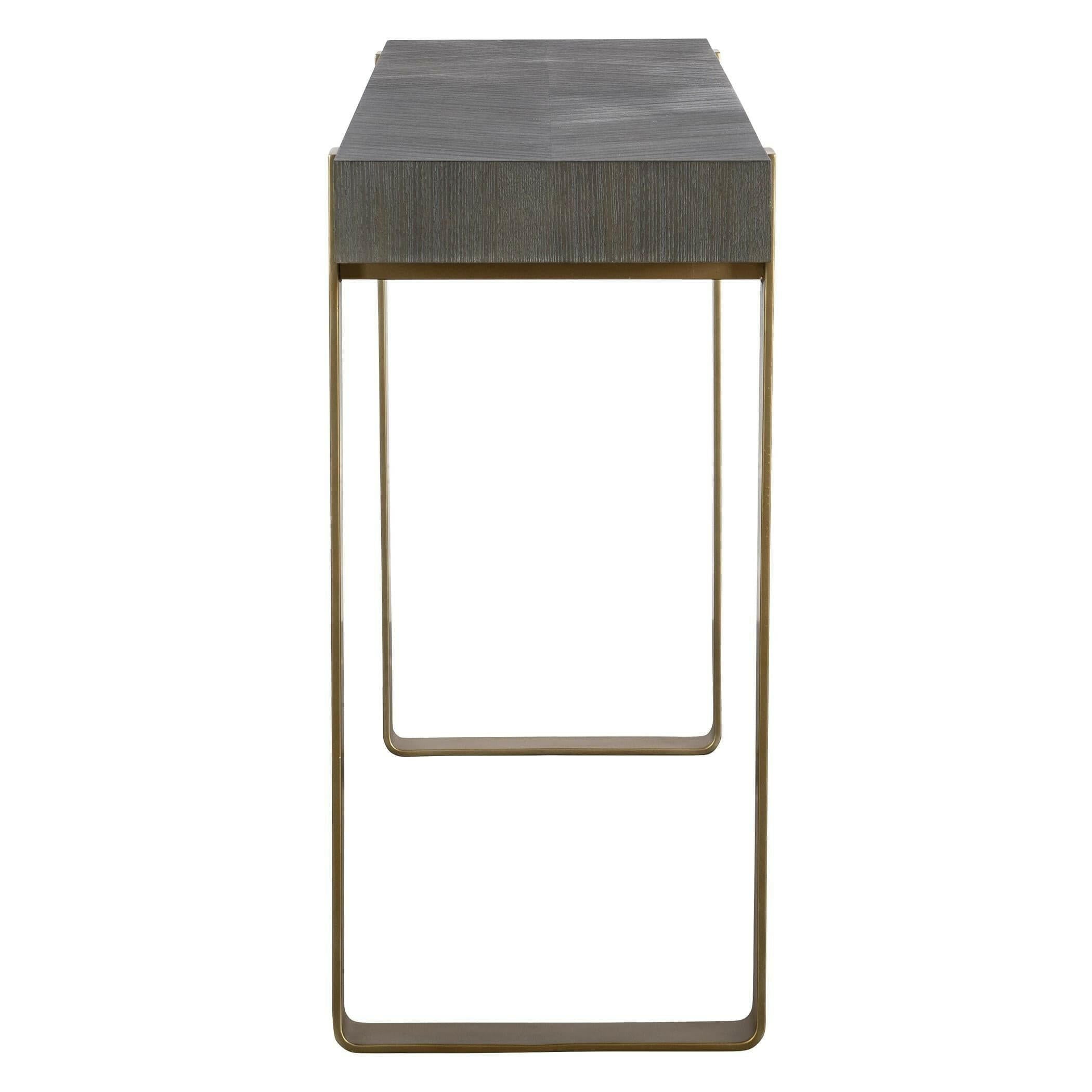 Introducing the Kea Contemporary Console Table, a truly unique piece that will elevate any space. Its striking diamond ash veneer top in a dark walnut stain with light gray glazing adds a touch of modern elegance. The iron strap legs, finished in warm brushed brass, provide a beautiful contrast and add to the overall luxurious feel of the table.