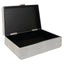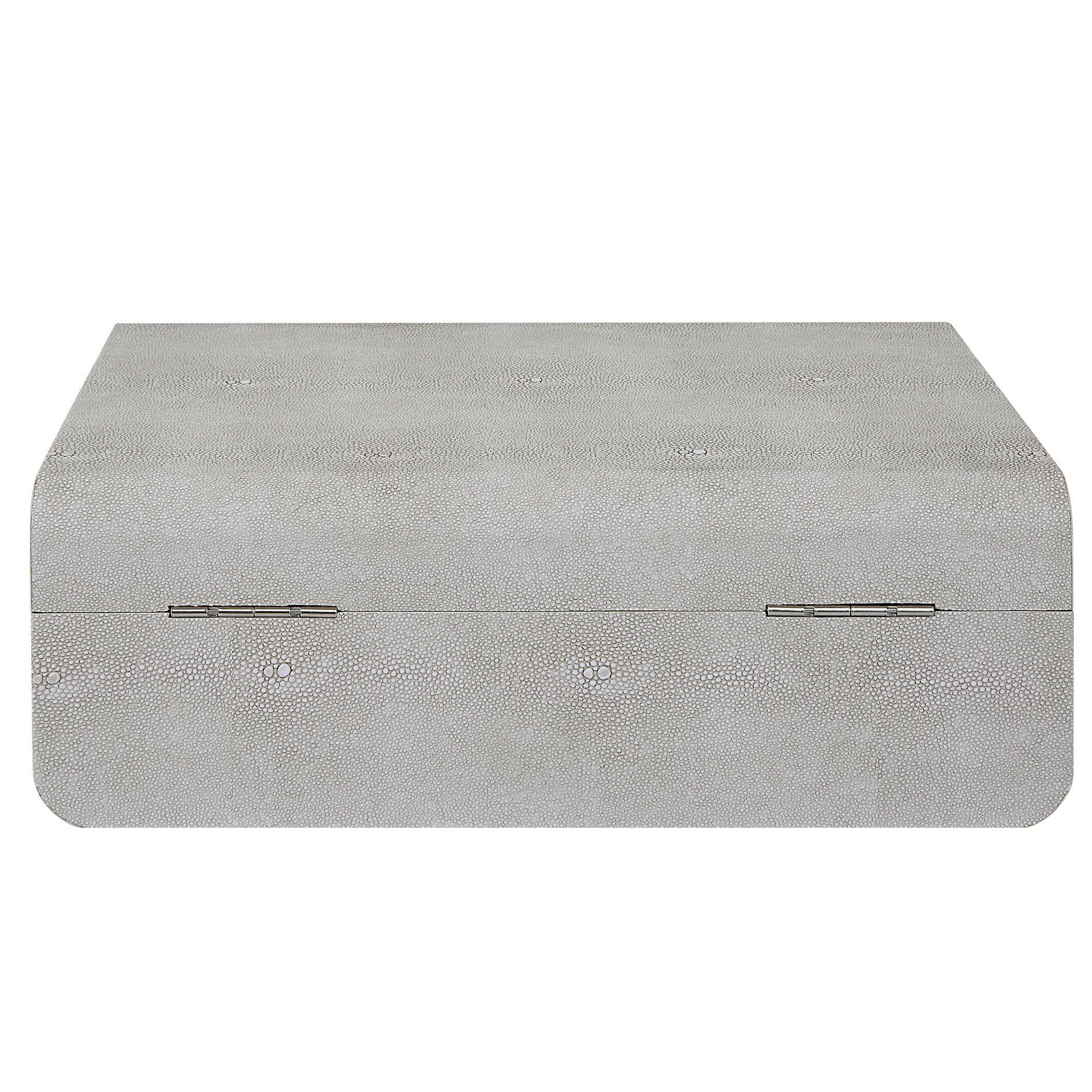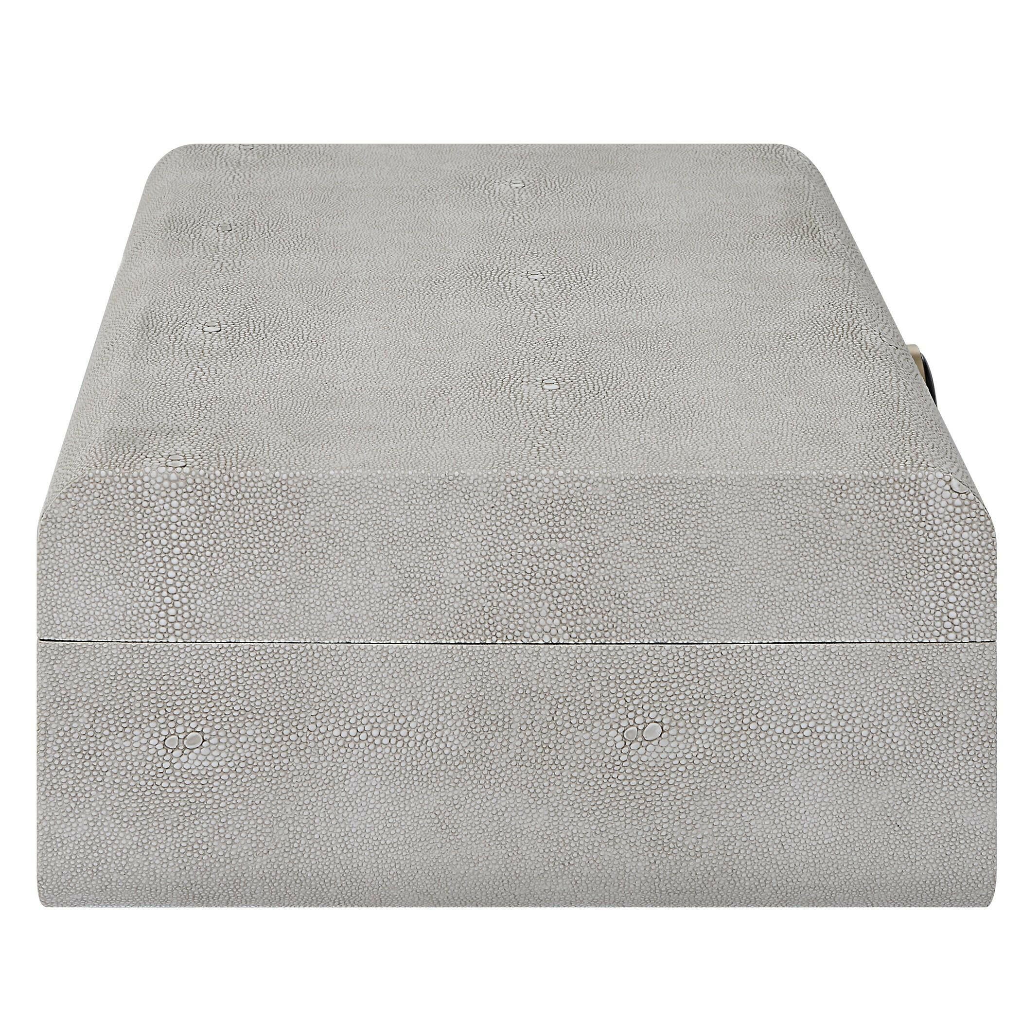 Introducing the Lalique White Shagreen Box, a truly unique and luxurious addition to any home. Inspired by the Art Deco era, this decorative box features a faux white shagreen wrapped exterior, accented by a brushed antique brass and black enamel closure. The interior is finished in matte black, adding a touch of sophistication to this already stunning piece.But the Lalique White Shagreen Box is more than just a beautiful decoration. It is a product of Uttermost, a family owned and managed US interior brand known for their upscale luxury aesthetic. With an extensive range of furniture, lighting, and accessories, Uttermost is home to some of the most talented designers in the industry, creating fresh and unique collections to beautify your home.At Uttermost, we believe that good design means nothing without quality manufacturing. That's why we take no shortcuts in the production of our products, ensuring that they exceed expectations in both design and durability. And with dimensions of 32.7 cm in width, 22.9 cm in depth, and 11.4 cm in height, the Lalique White Shagreen Box is the perfect size for any space.Experience the luxury and elegance of the Lalique White Shagreen Box, available now at House of Isabella. As a leading retailer of luxurious furniture, interiors, and accessories, we offer free UK delivery on all orders. Elevate your home with the Lalique White Shagreen Box and other exquisite pieces from House of Isabella.