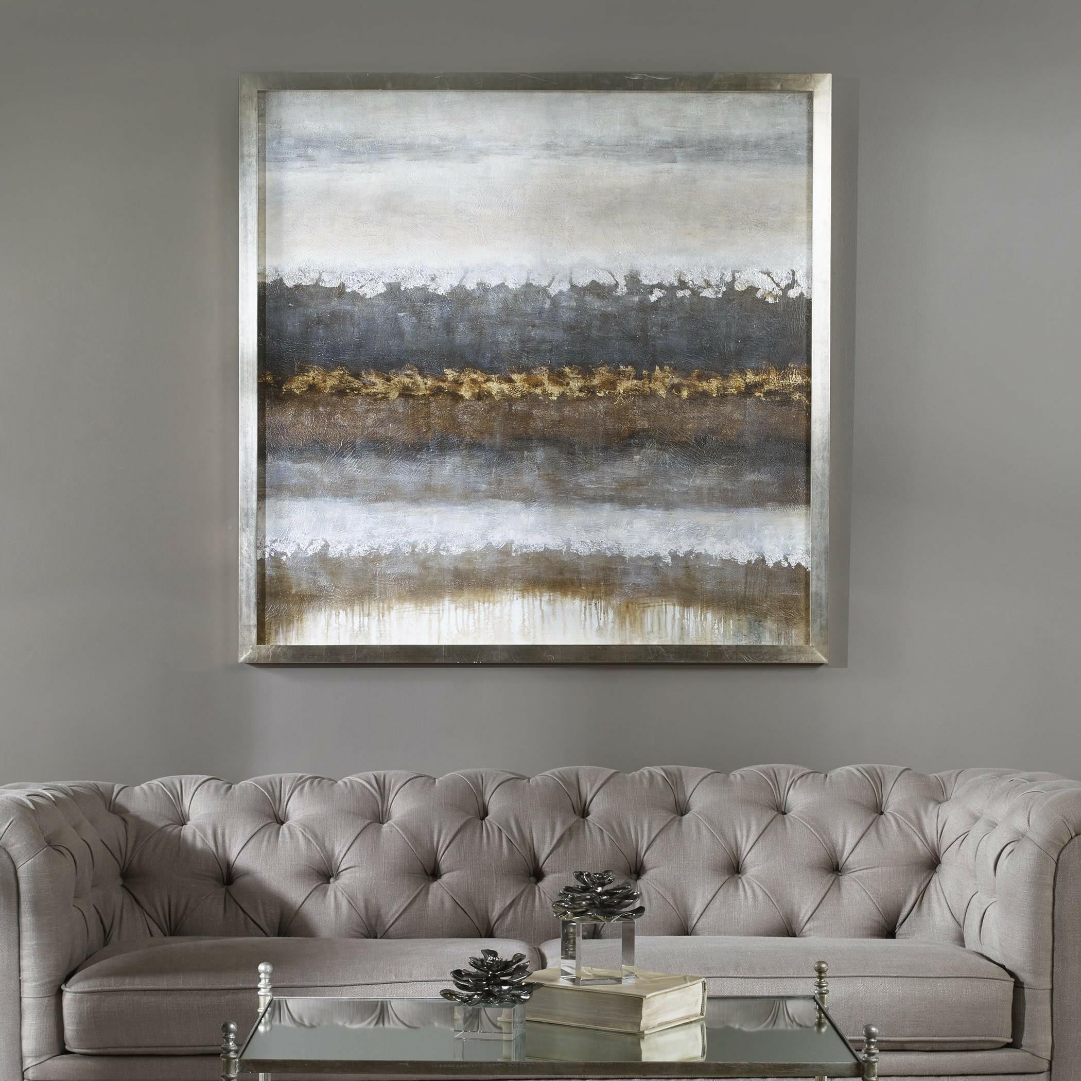 Introducing Layers Landscape Art - a truly unique and stunning addition to any home. This hand painted abstract on canvas features layered metallic neutrals, creating a masculine and industrial feel. The gold leaf accents add a touch of luxury against the brown, charcoal, and gray background. Each canvas is stretched and applied to a wooden frame, surrounded by a champagne silver frame. Due to the handcrafted nature of this artwork, each piece may have subtle differences, making it truly one-of-a-kind.