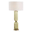 The Mirah Table Lamp from House of Isabella is a truly unique and elegant piece that will make a statement in any room. Its tall, transparent Olive glass is adorned with slim vertical fluting, catching the light on every curve. The brass-plated details add a touch of luxury to the lamp. The round hardback drum shade, made with crisp white linen fabric, completes the look.