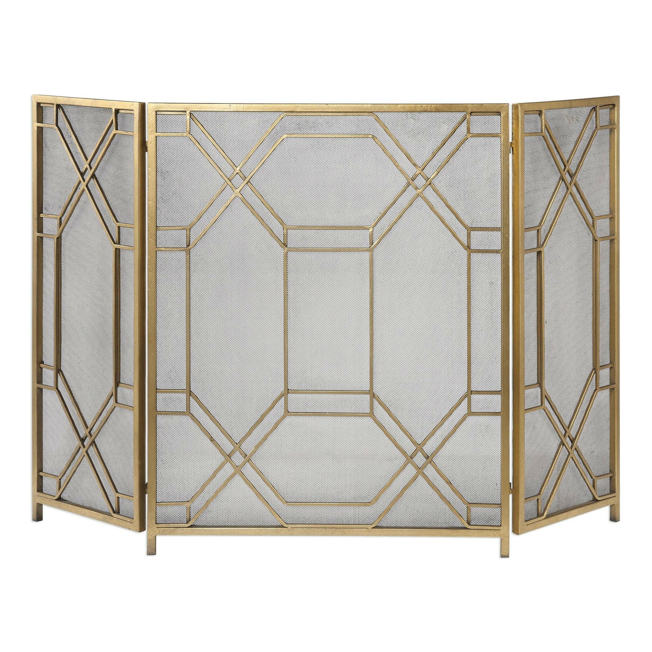 The Rosen Gold Fireplace Screen from Uttermost is a truly unique and luxurious addition to any home. Made from forged iron and finished in lightly antiqued gold leaf, this fireplace screen is not only functional but also adds a touch of elegance to your living space. The center panel is 26' wide, while the side panels are each 13' wide, making it the perfect size for most fireplaces. Uttermost is a family owned and managed US interior brand known for its upscale luxury aesthetic. With an extensive range of furniture, lighting, and accessories, our talented designers create fresh and unique collections to beautify your home. We prioritize quality manufacturing to ensure our products exceed expectations. The dimensions of this fireplace screen are 133.3 cm in width, 2.2 cm in depth, and 86.4 cm in height. Elevate your home with the Rosen Gold Fireplace Screen from Uttermost, available at House of Isabella with free UK delivery.