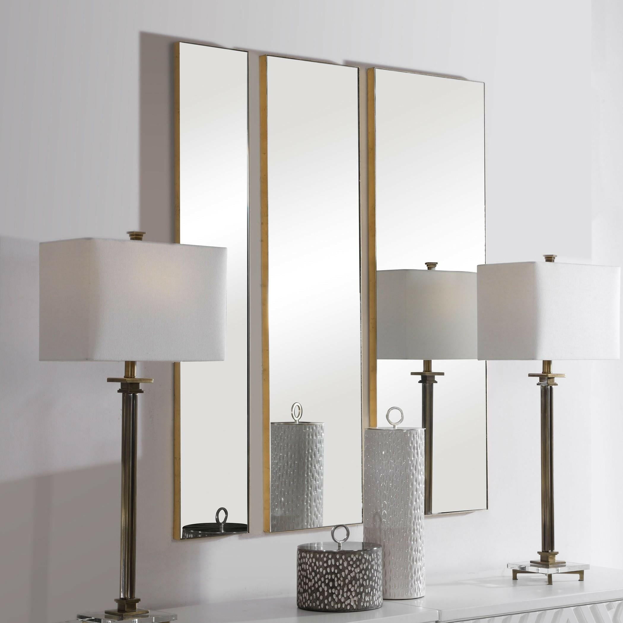 Introducing the Rowling Gold Mirrors, a set of three stunning mirrors that will elevate any space with their simple yet elegant design. These mirrors feature clean lines and a gold leaf finished metal profile frame, adding a touch of luxury to your home. What makes these mirrors truly unique is their versatility - they can be hung horizontally or vertically, giving you endless modern display options.At Uttermost, a family owned and managed US interior brand, we pride ourselves on our upscale luxury aesthetic. Our team of talented designers constantly create fresh and unique collections to beautify your home. But we also understand that good design means nothing without quality manufacturing. That's why we ensure that no shortcuts are taken in the production of our products, guaranteeing that they exceed expectations.The dimensions of these mirrors are as follows: Width: 40.6 cm, Depth: 2.9 cm, Height: 119.4 cm. This makes them the perfect size to add a touch of glamour to any room in your home. And with free UK delivery, it's never been easier to bring a touch of luxury into your space.Experience the ultimate in luxurious furniture and interiors with House of Isabella. Our carefully curated selection of furniture, lighting, and accessories will transform your home into a stylish haven. Shop now and elevate your space with the Rowling Gold Mirrors.