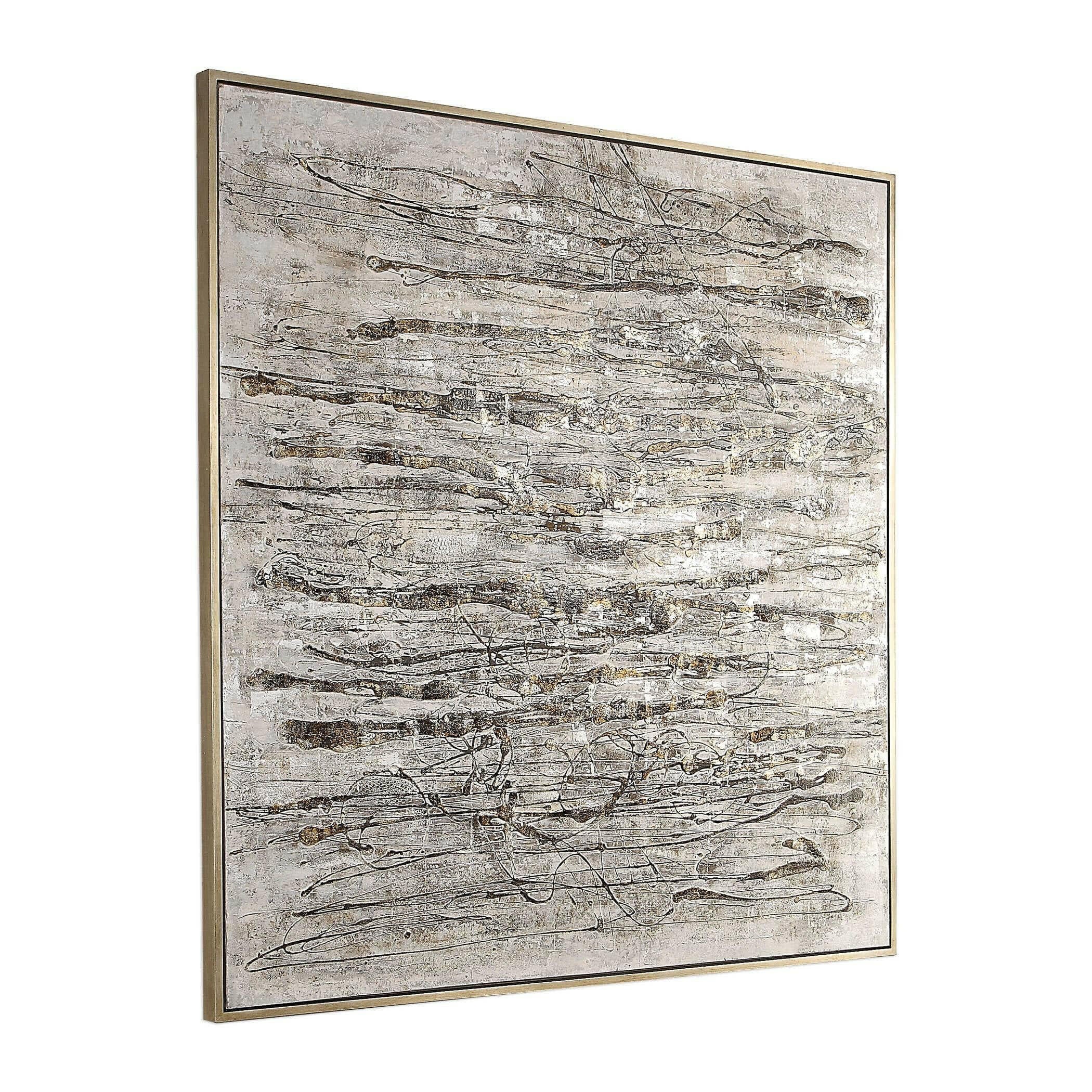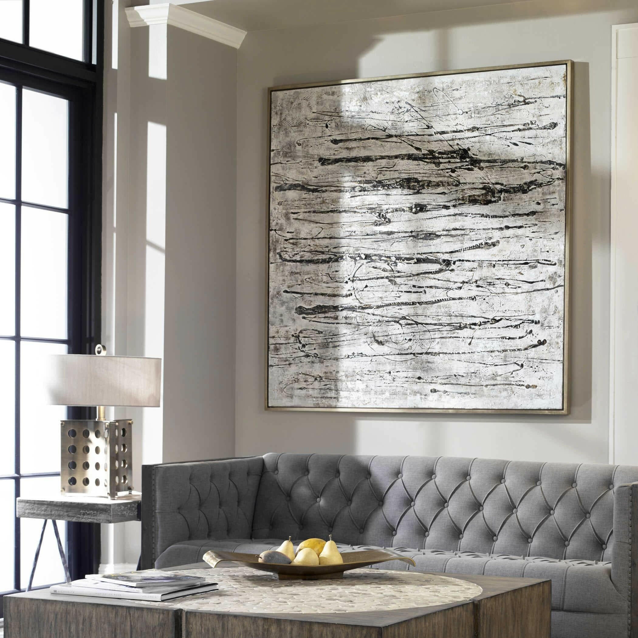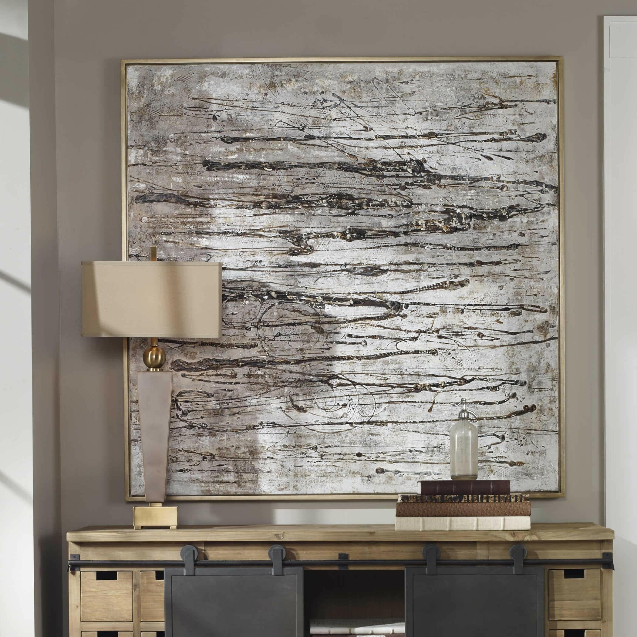 Introducing the Black Label Scribbles Hand Painted Canvas, a truly unique piece that exudes modern, industrial style. This handcrafted abstract artwork features a stunning array of textured gray, brown, white, and off white brushstrokes, accented by black and metallic silver shades for added dimension. The silver gallery frame adds a touch of elegance to this already striking piece. Each canvas is hand painted, making each one subtly different and truly one-of-a-kind. Hang it horizontally or vertically to suit your space.