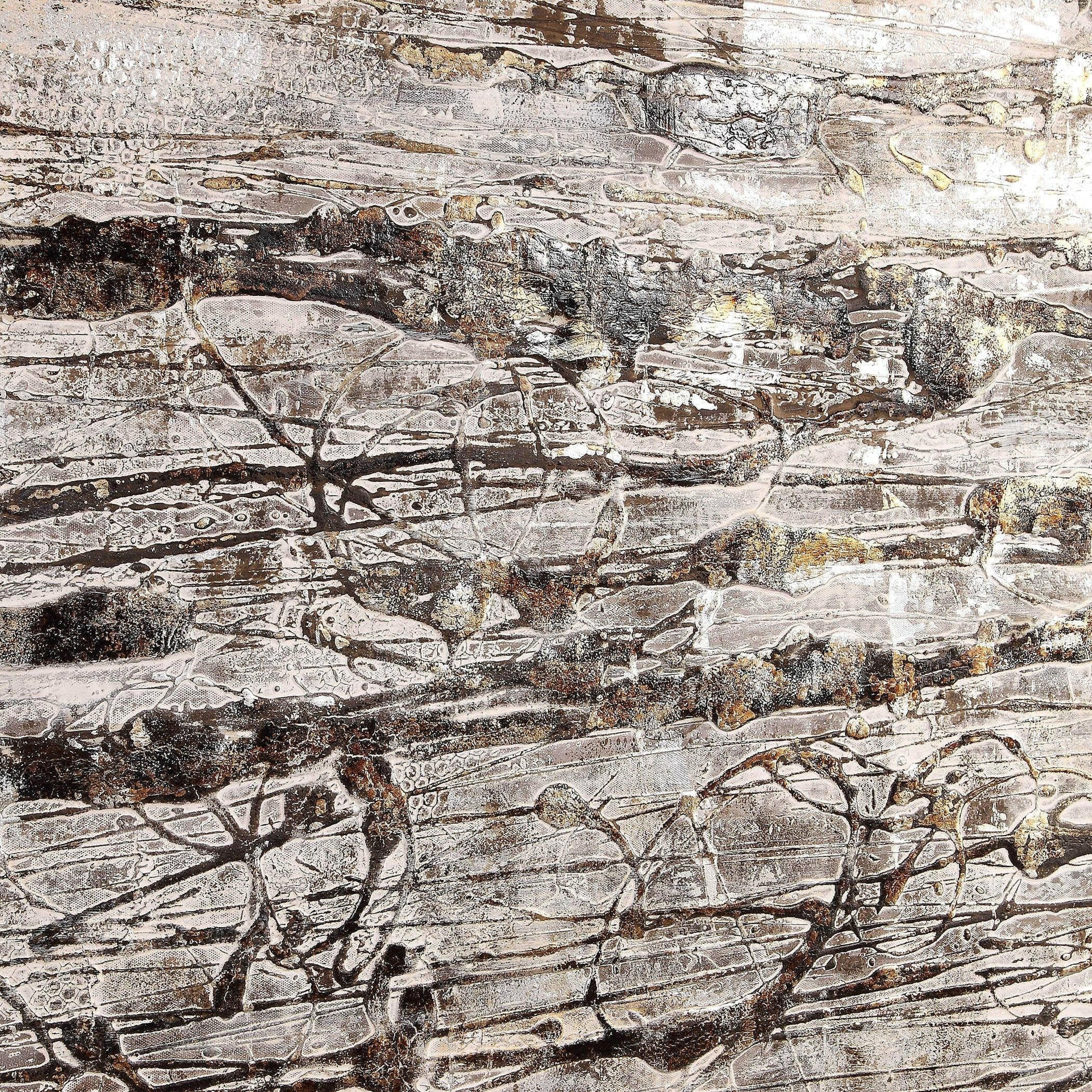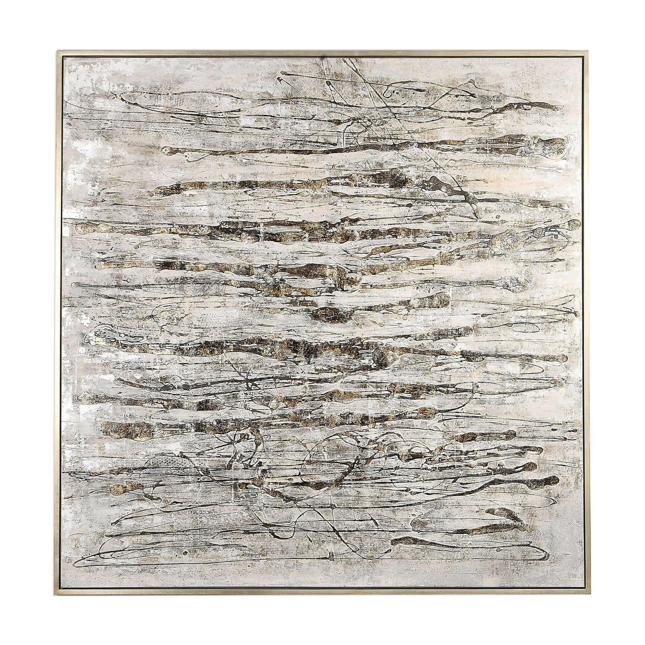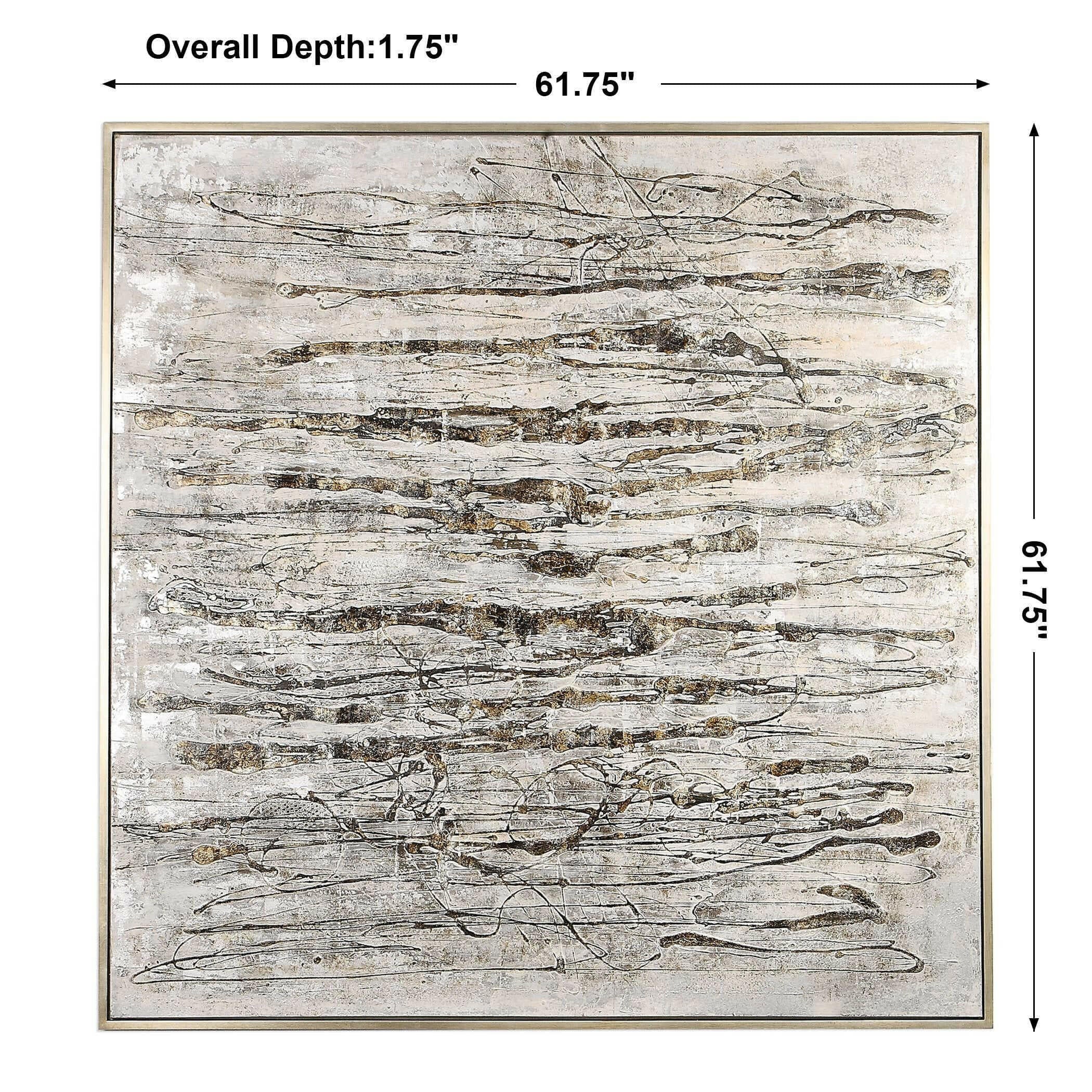 Introducing the Black Label Scribbles Hand Painted Canvas, a truly unique piece that exudes modern, industrial style. This handcrafted abstract artwork features a stunning array of textured gray, brown, white, and off white brushstrokes, accented by black and metallic silver shades for added dimension. The silver gallery frame adds a touch of elegance to this already striking piece. Each canvas is hand painted, making each one subtly different and truly one-of-a-kind. Hang it horizontally or vertically to suit your space.