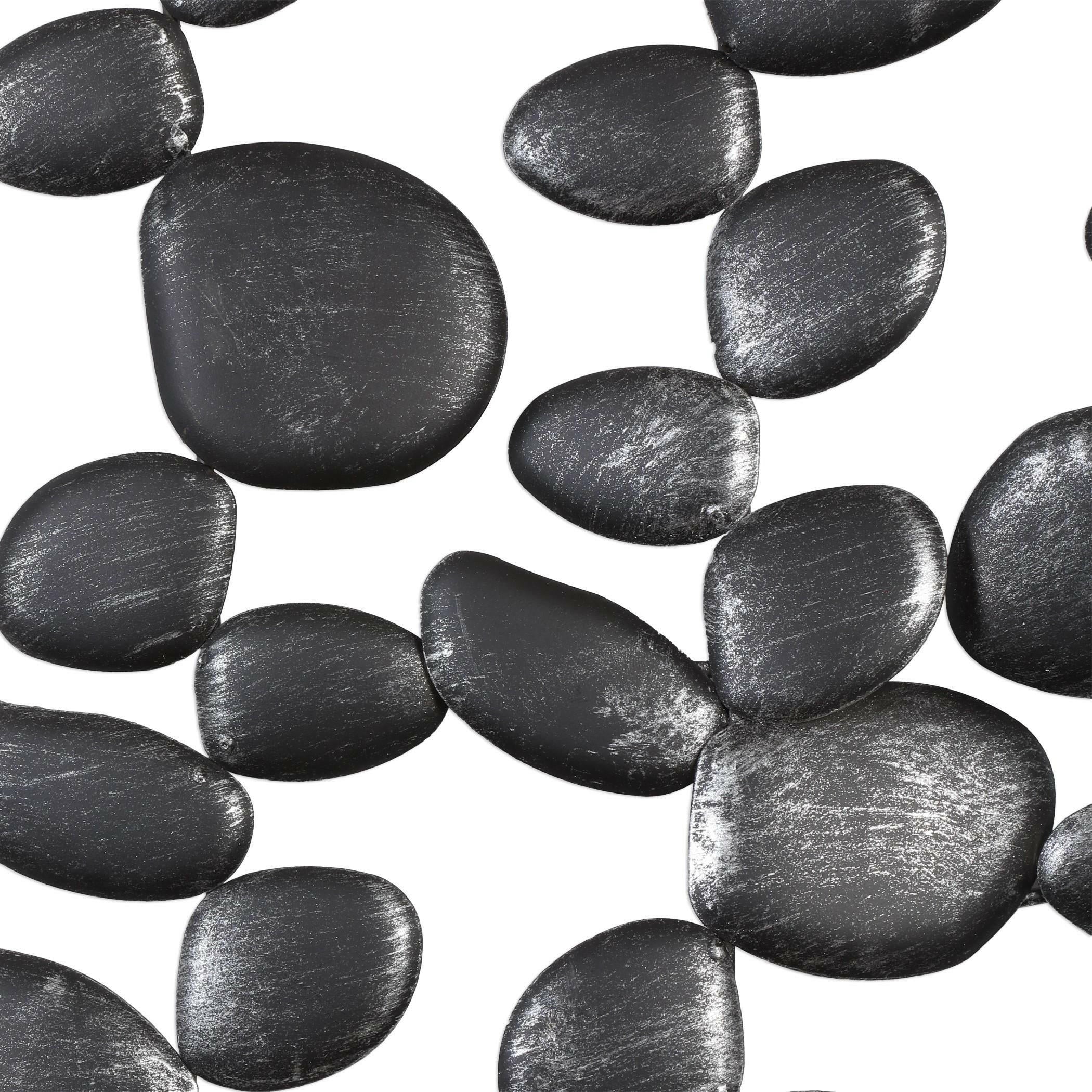 Introducing the Skipping Stones Forged Iron Wall Art, a unique and eye-catching piece that will add a touch of elegance to any room. This wavy 3-dimensional art is crafted from hand forged iron and finished in a charcoal black with silver undertones, giving it a sleek and modern look. Reminiscent of smooth stone pebbles in rippling water, this wall art is sure to be a conversation starter.