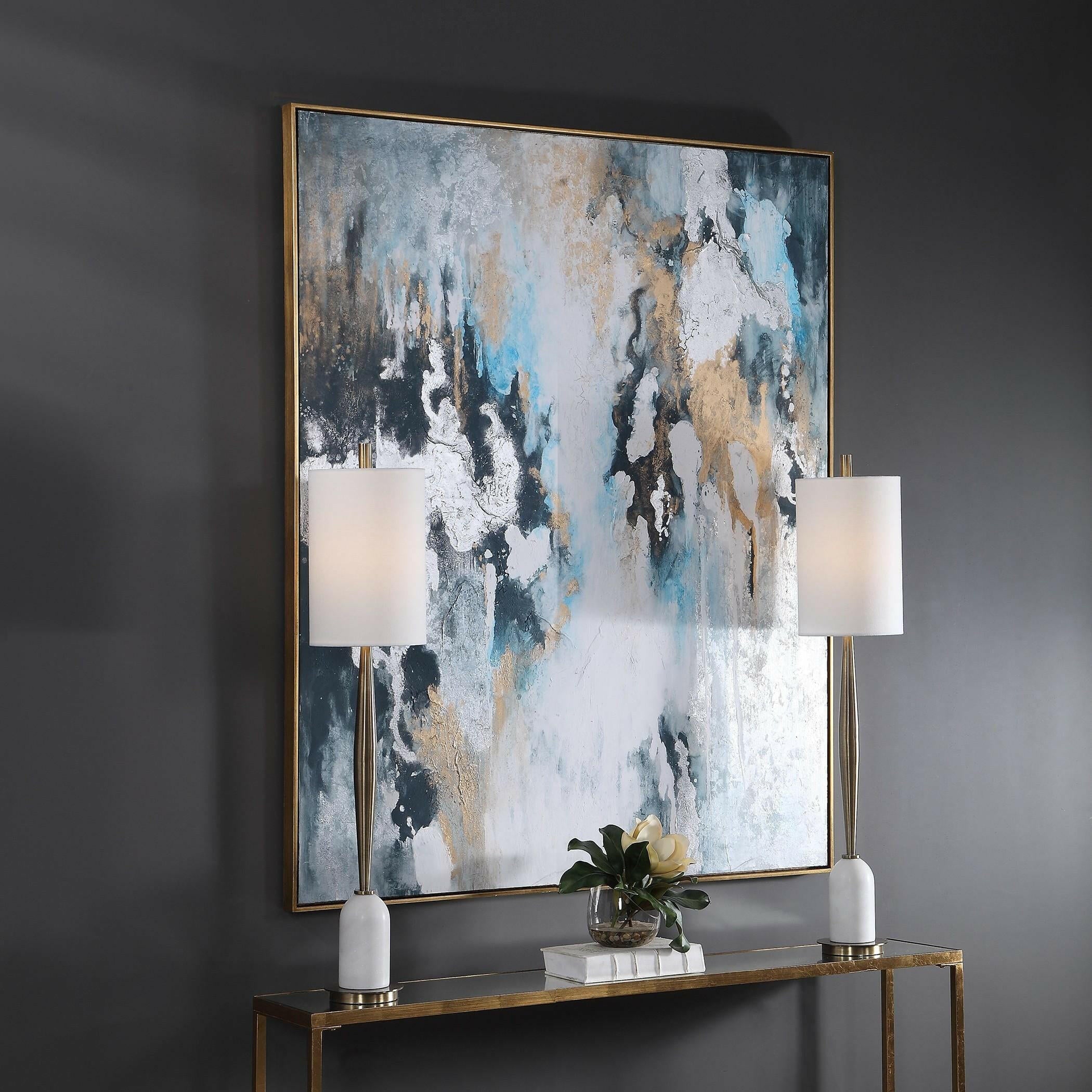 This Stormy Seas Hand Painted Canvas is a truly unique piece of artwork that will add a touch of luxury to any home. The large brushstrokes and heavy texture create a stunning visual effect, while the dark teal and light blue shades are beautifully complemented by gold and silver leaf accents. The canvas is surrounded by a gold leaf gallery frame, adding an elegant touch to the overall design. Each piece is handcrafted, making it one-of-a-kind and adding subtle differences that make it even more special. This versatile piece can be hung horizontally or vertically, allowing you to customize its placement in your home. Uttermost is a family owned and managed US interior brand that prides itself on its upscale luxury aesthetic. With an extensive range of furniture, lighting, and accessories, we have some of the most talented designers in the industry creating fresh and unique collections to beautify your home. We are dedicated to bringing you the most fashion-forward products, while also ensuring that quality manufacturing is never compromised. You can trust that our products will exceed your expectations. The dimensions of this Stormy Seas Hand Painted Canvas are 129.5 cm in width, 4.3 cm in depth, and 154.9 cm in height, making it a statement piece that will surely catch the eye of anyone who enters your home. At House of Isabella, we offer luxurious furniture, interiors, and free UK delivery, making it easy for you to elevate your home with our stunning products. Trust us to bring you the best in design and quality, and add this beautiful canvas to your collection today.