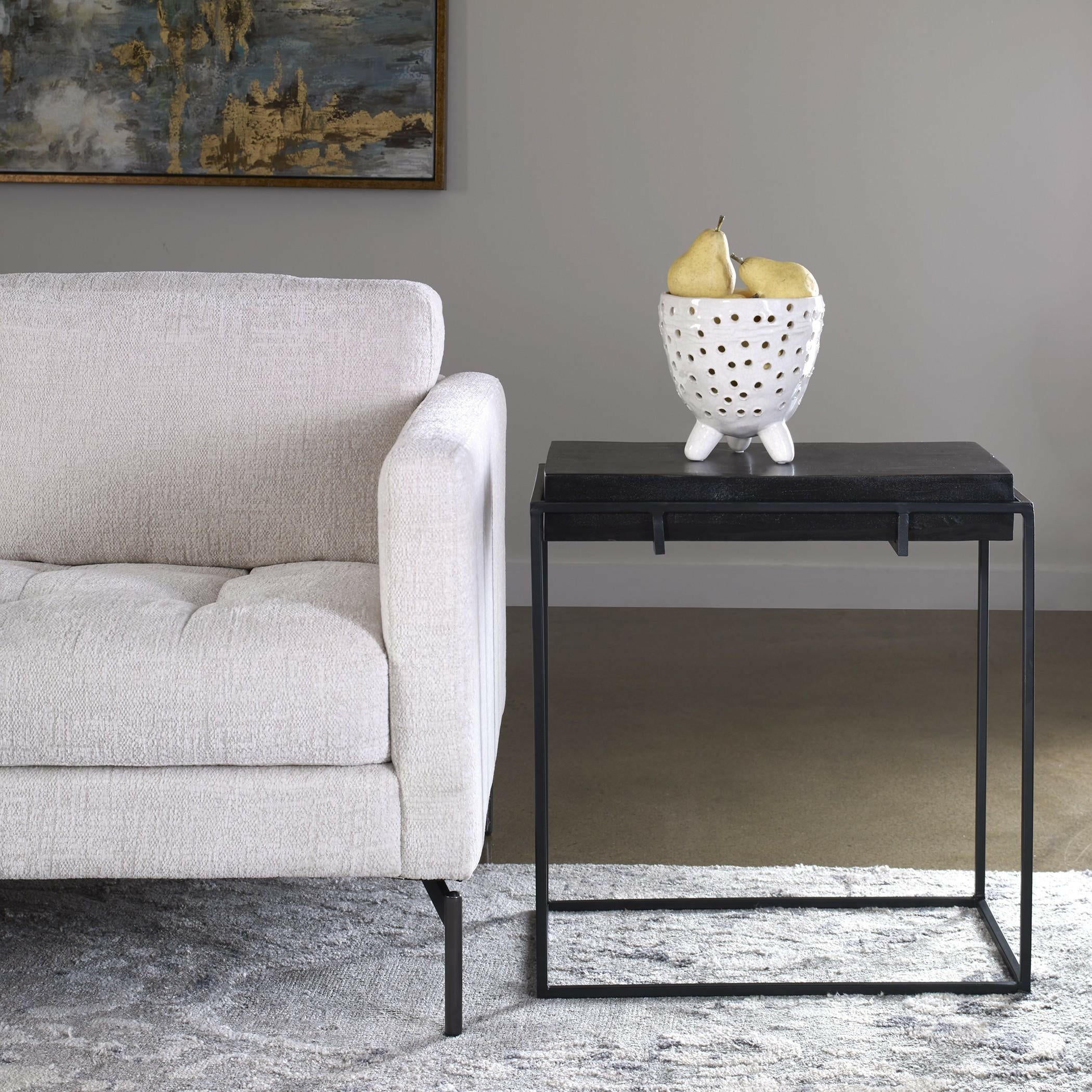 The Telone Modern Black Side Table from Uttermost is a truly unique piece that will elevate any room in your home. With its modern minimalist styling, this side table features a thick cast aluminum top with natural texturing finished in a plated antique black. It rests on a coordinating aged black iron base, adding a touch of industrial charm to its overall design.