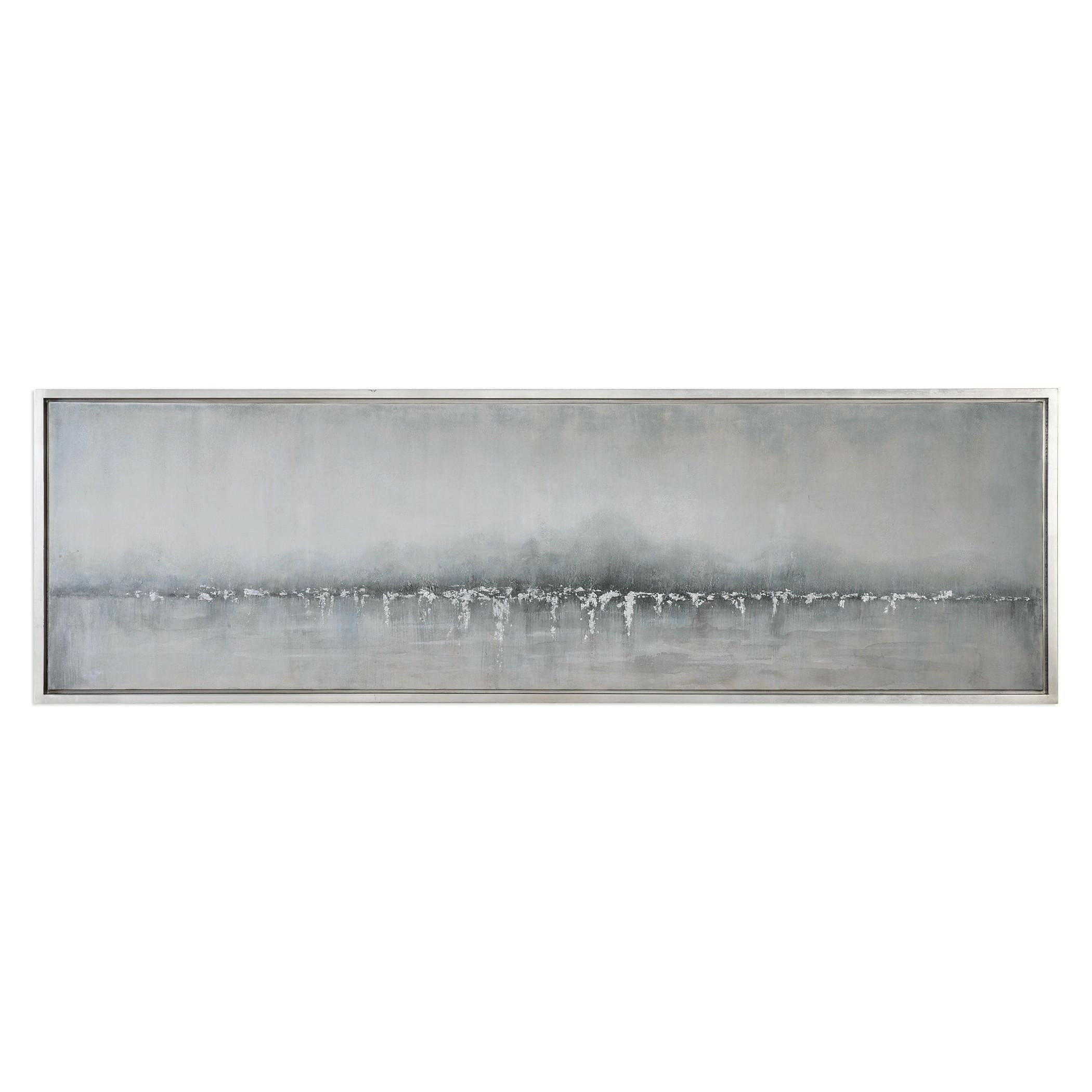 Tides Edge Abstract Art is a one-of-a-kind piece that will elevate any room in your home. Hand painted on canvas, this artwork boasts a versatile color palette of light gray, cream, and icy blue, accented with silver leaf details. Each piece is unique due to its handcrafted nature, adding a special touch to your decor. The canvas is stretched and encased in a silver leaf gallery frame, creating a luxurious and upscale aesthetic.