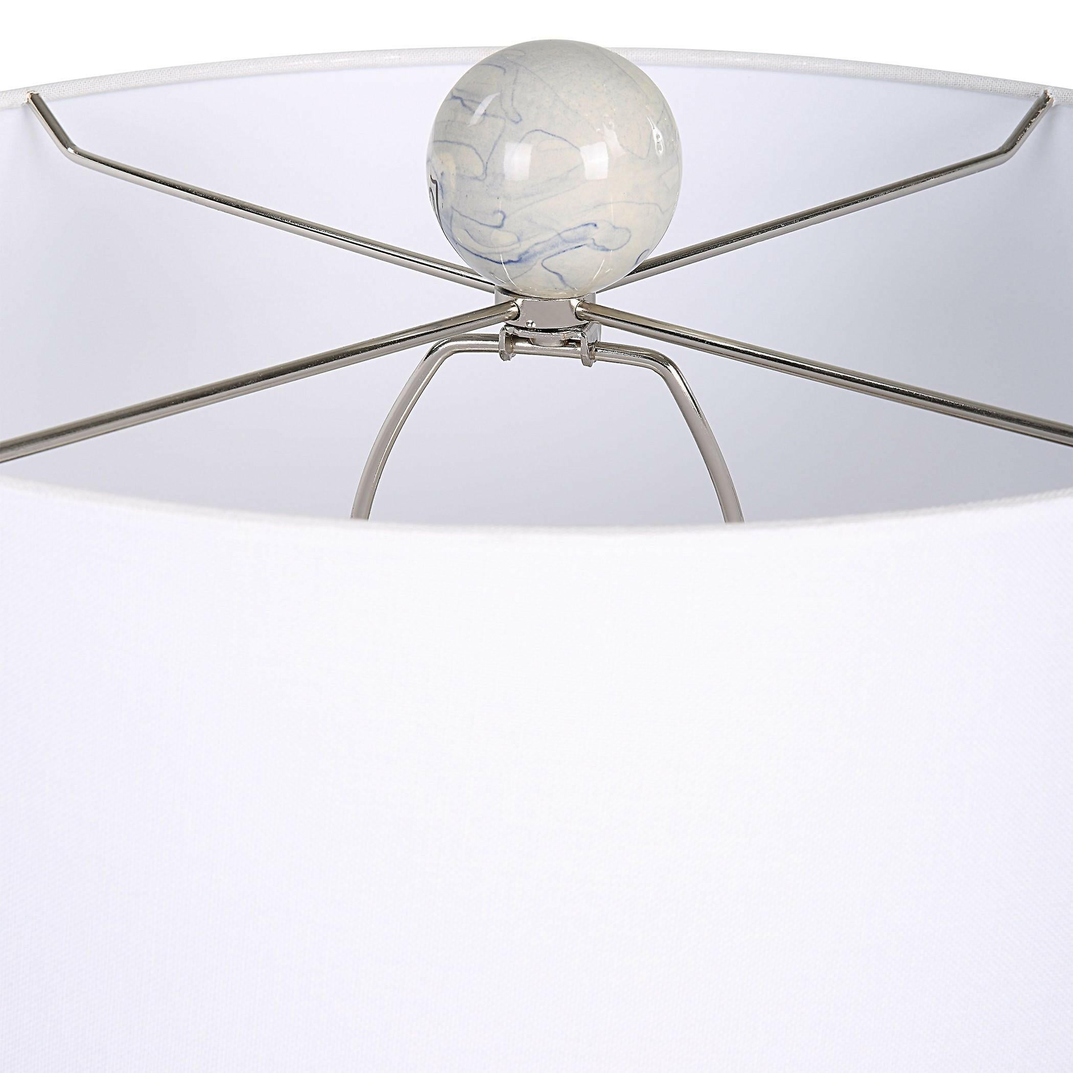 The Waves Blue & White Accent Lamp from House of Isabella is a truly unique piece that combines contemporary design with classic blue and white ceramics. The lamp features a sculpted design with a hand applied light cobalt blue drip glaze, giving it a one-of-a-kind look. The oversized matching ceramic finial adds an extra touch of elegance to this already stunning piece.