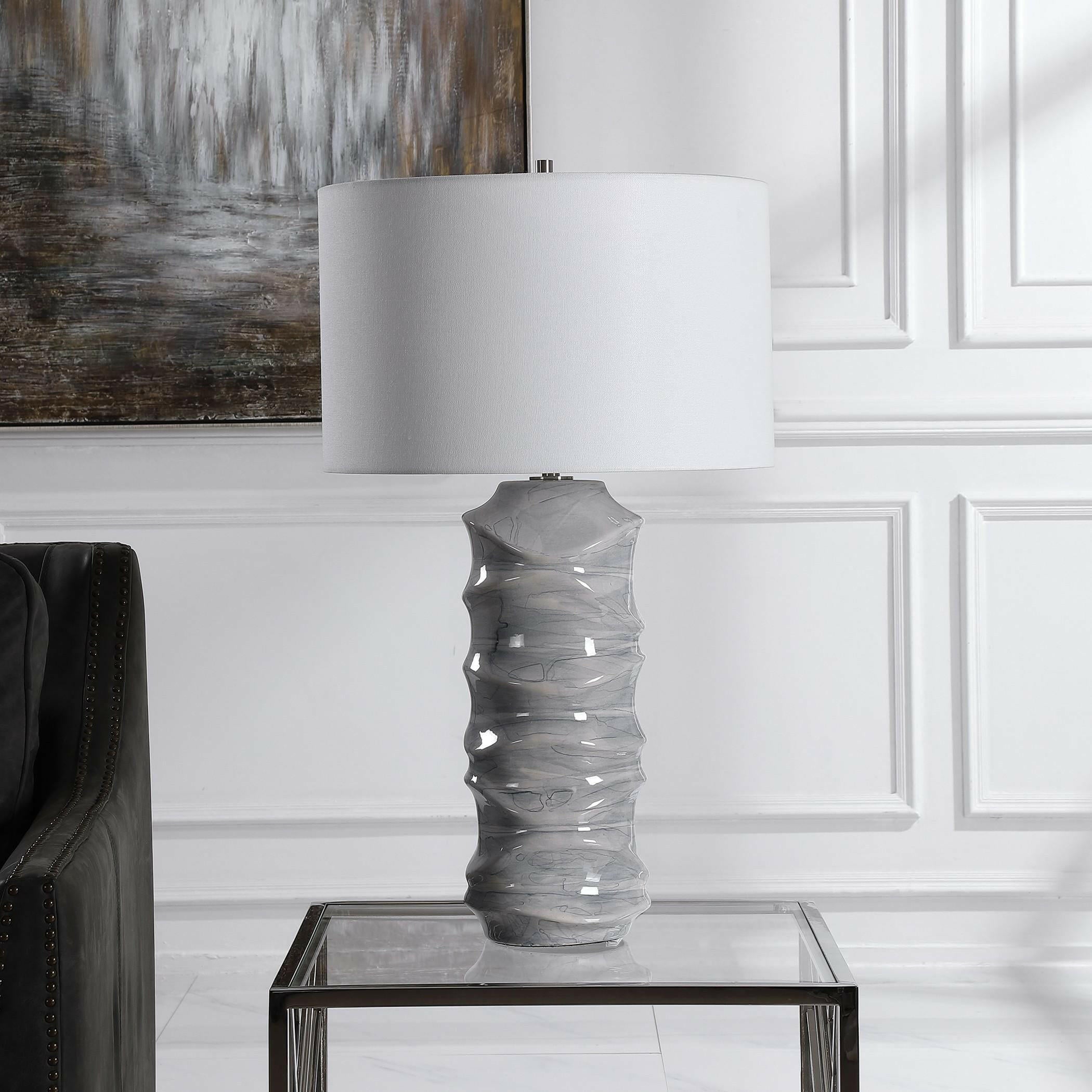 The Waves Blue & White Table Lamp from House of Isabella is a truly unique piece that will add a touch of contemporary elegance to any room. The lamp features a sculpted design with a hand applied light cobalt blue drip glaze, giving it a one-of-a-kind look. Paired with a crisp white hardback drum shade, this lamp is both stylish and functional.