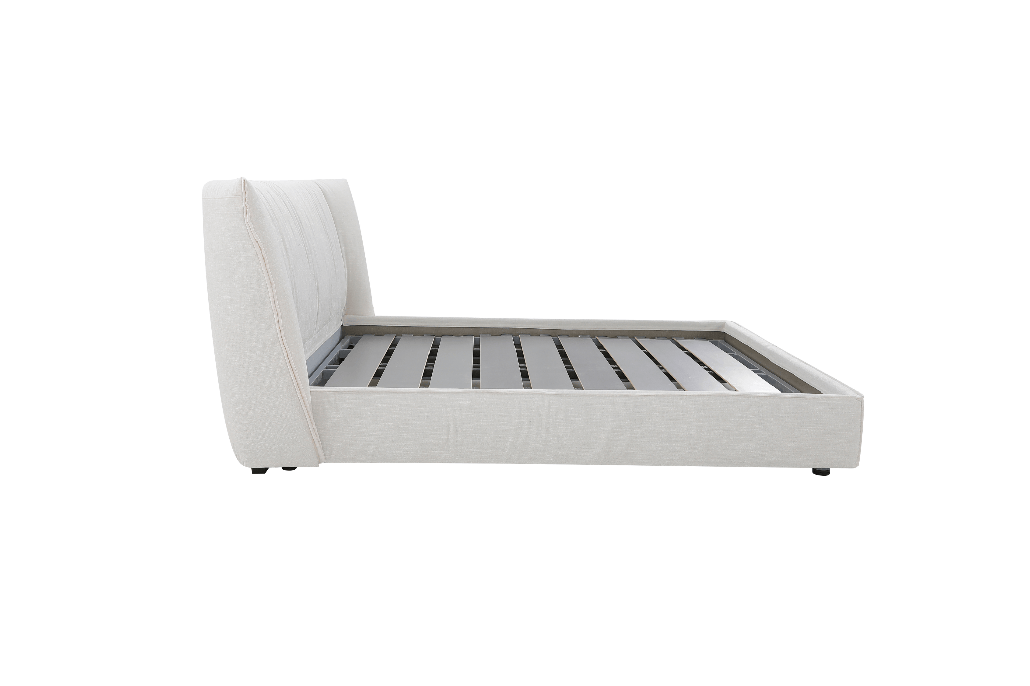 Upholstered in soft beige fabric for a calm, versatile look