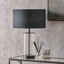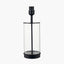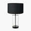 Industrial in design. The matt black metalwork on this table lamp base contrasts the crisp clear glass giving it an edge. Paired with our simple yet modern black cylinder cotton mix lamp shade which finishes this classic look.