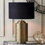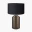 Made in India, hand-hammering has been used to create this beautifully charming, yet contemporary antique brass, metal table lamp base. The stunning table lamp base is enhanced further with the simple, modern black cylinder lamp shade, which completes the look perfectly.