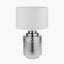 Our stylish silver metal table lamp is lovingly made in India using the long-standing technique of hand-hammering to create this beautifully textured and charming metal table lamp base. The white, lined cylinder lamp shade, in an open weave fabric complements the base perfectly.