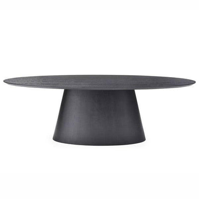 Make a lasting impression in your dining room with the exquisite Tavamo Dining Table. This statement piece of furniture features a geometric wooden base and a sleek black oak veneer top, combining modern design with timeless elegance. What sets this table apart is its unusual oval shape, making it a truly unique addition to your space. The distinctive silhouette adds a touch of intrigue and sophistication, ensuring that your dining area becomes the focal point of conversation and admiration.