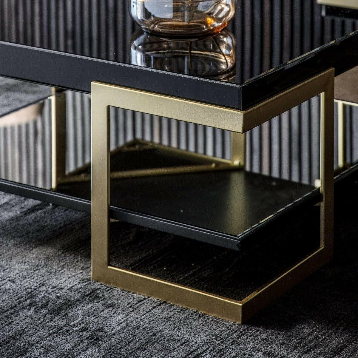Introducing the Arlesey Coffee Table, the perfect addition to any luxurious living space. This glamorous and sophisticated piece features a bold metal base in a soft gold finish, paired with black glass tops and shelves for the ultimate in Luxe living. With its sleek design and high-quality materials, this coffee table is sure to elevate the style of any room.