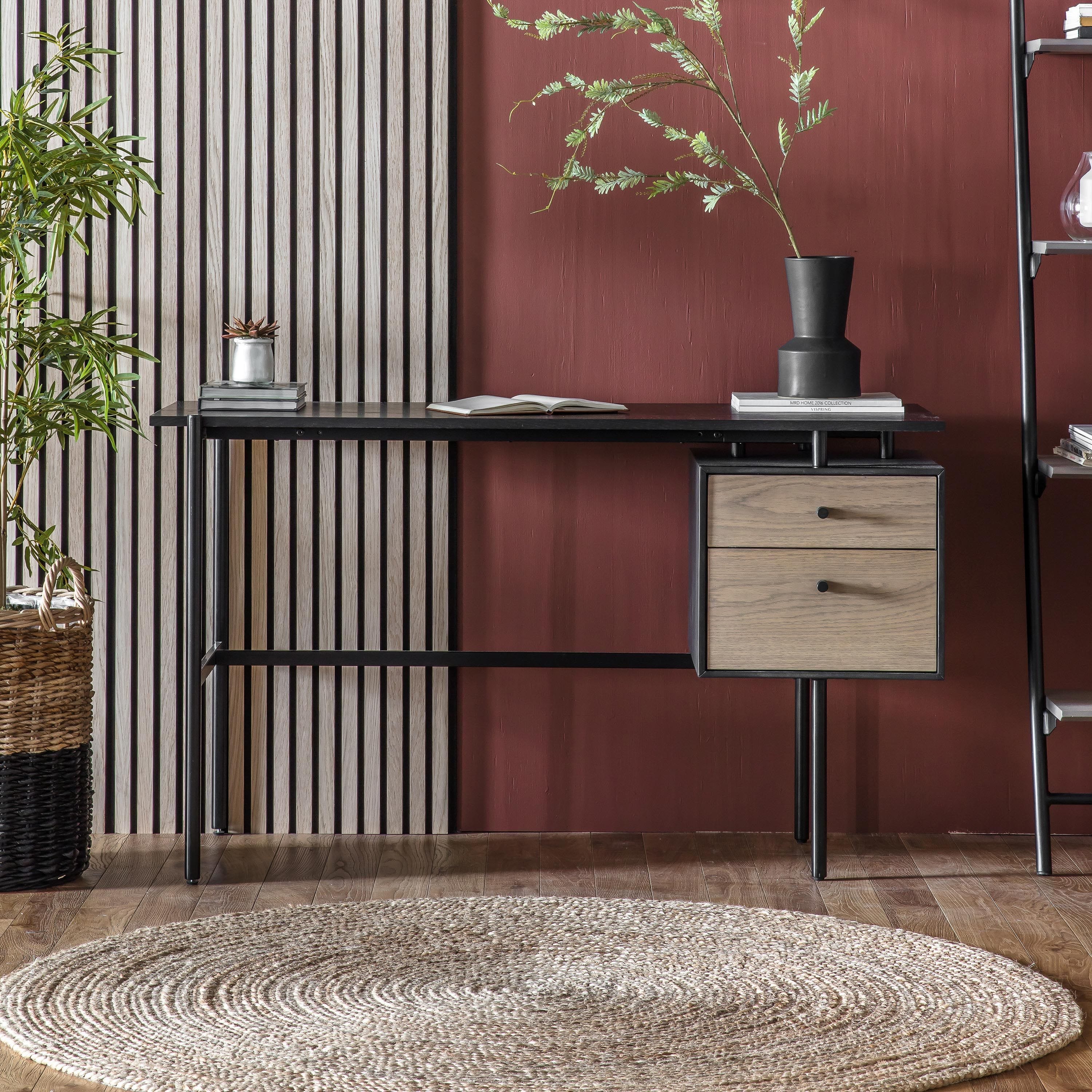 Introducing the Billingham 2 Drawer Desk, the perfect addition to any small interior space. This desk features a sleek black top with natural oak drawer fronts, giving it a cool and modern look. The tubular metal frame adds a touch of industrial style to the design.