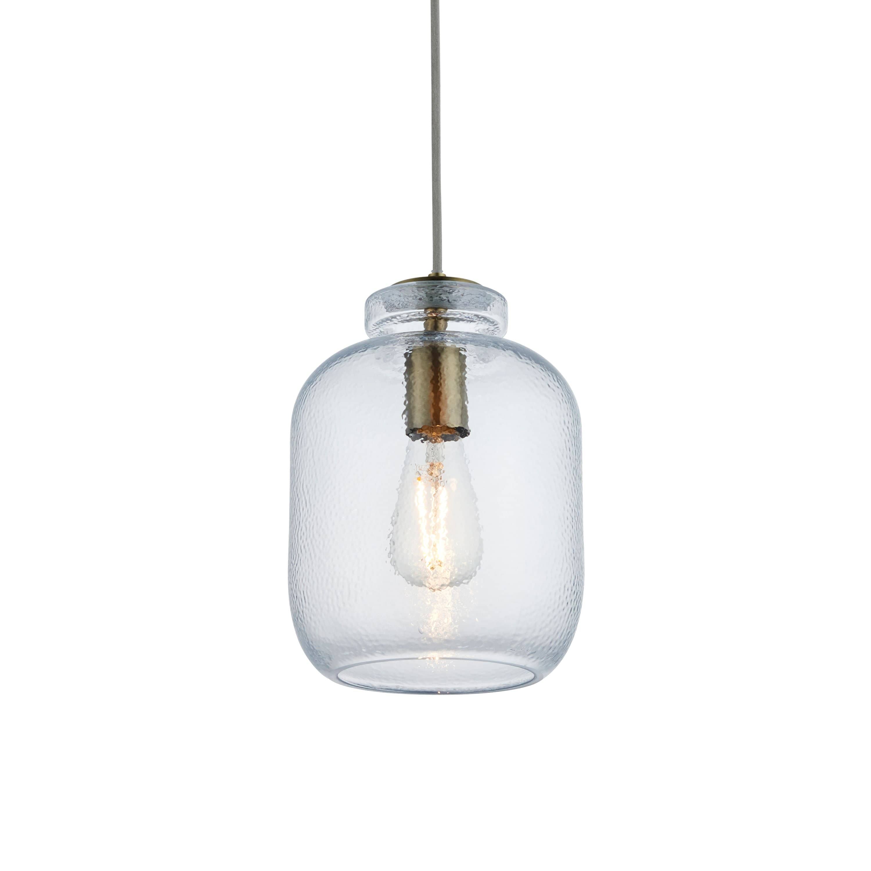 Introducing the Lyra 1 Pendant Light Antique Brass, a stunning addition to any home. This pendant light features clear textured glass and antique brass metalwork, adding character and charm to any space. The natural fabric cable can be adjusted to suspend the pendant at the perfect height, making it ideal for dining tables and living spaces. Complete the look with the matching table light, also available.