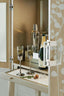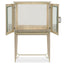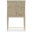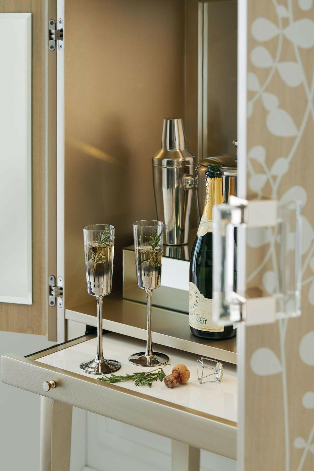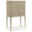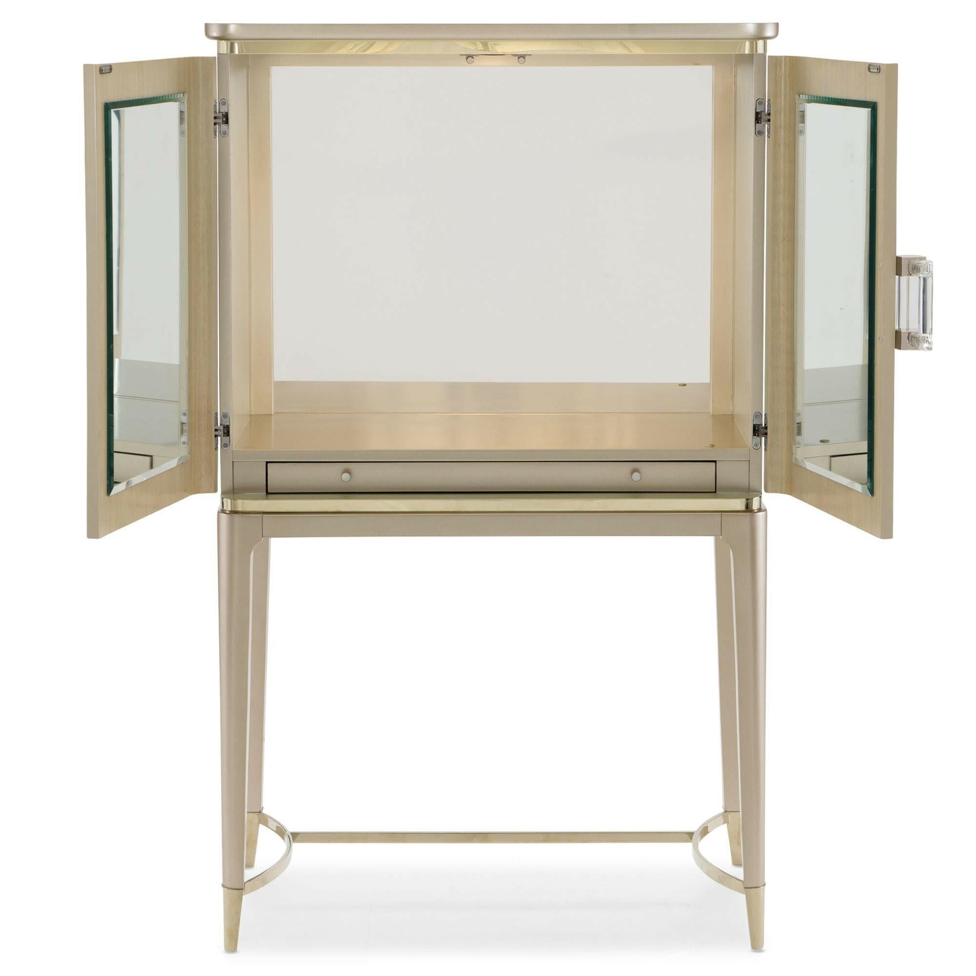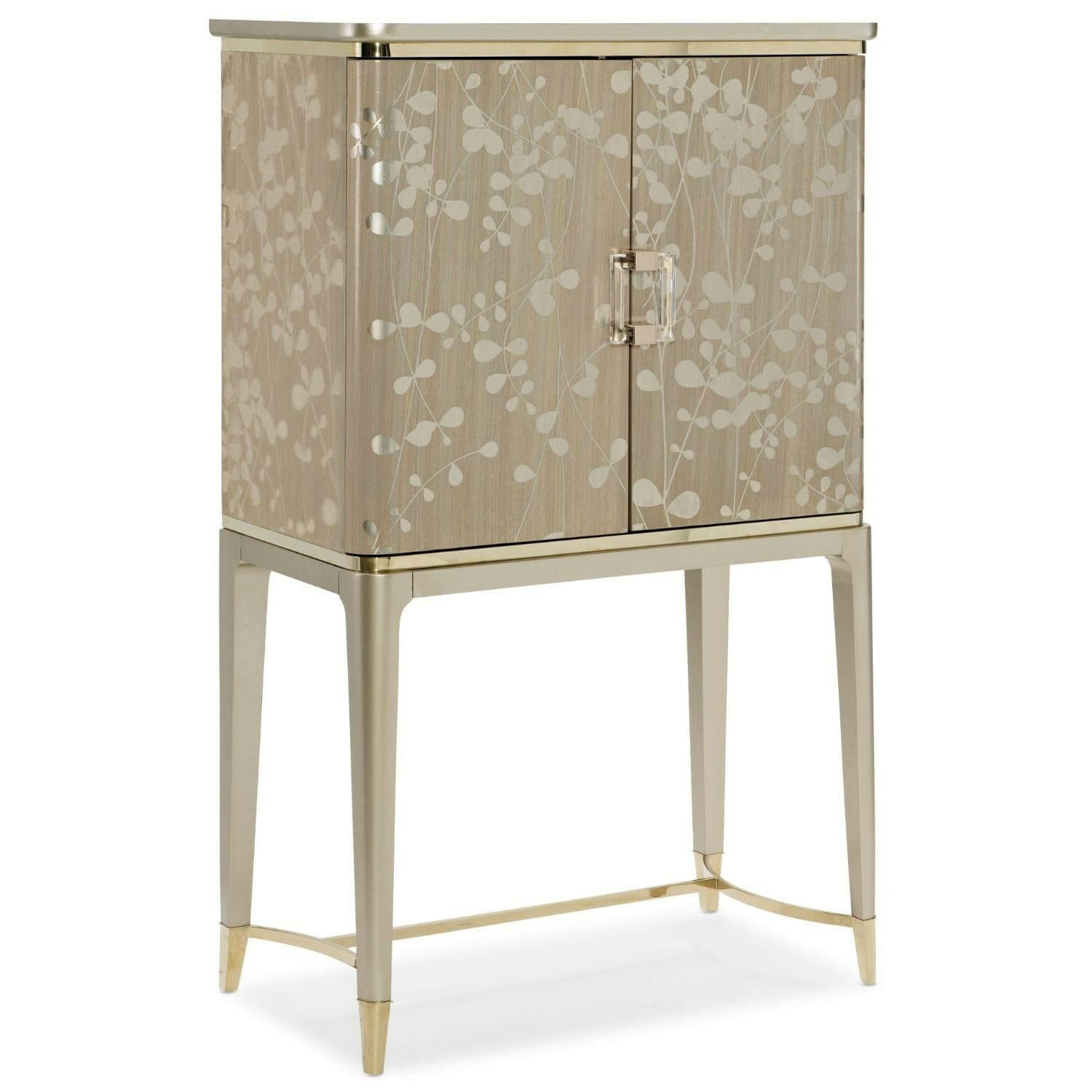 An elegant addition to any space, this softly shimmering gold bar cabinet combines fashion and function. Beautiful enough to create a memorable focal point, its unique design is distinguished by a delicate pattern of intertwining leaves brought to life in a silkscreened design of Champagne Shimmer with Taupe Paint. Inside, you’ll find a glamourous mirrored interior and pull-out shelf with removable serving box that let you host in style. Set upon tall legs in Whisper of Gold, this delightful piece features a rounded stretcher and ferrule-capped legs wearing a brilliant shade of Whisper of Gold. Perfect for refreshing your room or adding functionality to an underutilized nook, this stunning bar leaves a lasting impression. Top and base in Taupe Paint. Case finished in Champagne Shimmer with Taupe Paint silkscreen design Base in Whisper of Gold. Mirrored interior. Pull out shelf and removable interior serving box. Interior in Taupe Paint. Metal ferrules and stretcher in Whisper of Gold.