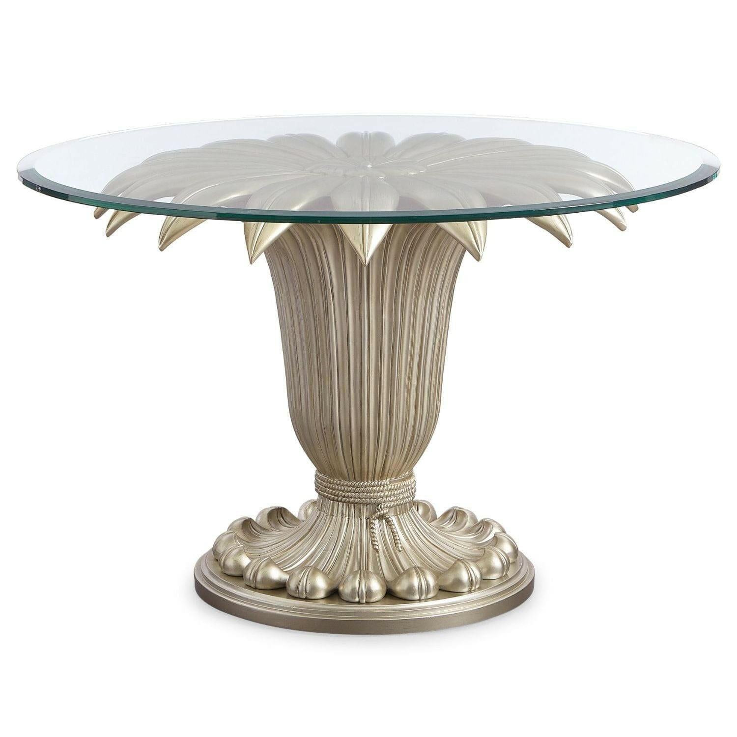 Destined to be the centre of attention, this decadent table redefines the meaning of luxury. Its ornately carved base features a classic leaf motif inspired by tole chandeliers from the Baroque period while an exquisite metallic finish of Champagne Mist highlights the dimensionality of every curve. Topped with a substantial ½-inch glass top with ¾-inch bevel, this 42-inch round table creates a generously sized dining space perfect for family and friends. Look through the glass and you’ll see the incomparable beauty of a classically carved base inspired by antiquity and reimagined for today’s dining room. Table base is cast resin finished in Champagne Mist. 42" round 1/2" tempered glass top with 3/4" bevel.