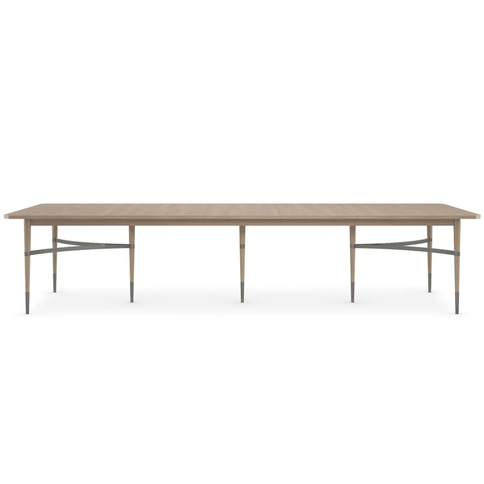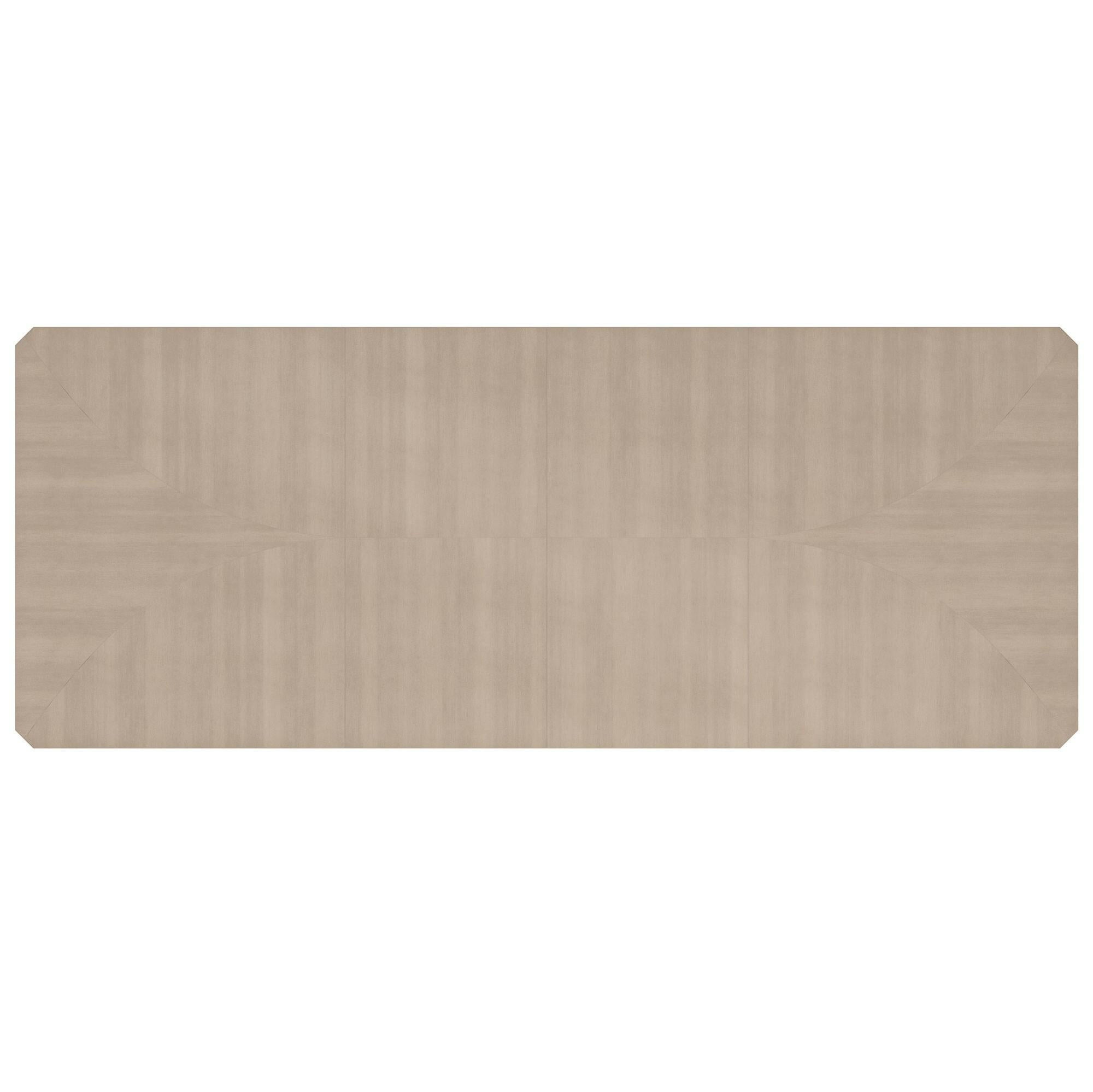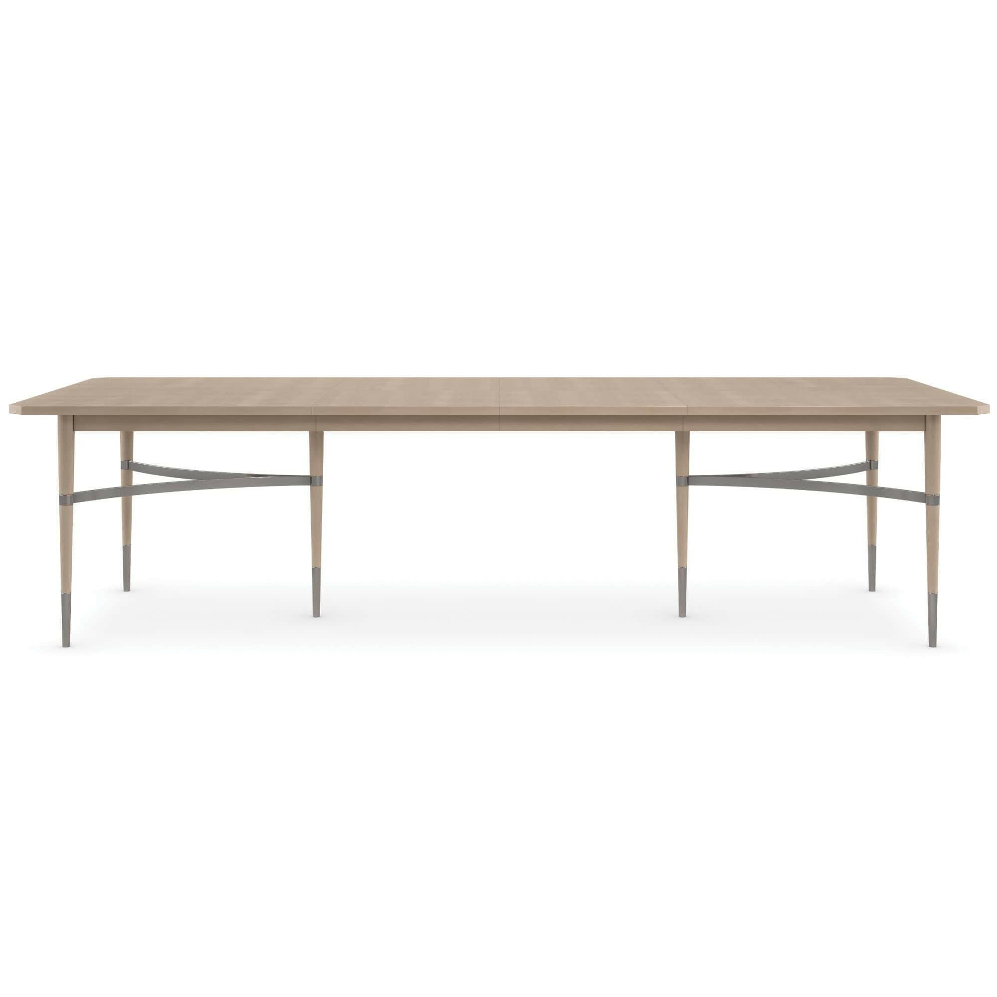 Introducing the Here to Accommodate Dining Table, the perfect solution for hosting large gatherings and unexpected guests. This extension dining table boasts a natural wood grain finish and casual elegance, making it suitable for both entertaining and everyday use. Crafted with slip-matched Japanese Sen veneers, the table features a stunning linear wood grain pattern in a tonal beige finish with undertones of grey. The Deep Bronze metal stretchers and ferrules add a touch of luxury to the design. With three 22-inch leaves, the table extends to a generous 138 inches and can comfortably seat 12 people. A centre leg is included for added support when fully opened. The table top is slip matched Coffee Japanese Sen in Woodland Gray, while the metal stretcher and ferrules are in Deep Bronze and the table legs and aprons are in Woodland Gray.