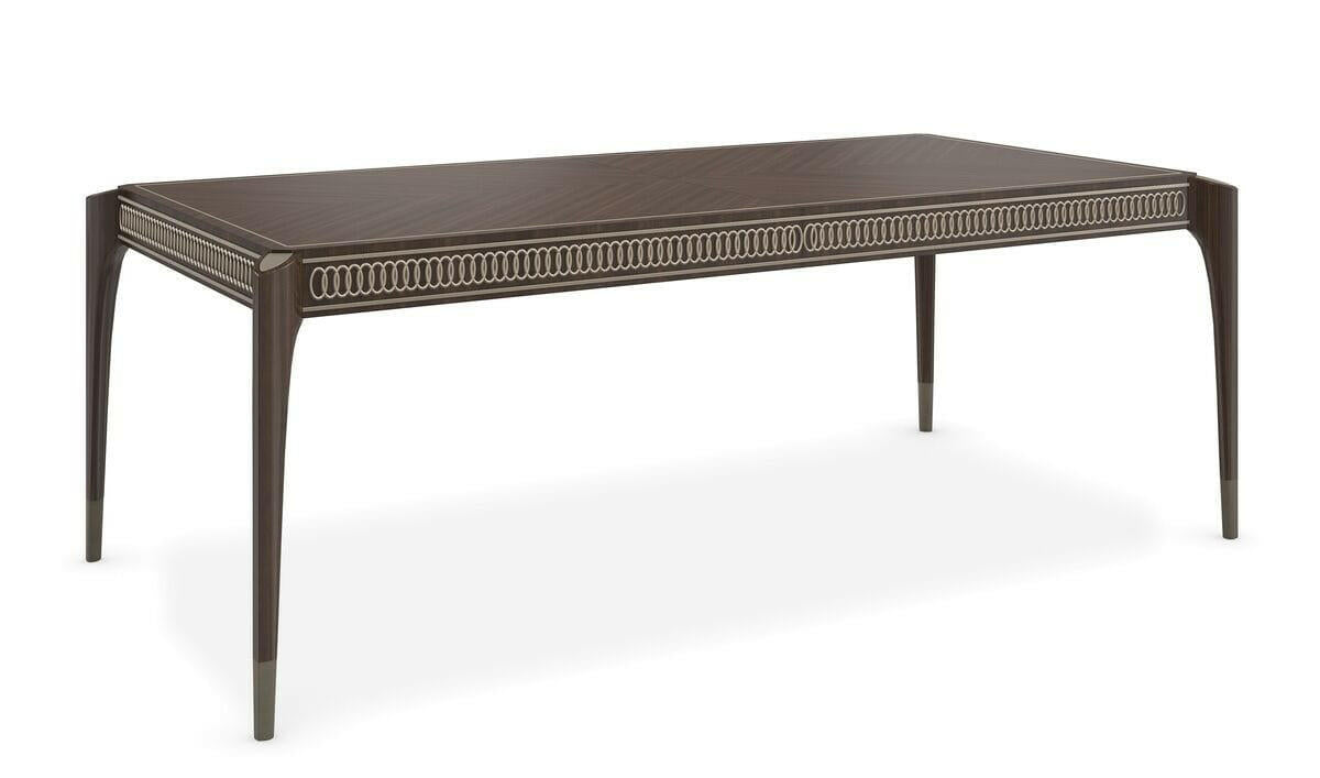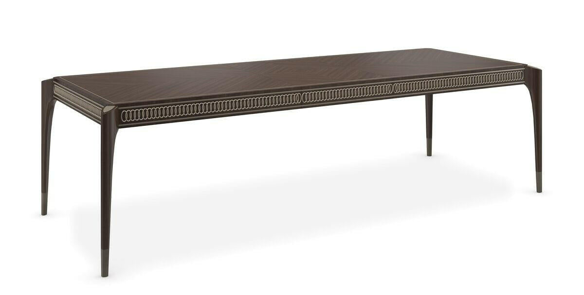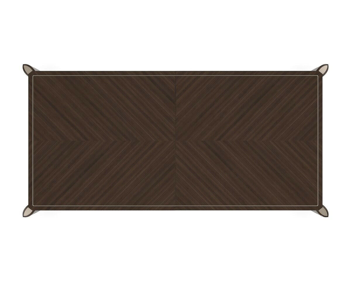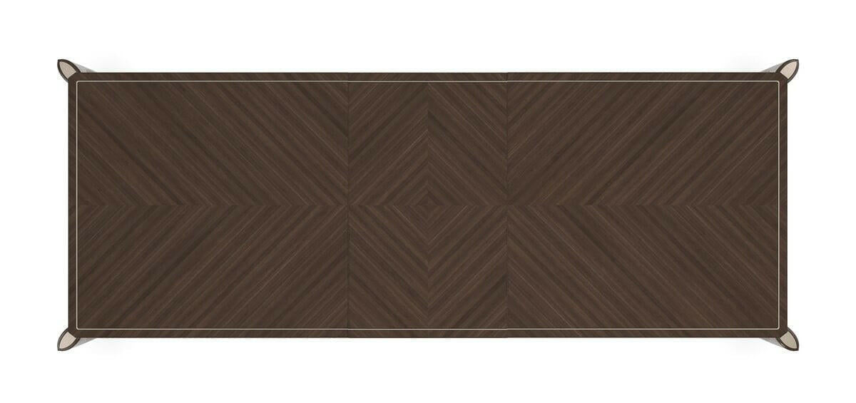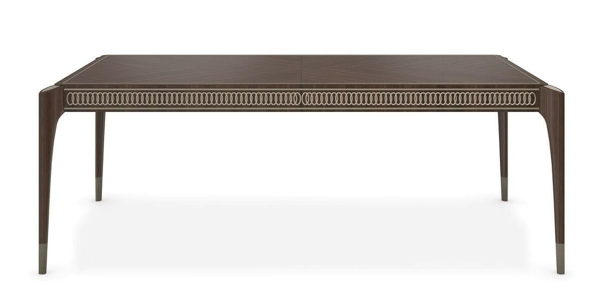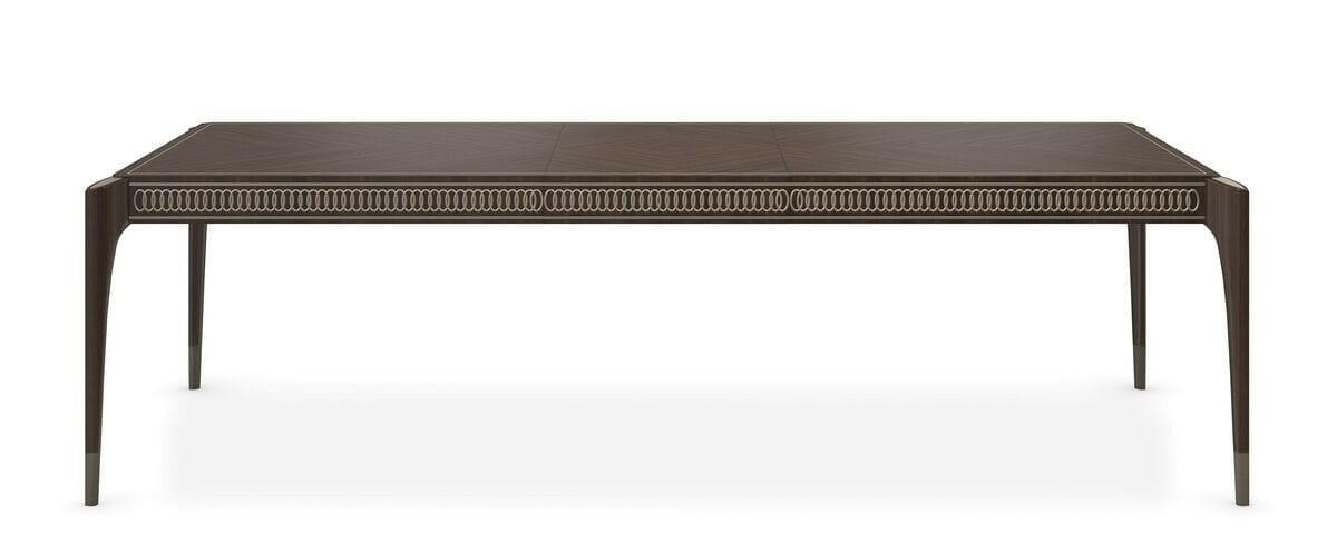 Rich Stallion stain finish emphasizes the Sapele grained veneer top in a mirrored book-match layup creating a stunning surface pattern. The apron has carved interlocking rings finished in Afterglow to create bracelet-like trim around the table. Tall tapered conical legs have a Pyrite painted ferrule and silkscreen top medallion on the exposed bevel cut legs. Top in Stallion. Legs in Stallion stain with top posts in Afterglow. Bottom leg posts in Pyrite. Apron carving in Afterglow. Table extends to 139. 5 inches with 2 -24 inch leaves. Table seats 12 when fully extended. Center leg for stability when fully extended. Table ships KD.