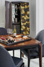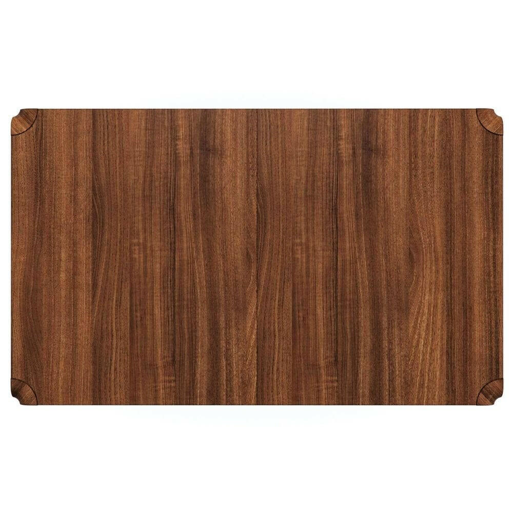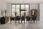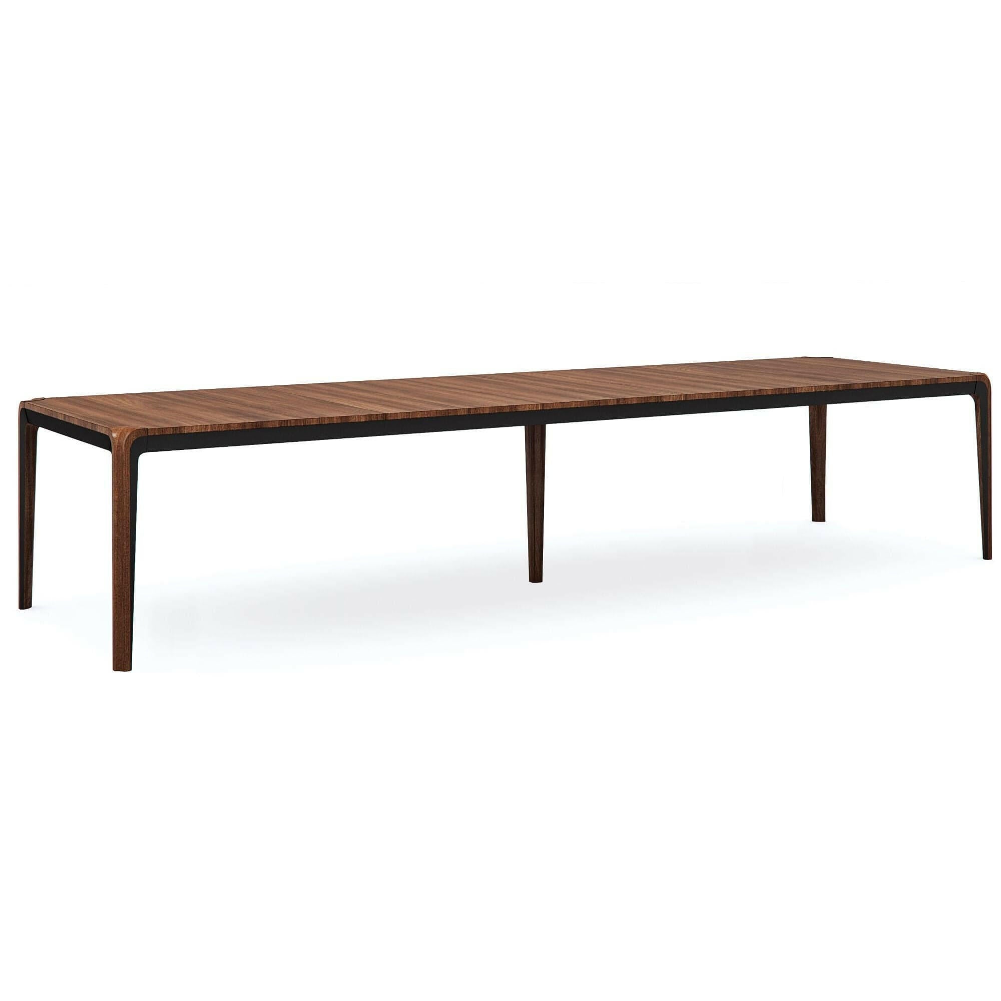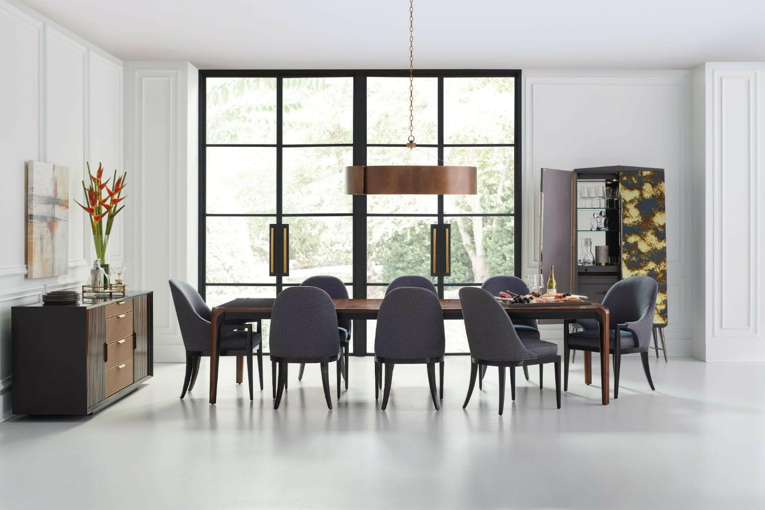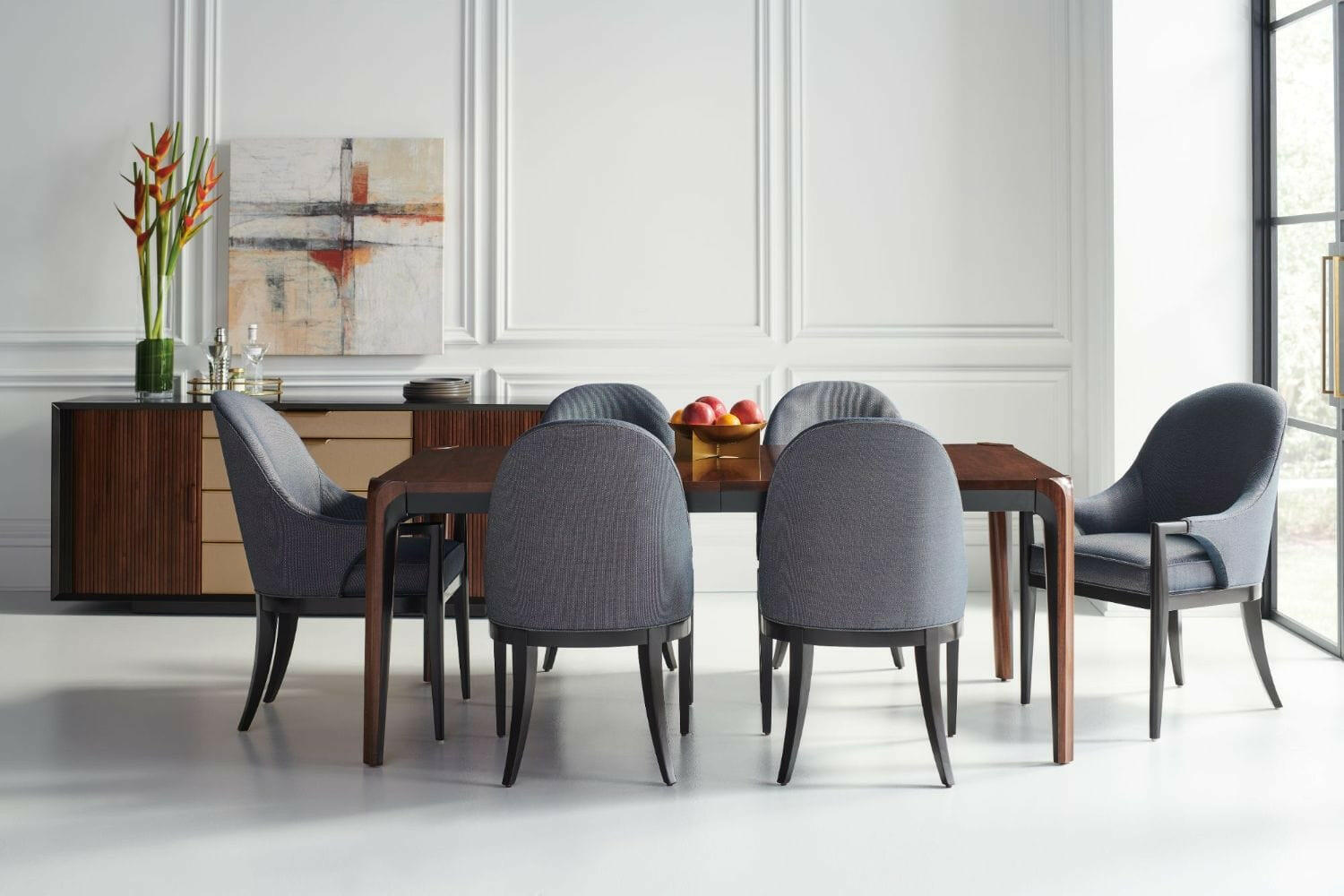 There’s always room for more with this extension dining table, evoking a balance between refined simplicity and modern functionality. Highlighting the intricate wood grain, the tabletop is finished in Rich Walnut with mitered edges in Dark Chocolate. Tapered legs, also trimmed in Dark Chocolate, appear to flow from the tabletop like a waterfall. Comfortably seats 8 without leaves, and seats 14 when fully expanded with three leaves. Table finished in Rich Walnut with Dark Chocolate accents. Table extends to 145 in with (3) 24 in leaves. Center leg support for stability when using leaves.