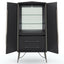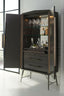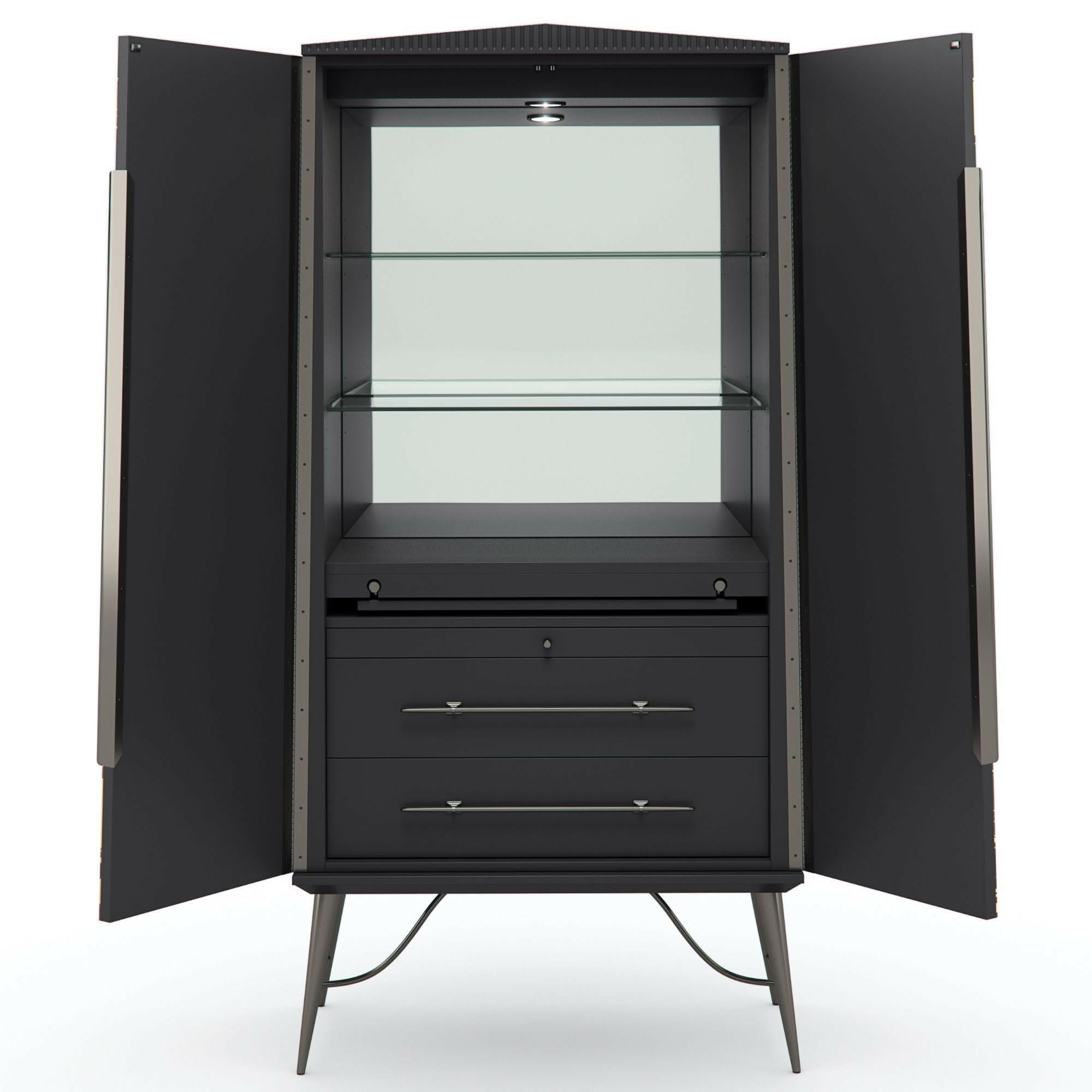 But this cabinet is not just about looks. It also offers practicality with its mirrored, lit interior and ample storage space. The interior features adjustable glass shelves, drawers for linens and mixing tools, and a stone bottom shelf. The center even has a removable tray for easy beverage mixing and serving. The case is finished in Warm Slate, while the metal base is in Deep Bronze, creating a beautiful contrast.