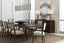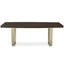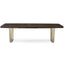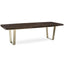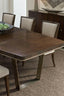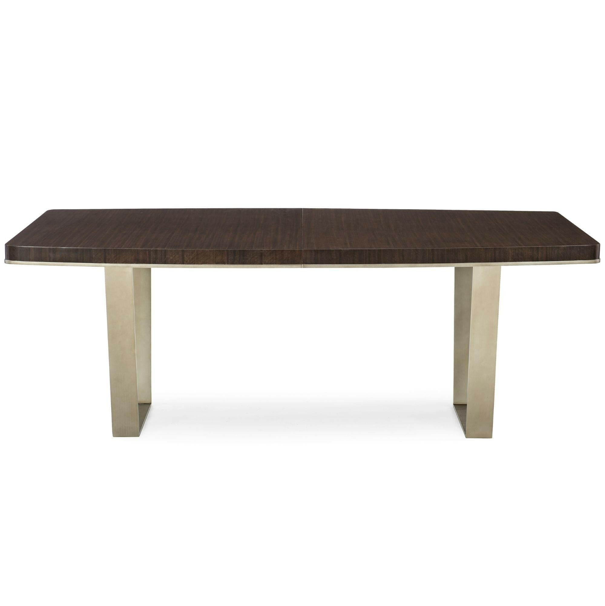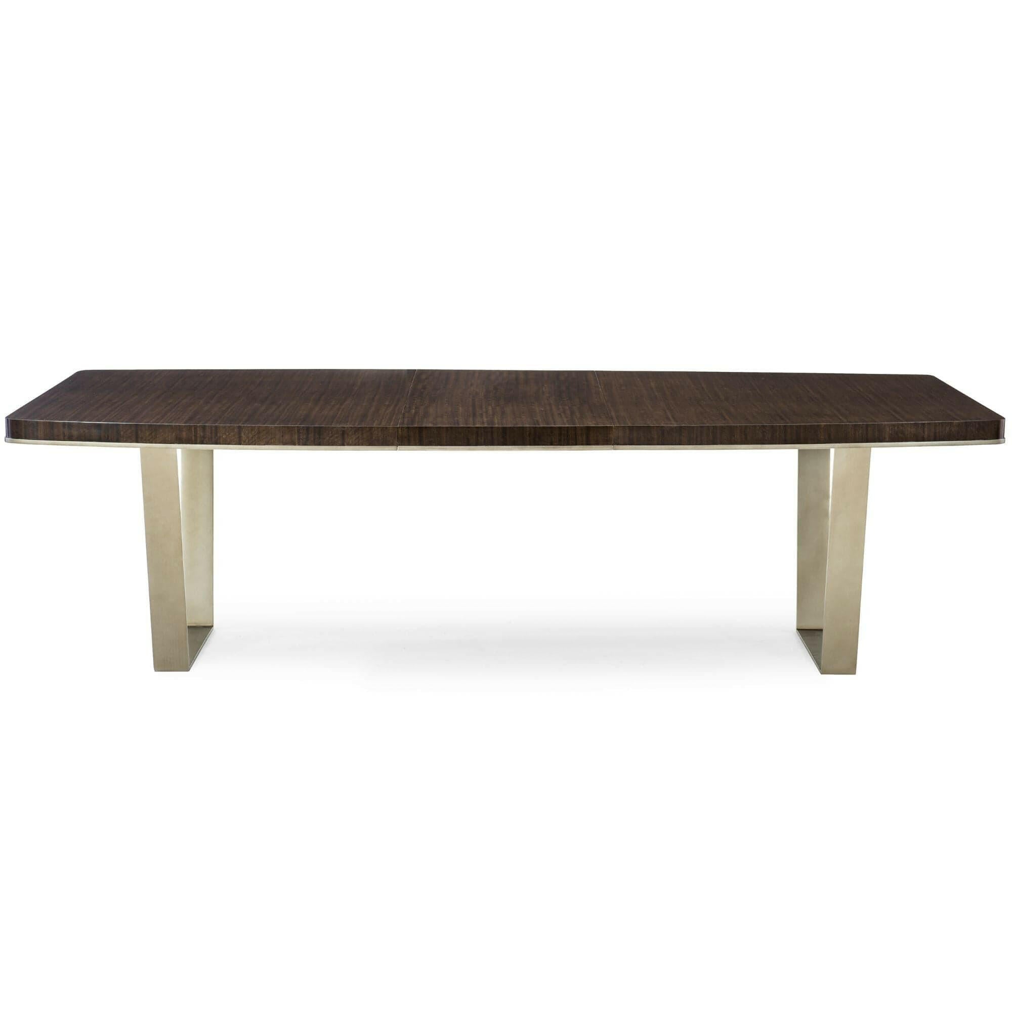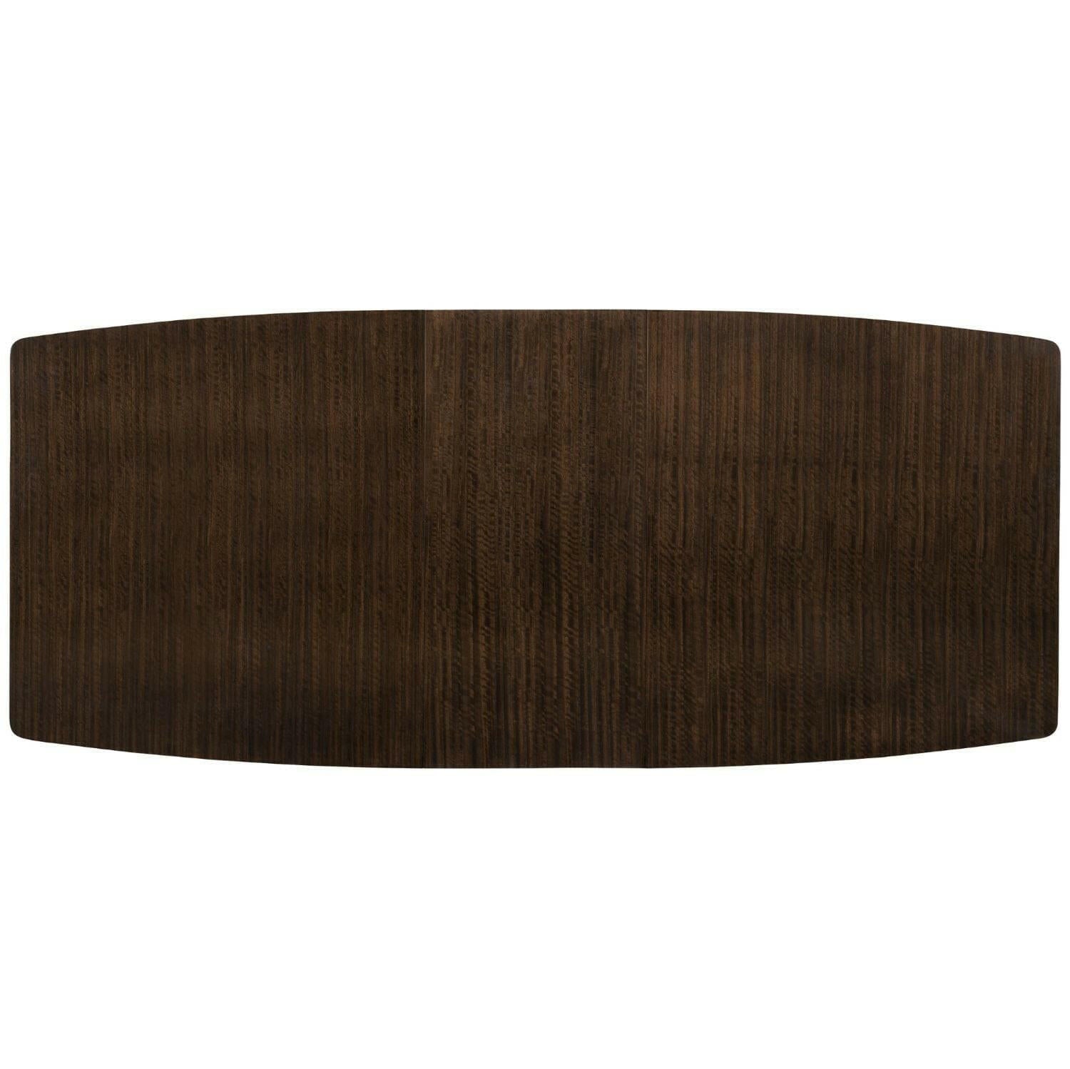 The memorable grain of fumed figured eucalyptus comes to life atop a dining table that is suspended by angled, contemporary metal braces. The wood’s Aged Bourbon finish results in a commanding presence that can be expanded to easily seat 10 people. The accent moulding is showcased in a band of Smoked Bronze that matches the sculptural metallic legs. The rounded rectangular shape of this table encourages conversation over a great meal. Table top and aprons in Aged Bourbon with accent moulding on aprons in Smoked Bronze. Trestle frame is metal in Smoked Bronze. Table extends to 104" with one 22" leaf. Ships KD.
